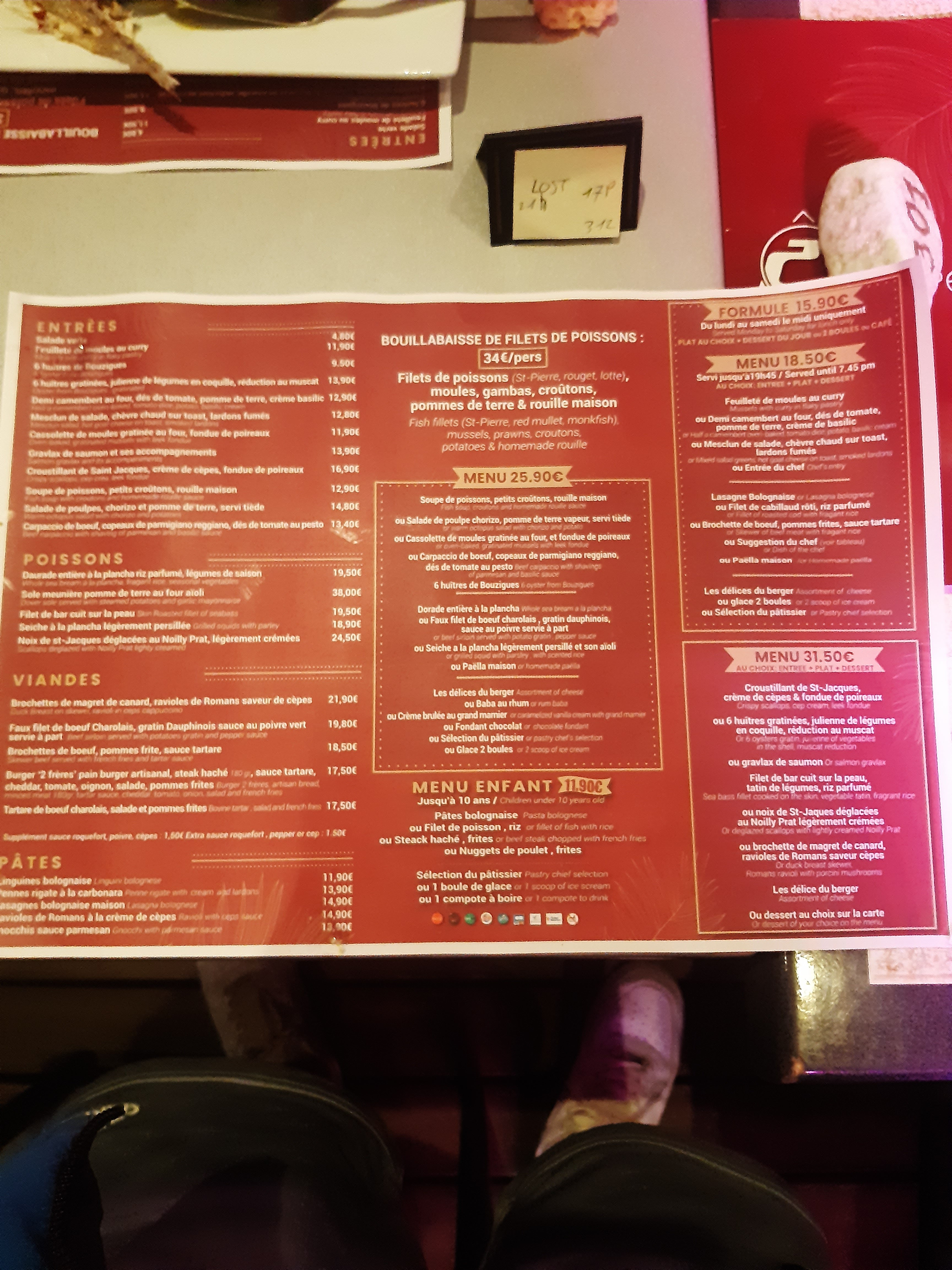 Arnaque!!!!! Réservé le jour même vers 18h pour manger à 20h00, nous arrivons à peine devant le resto qu un gars nous barre le chemin en disant oui: traduction ==>vous voulez quoi? Je lui dis que j ai réservé, il vas regarder sur son cahier et paff il ne reviens même pas, après la petite serveuse qui m à fait la réservation est venue et nous a installé. Au bout d'un quart d heure d attente on nous renvoie la même personne avec les menus (et pendant ce temps plein de clients arrivent et sont servis avant nous...bref). Au moment de la commande nous choisissons le menu à 15,90€ qui était mis sur un grand tableau à l entrée du resto? Et là, la bonne nouvelle tombe désolé mais ce menu n est servi que jusqu'à 19h45 bien sûr pas indiqué à l extérieur sur leur tableau, donc on choisi celui à 20,90€.Ma femme prend des huîtres gratinées et quand le plat arrive les huîtres étaient natures, le petit jeune les reprend pour les gratiner (c était bien marqué sur leur carnet ainsi que le double du ticket collé sur notre table ) et là, la chef de salle arrive et nous explique que pour les gratiner il fallait prendre le menu à 25,90€ et rajoute une couche comme quoi nous avions certainement mal lu le menu ....bref on en reste là, j emmène ma petite au toilettes et il n y avait plus de papier, je demande à une serveuse....plus aucun signal, donc je me suis débrouillé avec un mouchoir qu une cliente à eu la gentillesse de me donner. Arrivé au dessert, on demande à la serveuse les desserts compris dans nos menus puisque nous ne savons pas décoder leur menu, donc ma femme a pris une tarte tatin, arrivé en caisse, la chef de salle nous indique qu il y avait 1,50€ de supplément pour cette tarte. Ils prennent vraiment les gens pour des pigeons. Aucun sourire, tous le personnel était sous tension y compris le patron qui nous a accueilli, je ne recommanderai pas cet endroit, c est la première fois que je vois ces agissements moyenâgeux. c'est dommage pour eux puisqu'ils sont tellement bien situé qu'ils ont même pas besoin d'utiliser la ruse pour extorquer de l'argent à leurs clients.