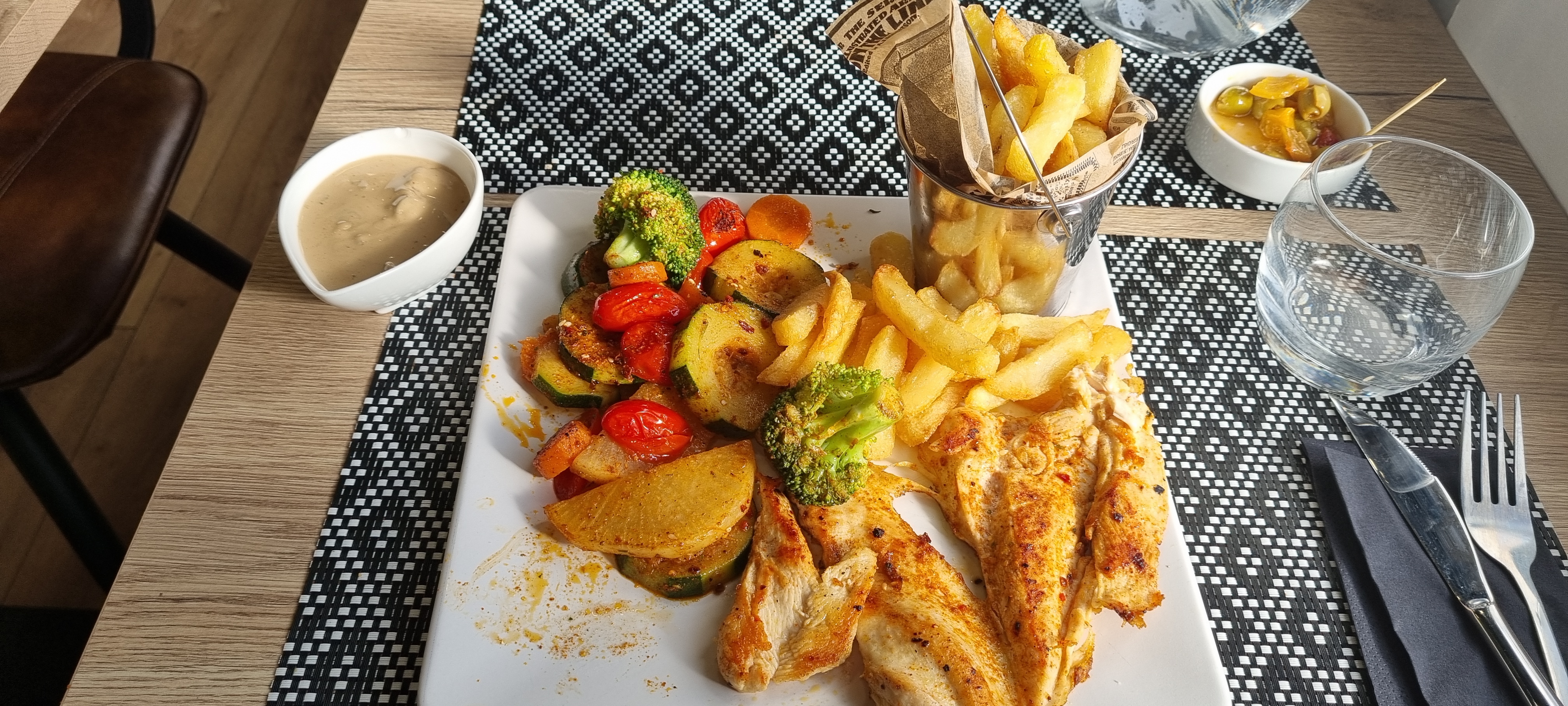 Personnel au top. Cuisine grave bon et propre portion copieuse . J'ai prix brochette poulet frites sauce champignon ainsi que pomme de terre grenaille entrecôte et leur dessert baklawa une tuerie je recommande .
