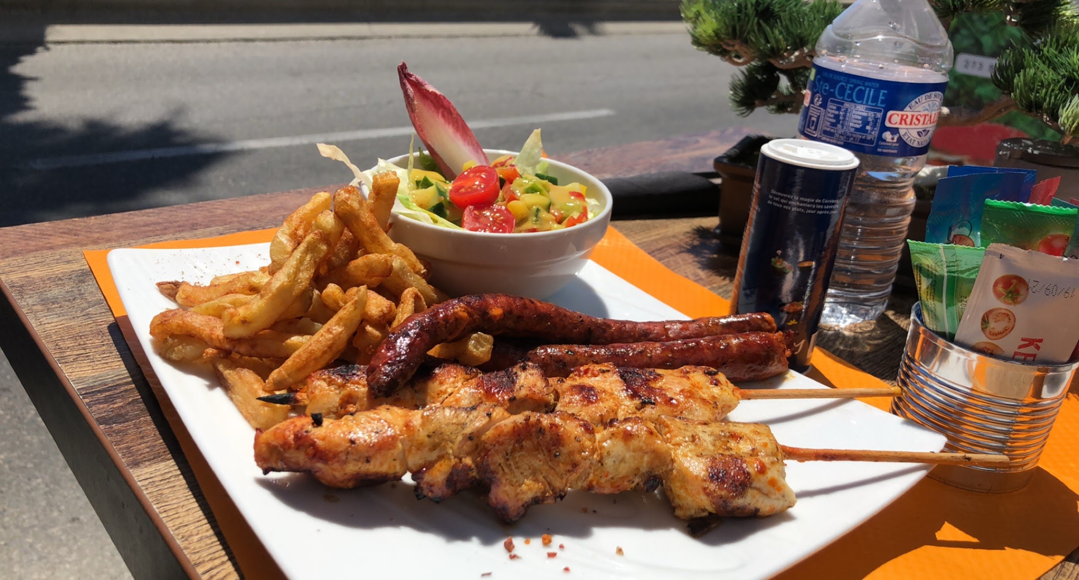 Brochettes marinées délicieuses et frites maison, très belle assiette!! Rapport qualité prix excellent!! Personnel très souriant et accueillant. Terrasse extérieure très agréable je recommande vivement