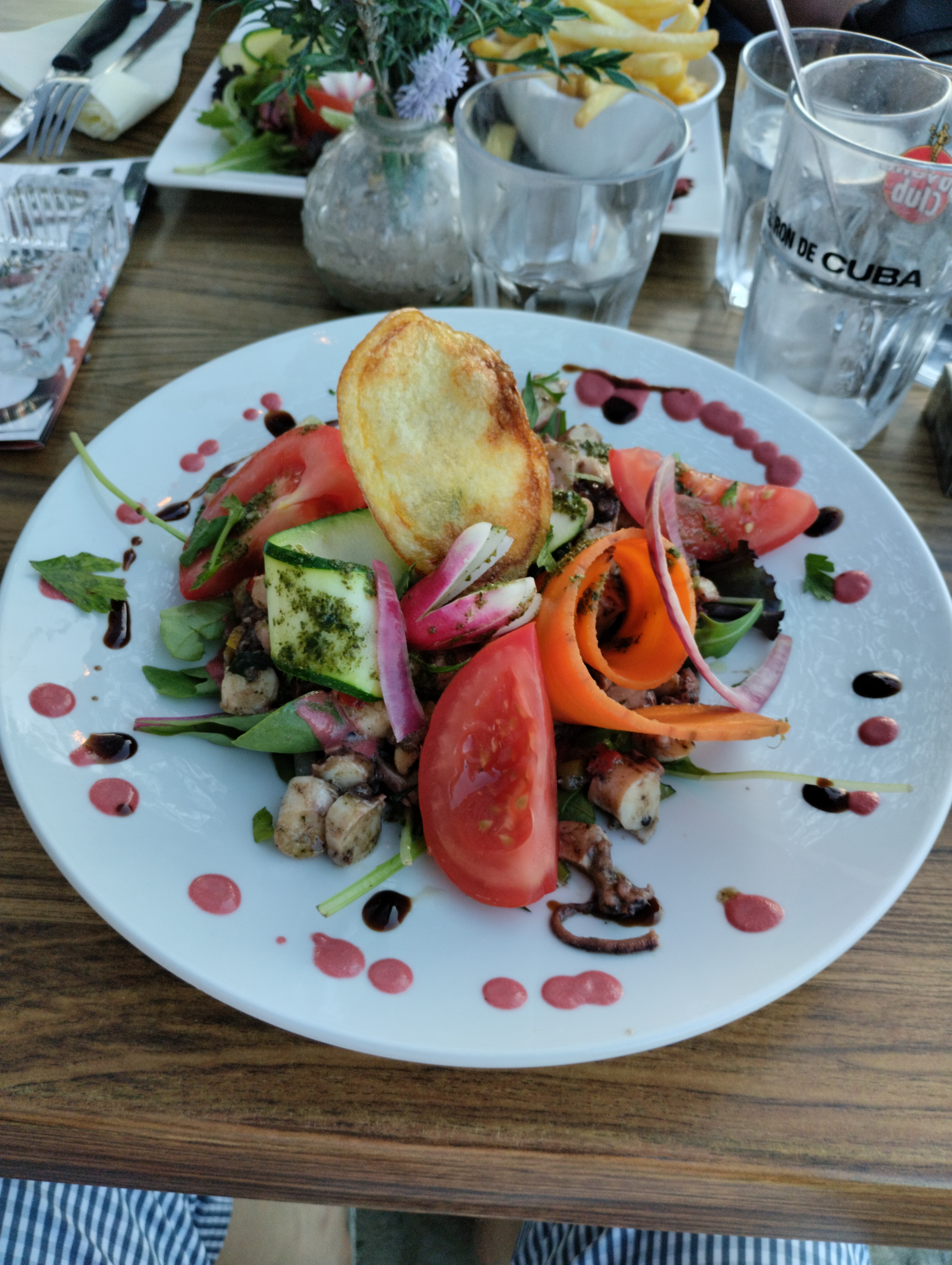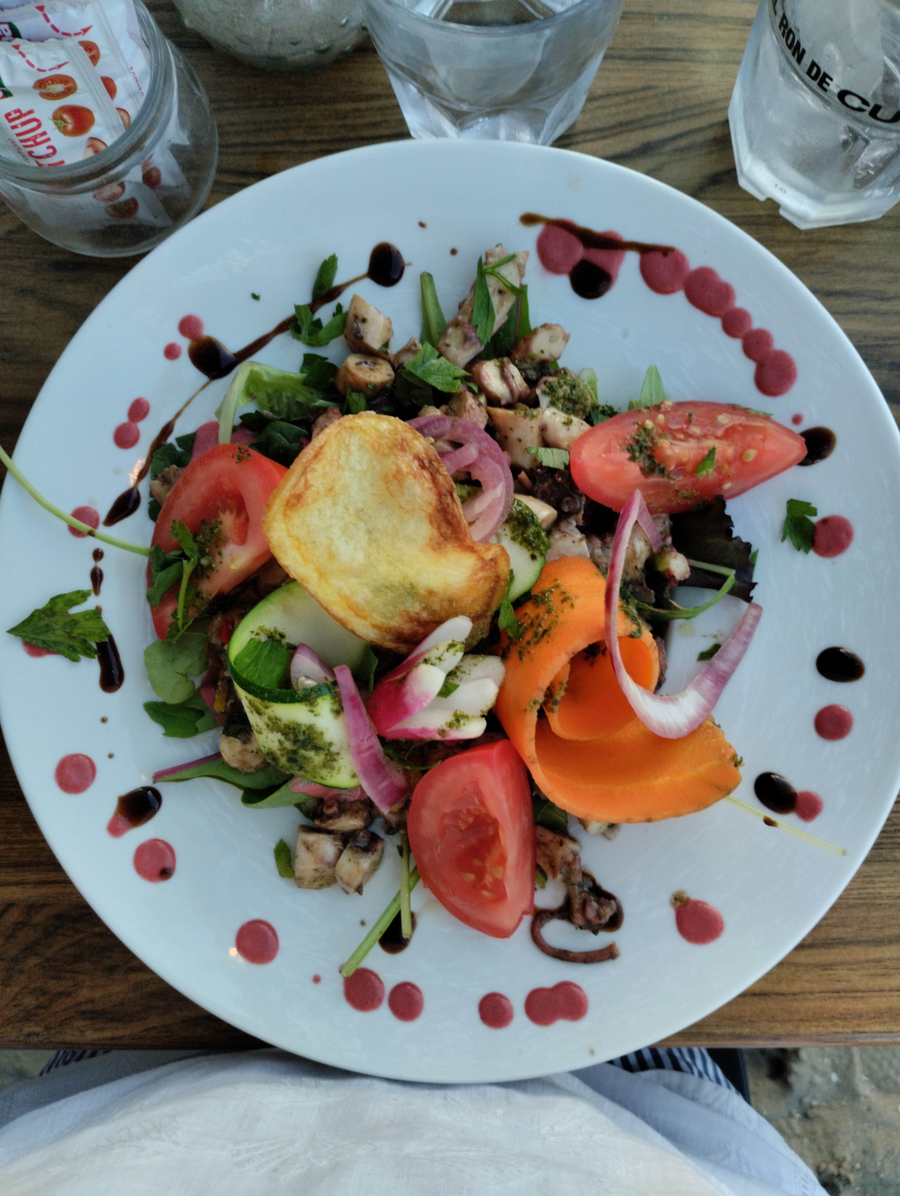 Lieu sympa sur la plage équipe sympa Repas de qualité moyenne poulpe mal cuit
