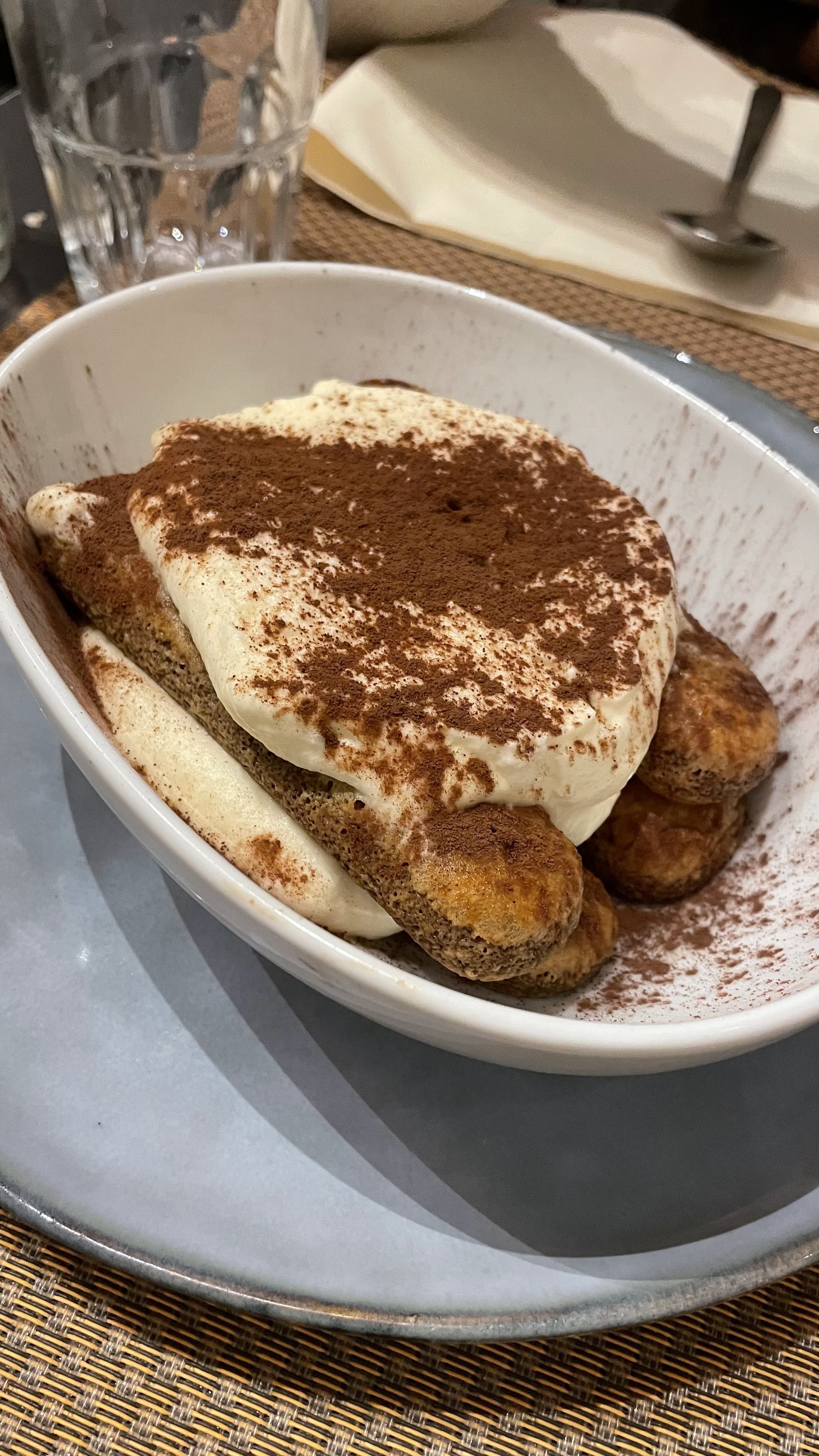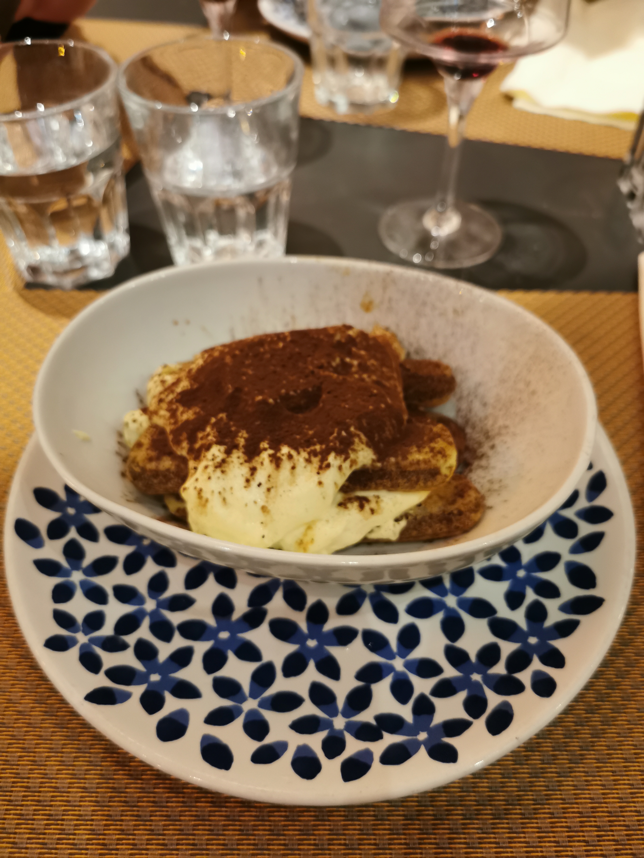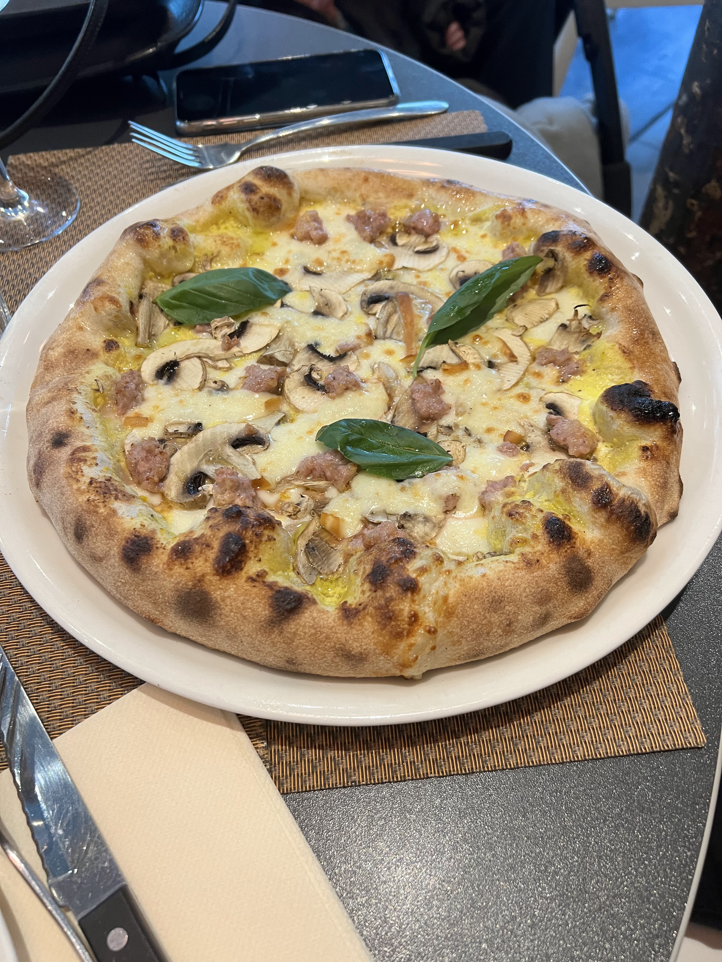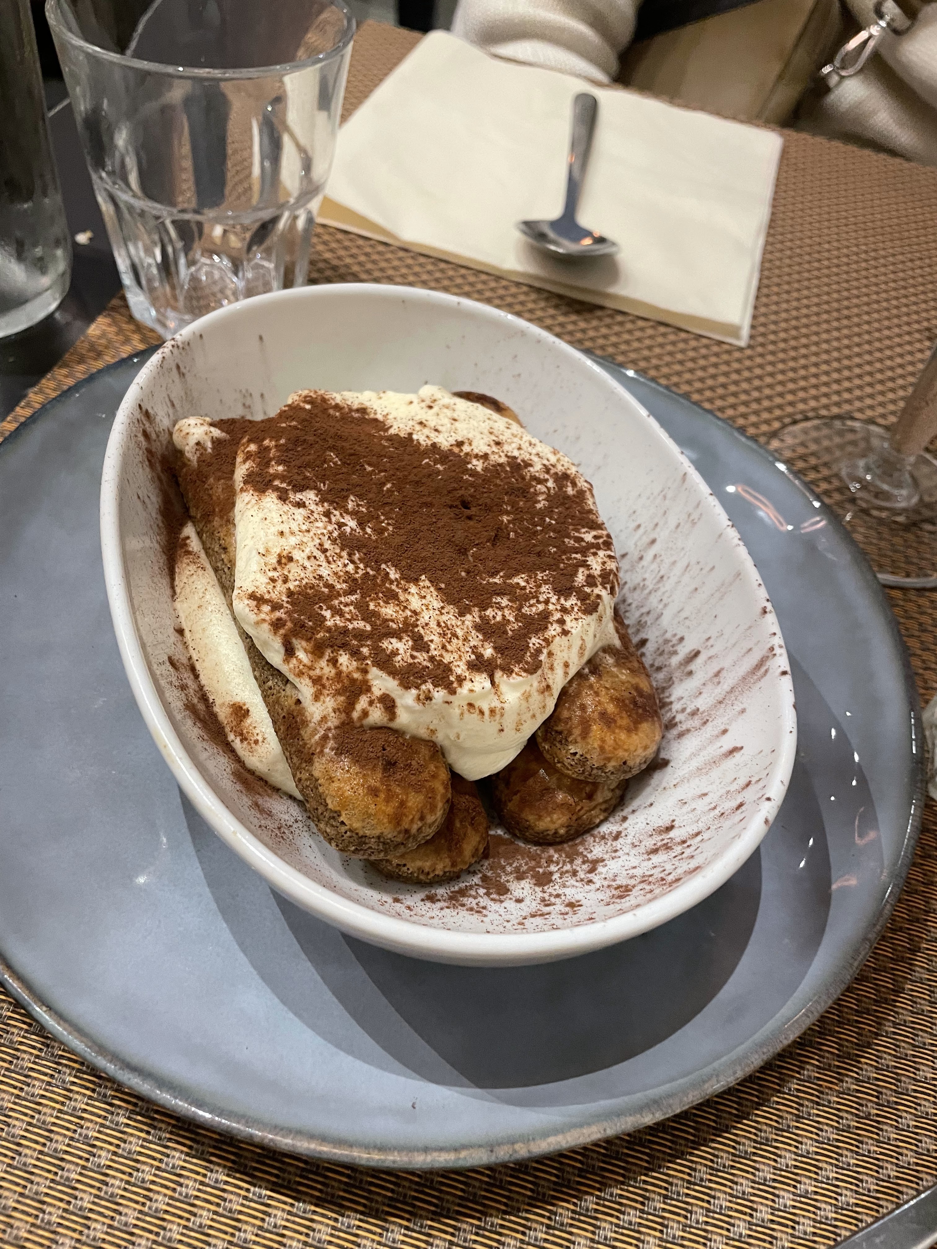 Excellente pizza végétarienne 🍕 ! La pâte à pizza est vraiment très bonne, fine, moelleuse et la croûte est croustillante. Les pâtes carbonara sont bonnes mais rien d’exceptionnel, je vous recommande les mafaldines à la crème de champignons. C’est la spécialité de la maison avec un flambage dans une meule de Parmigiano Reggiano ! Je recommande fortement Le tiramisu ! Il est riche et oncteux, c’est un dessert à partager il était délicieux !
