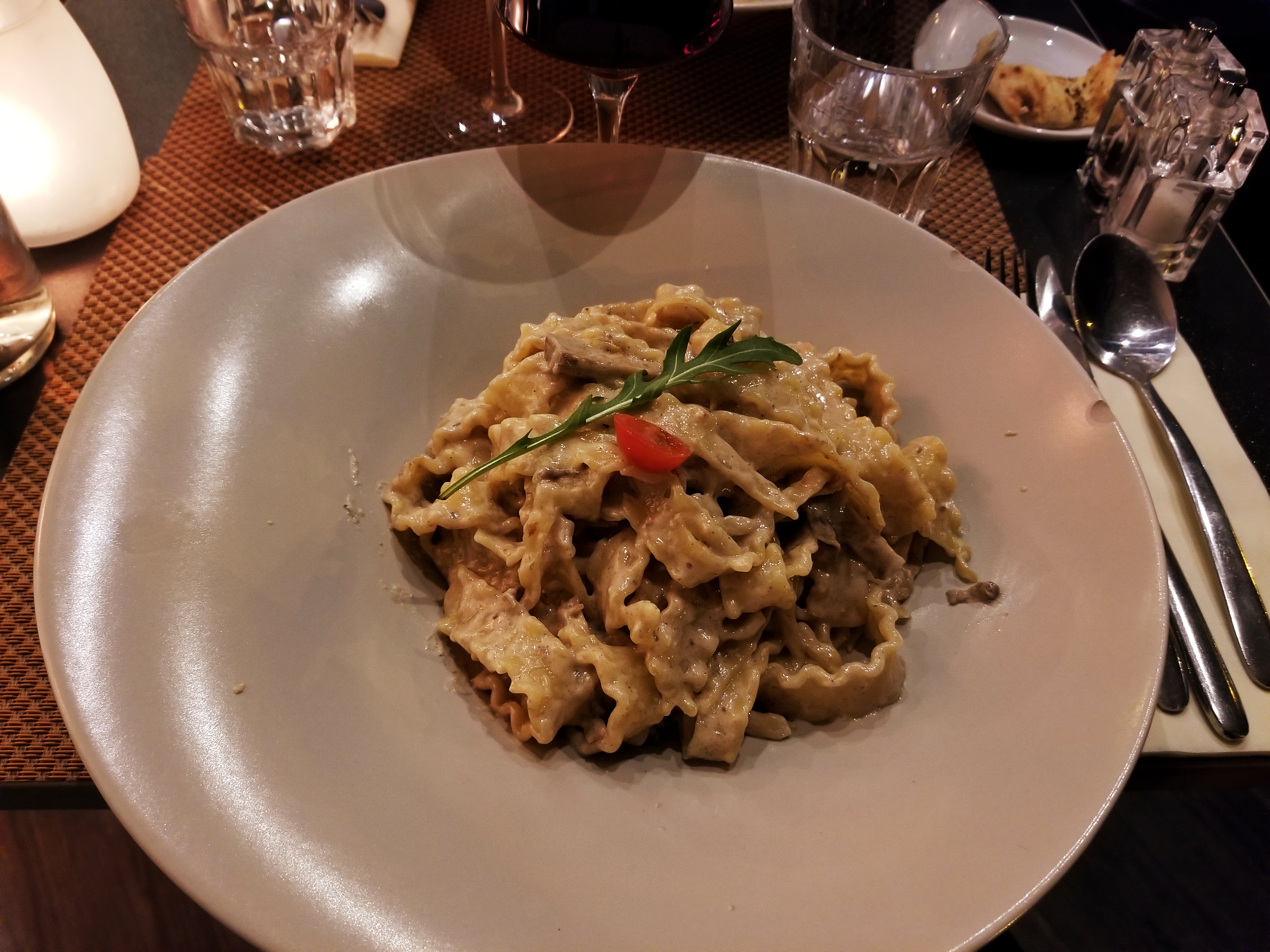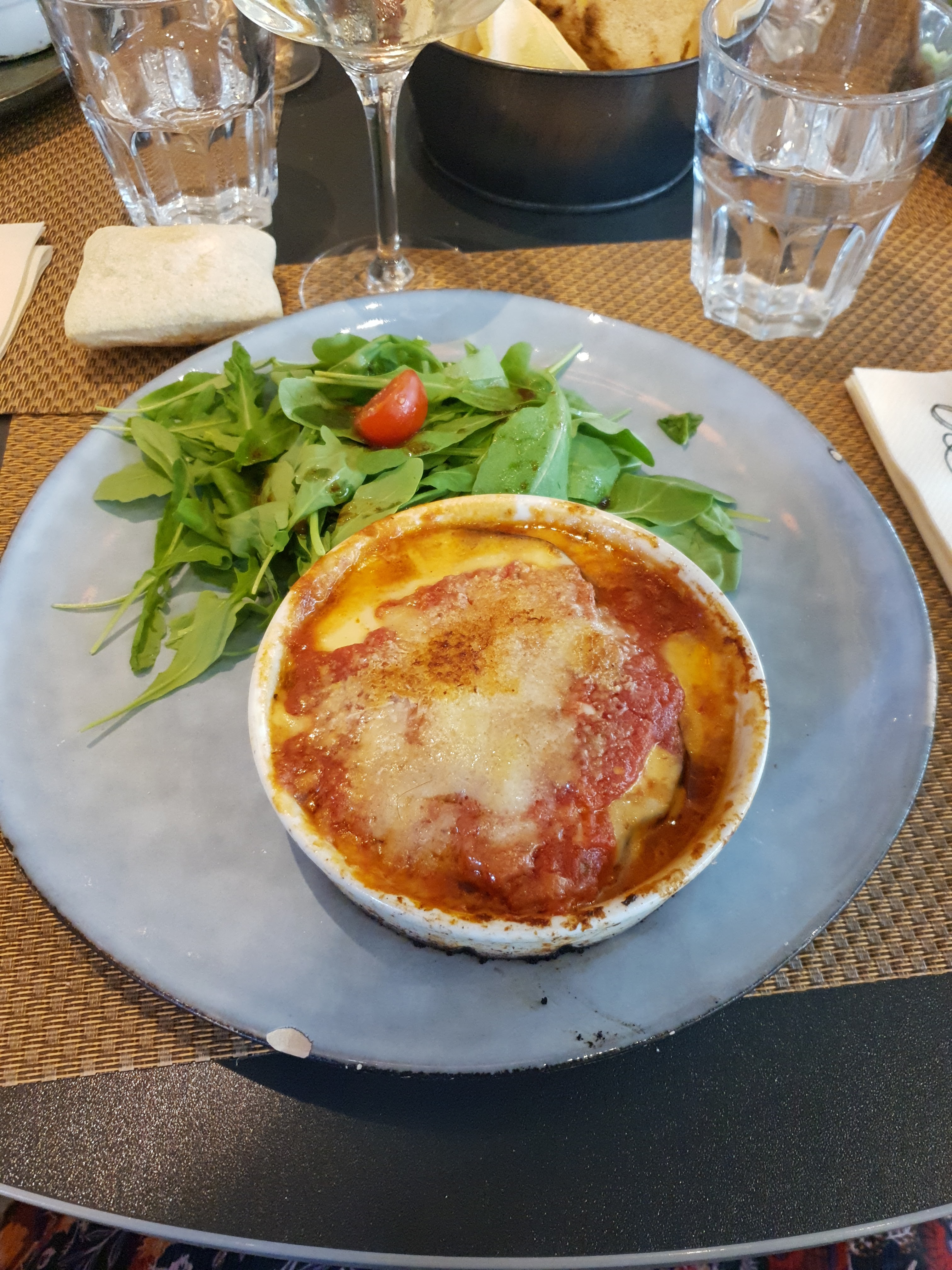 Très bonne cuisine italienne : on a pris la spécialité des pâtes cuites dans la meule de parmesan, délicieux ! Seule remarque : faire chauffer les assiettes pour que les pâtes restent chaudes plus longtemps. On reviendra.