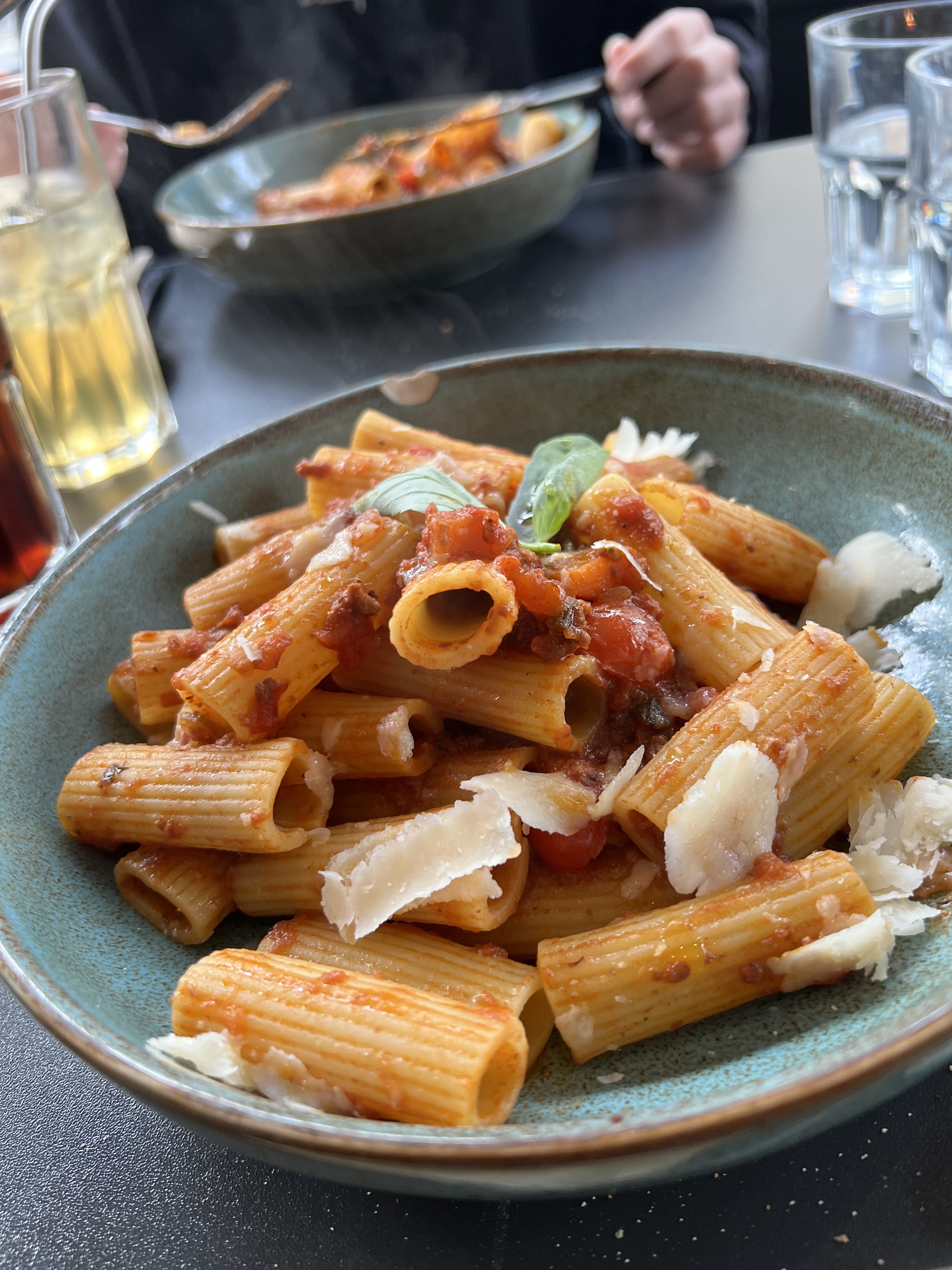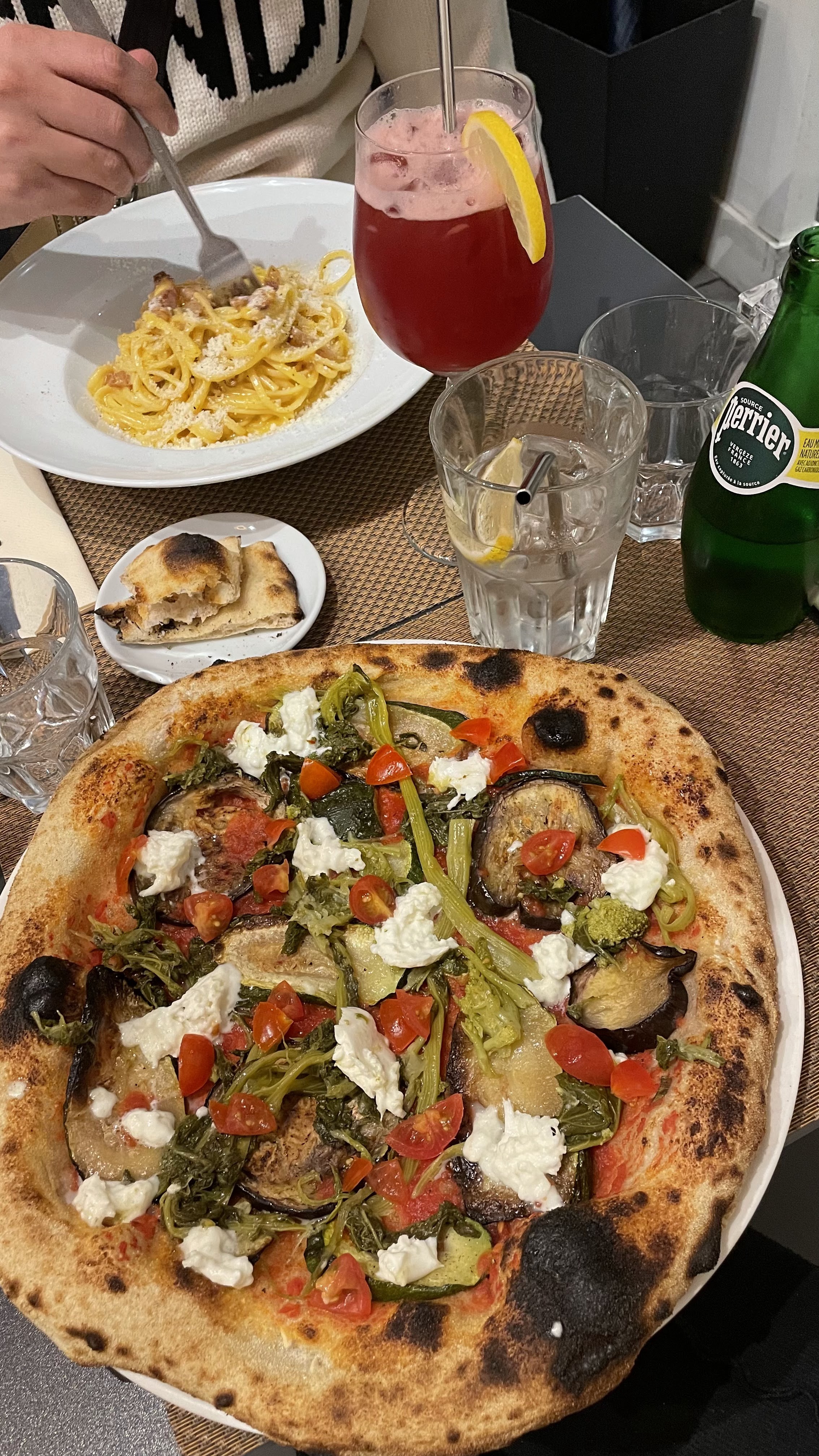 Très belle découverte, j'ai adoré le principe de la mini pizza ou du mini plat de pâtes pour 10e. Cela permet de gouter à plus de choses sans avoir à manger pour 4. J'ai donc pris une carbonara qui était très bonne, avec un bon goût fumé et une mini pizza Diavola dont la pâte était comme j'aime, croustillante et moelleuse. La prochaine fois, je prendrai la spécialité, des pâtes donc la sauce est faite avec du parmesan flambé devant nous directement dans la tome.