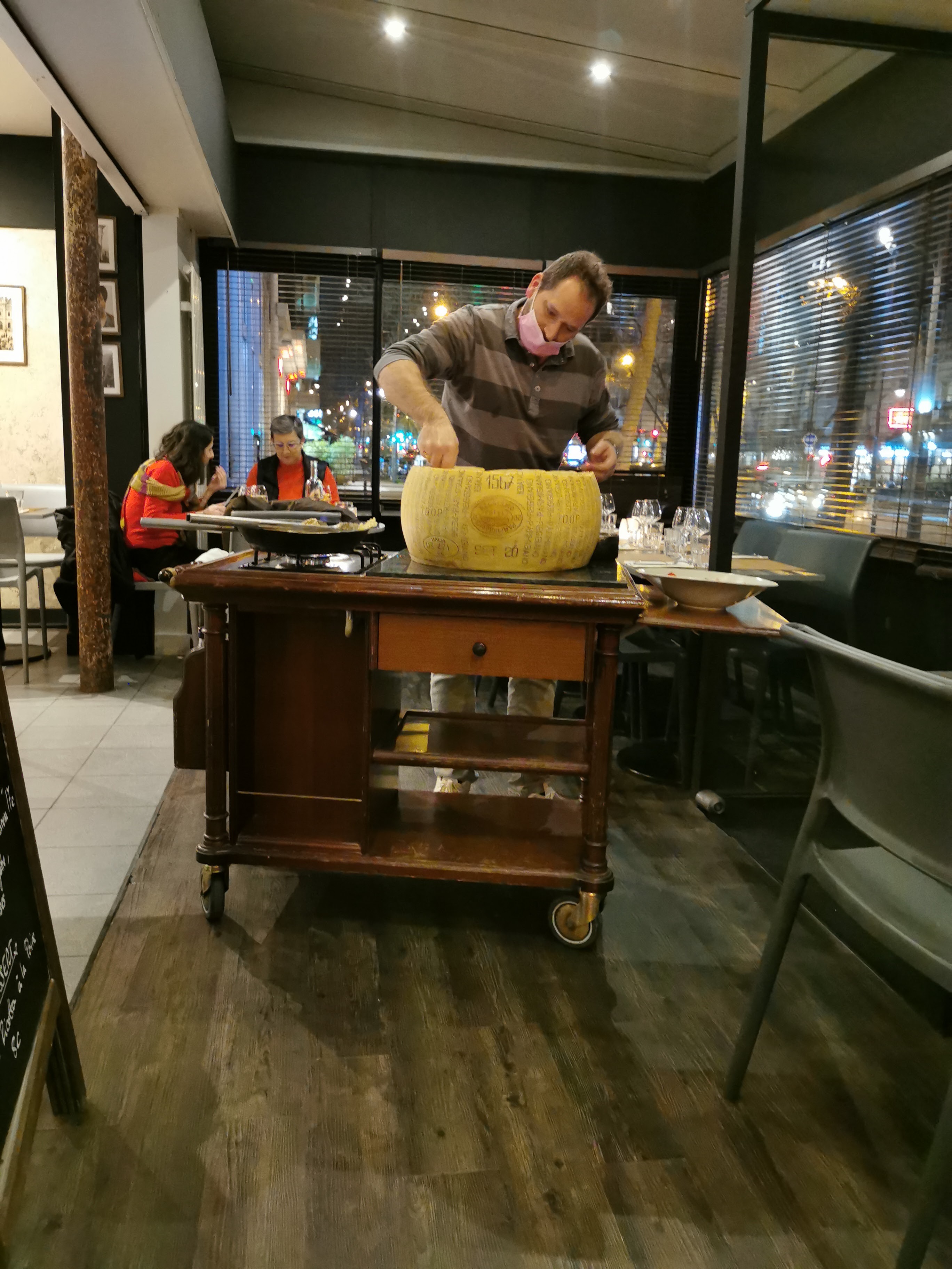 Un restaurant incontournable qui mérite largement sa réputation ! L’accueil est adorable et chaleureux, le service efficace et sympathique, les plats délicieux. Je me suis régalée tant visuellement que gustativement avec la spécialité de la maison, des pâtes flambées dans une meule de parmesan, en direct devant vous. C’est un vrai show et c’est un délice. Seul bémol : j’ai trouvé les portions un peu justes, j’avais un petit creux en sortant du restaurant, après un plat de pâtes et une soupe de fraises en dessert (j’ai cependant un bon appétit). N’hésitez pas à prendre une entrée si vous êtes gourmands :) Pour deux personnes, avec plat, dessert, une bouteille de Negroamaro et quatre digestifs, nous en avons eu pour 90€. Le rapport qualité-prix est excellent. Le restaurant était complet ce samedi, pensez à réserver.