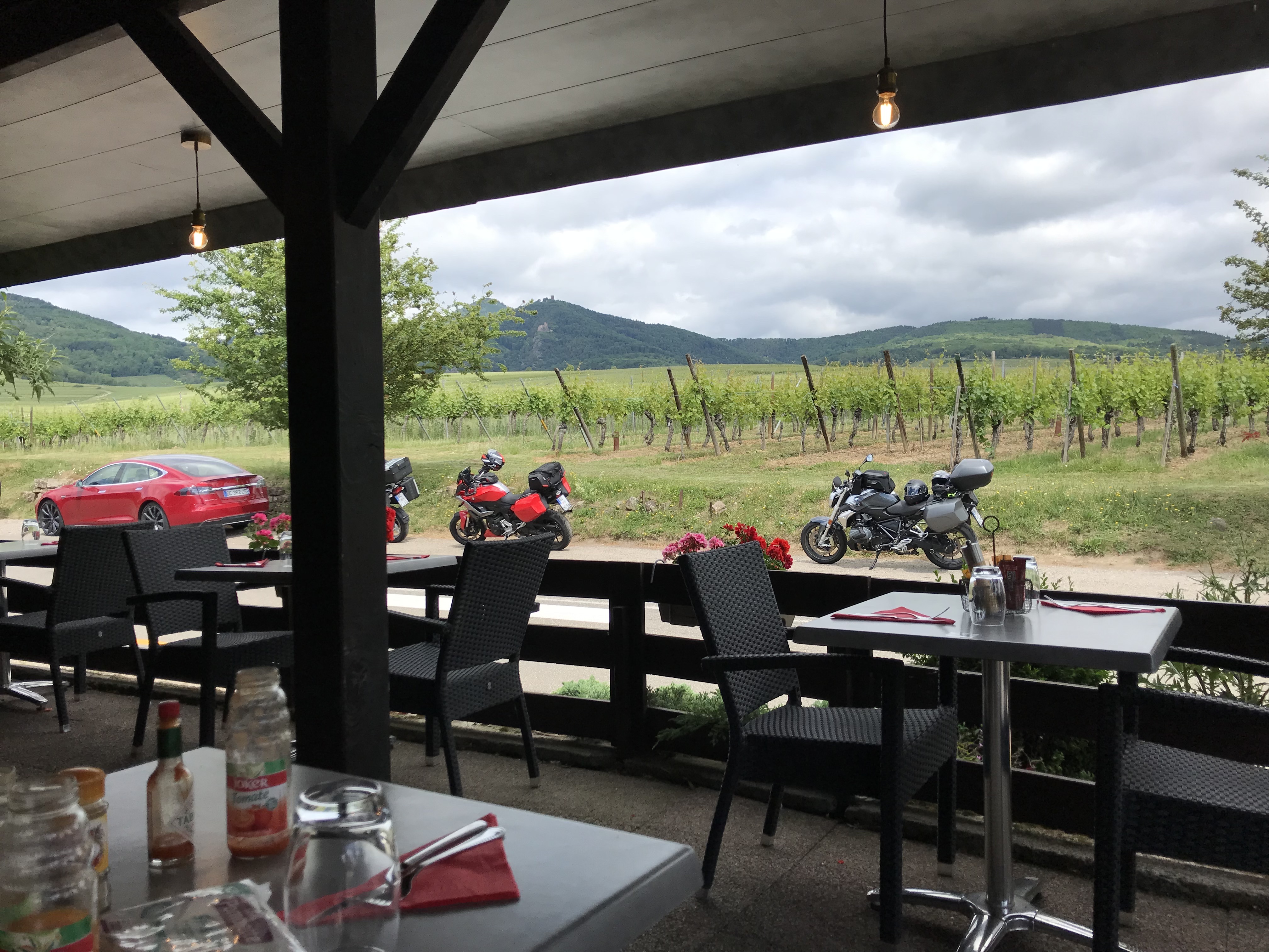 Terrasse plutôt agréable avec vue sur les vignes, mais au bord de la route. Service moyen mais nous sommes venus à l'heure du rush donc beaucoup de personnes à servir au même moment. Les tartes flambées ne sont pas dignes des tartes flambées alsaciennes, elles ne sont pas cuites au feu de bois et beaucoup trop de crème dessus.
