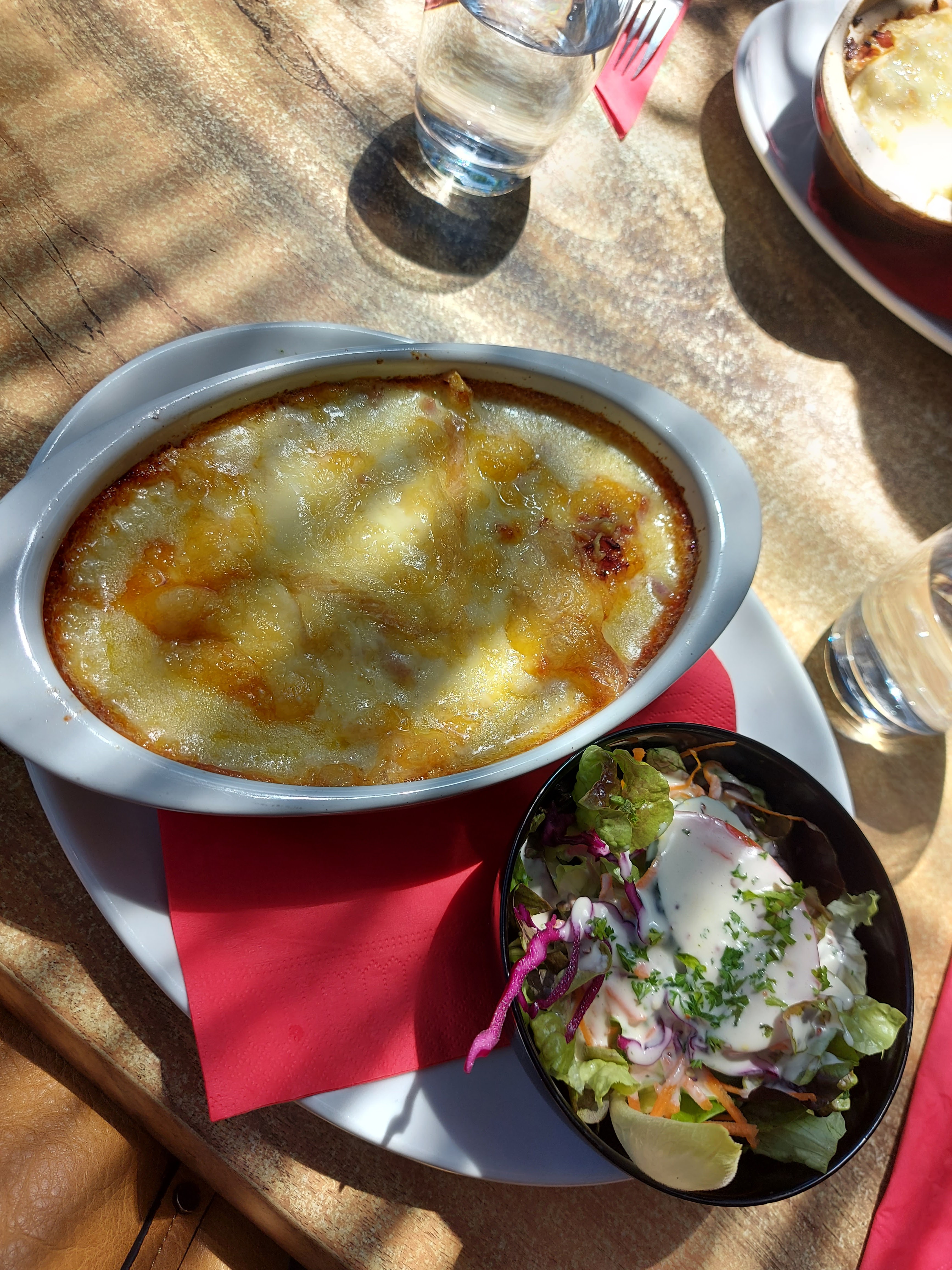 En terrasse sous le soleil, bon repas servi par une serveuse au top. Belle carte variée. Et les cigognes qui passent vous dire bonjour 😊.