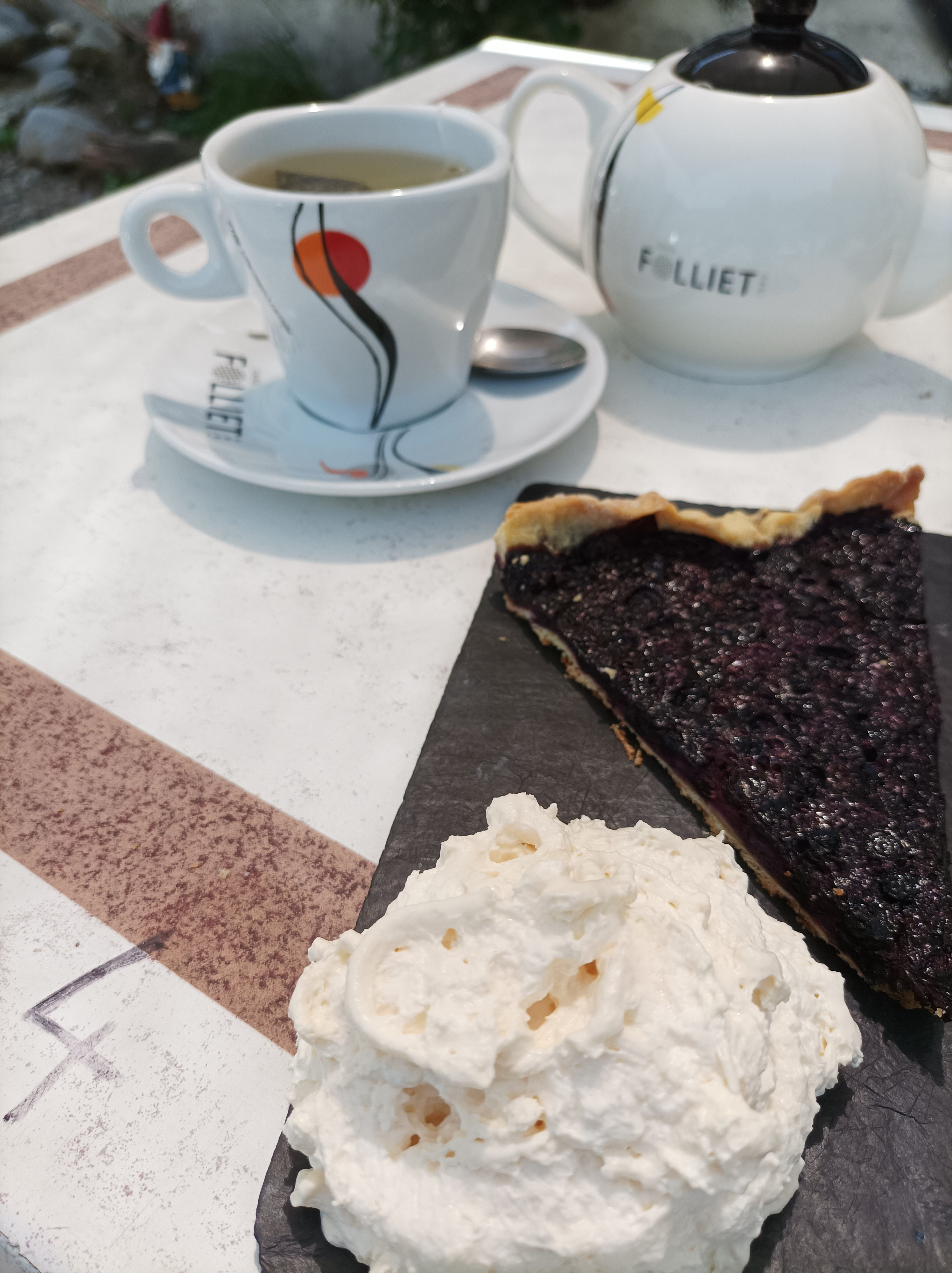 Petite pause exceptionnelle dans un cadre exceptionnel. Patron très sympa. On s'est tout simplement régalé avec cette tarte aux myrtilles.