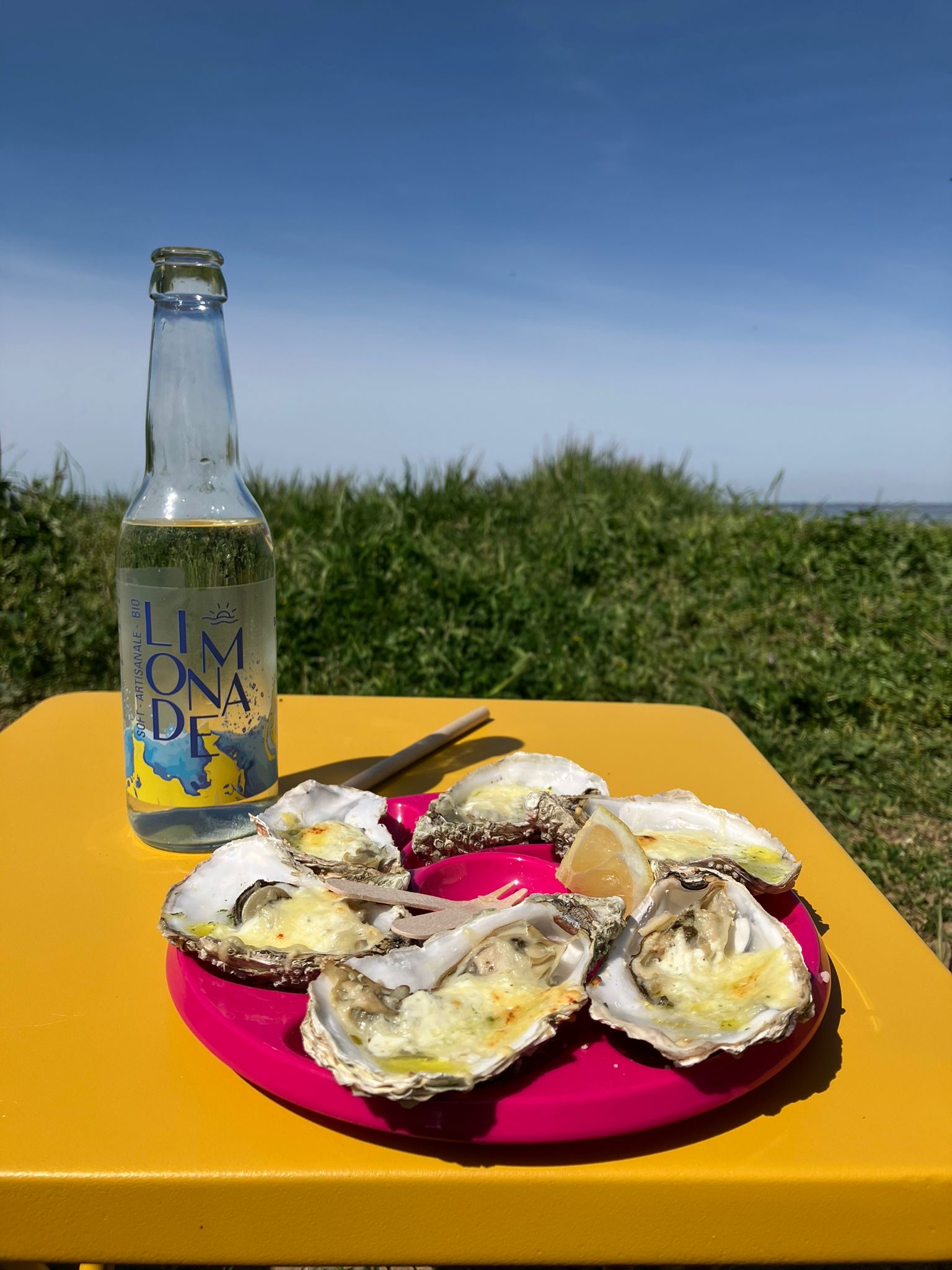 Merci à Carole, elle fait un service remarquable. Tout est local : huîtres, pain, bière..... Et le coucher de soleil, y paraît que c'est top. Thanks to Carole the owner, the hoysters can be eaten cold or hot, they are produced locally as well as the bread and the beer. Come and taste