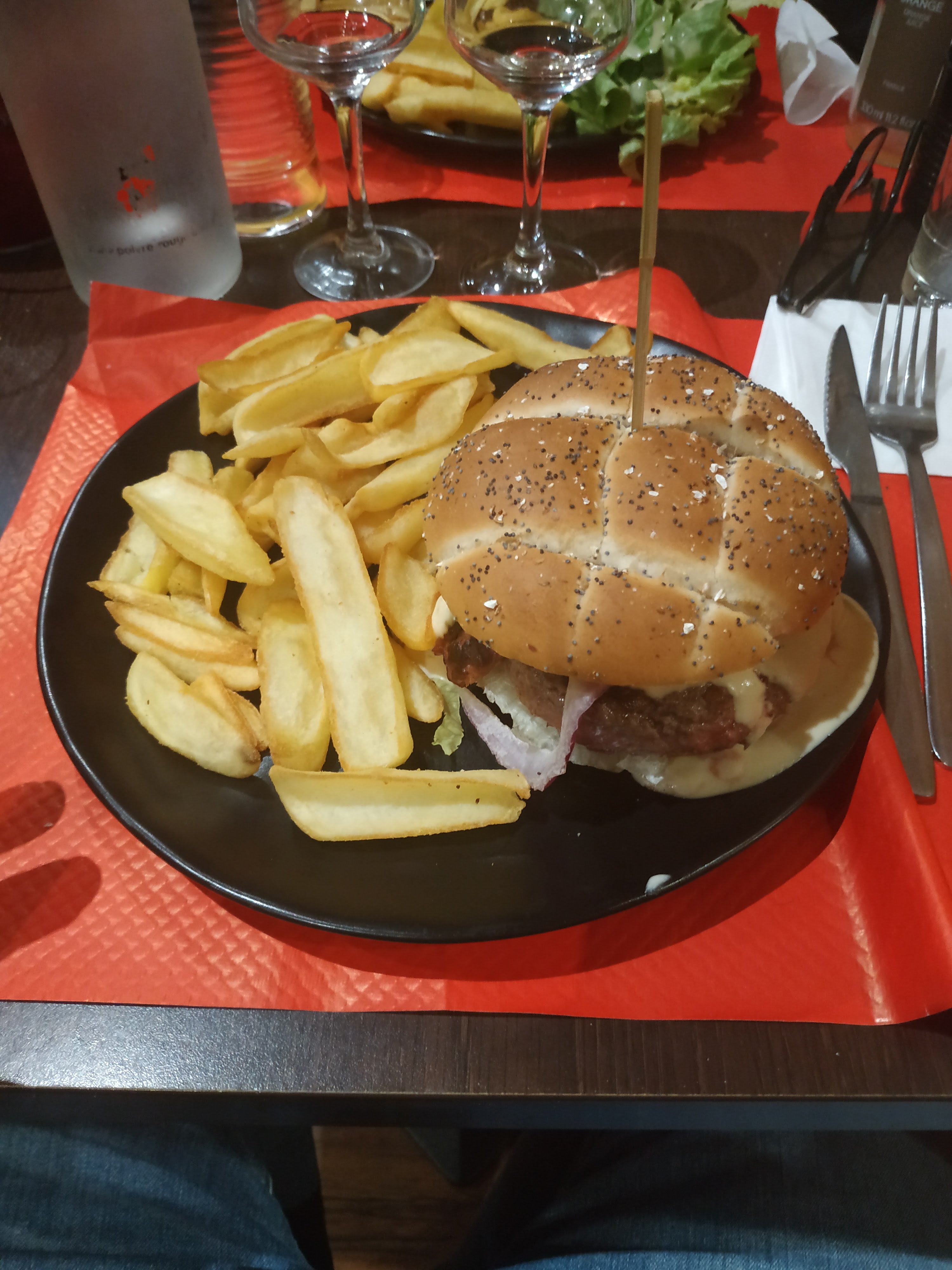 Stationnement difficile à trouver on s'est garé sur le parking de quick, Accueil très agréable, service rapide et de qualité, patronne accessible. En ce qui concerne le repas, dans l'ensemble plutôt bon, pas besoin de rajouter sel ou poivre donc les assaisonnements sont respectés, Deux cocktails Planche de tapas en apéro trop cher pour des produits non fait maison hormis les 3 Samoussa de poulet. En entrée : salade de chèvre chaud plutôt bonne pain brioché dommage que ce soit de la bûche de chèvre / tartare de saumon absolument rien à redire. En plat : tartare de bœuf préparé / cheeseburger, tartare de bœuf rien à dire quantité respecté assainissement respecté, cheeseburger pareil rien à dire confit oignon visiblement fait maison, Belle trouvaille quant à la sauce chorizo qui est excellente petit bémol sur la sauce camembert où le goût du camembert n'était pas très présent. Si je peux me permettre une Critique nous n'avons pas pris de dessert car trop peu était fait maison 13 desserts à la carte c'est beaucoup trop, il vaut mieux en faire moins mais de qualité. Dans l'ensemble repas agréable, service rapide et aimable, lieu sympathique, nous reviendrons,