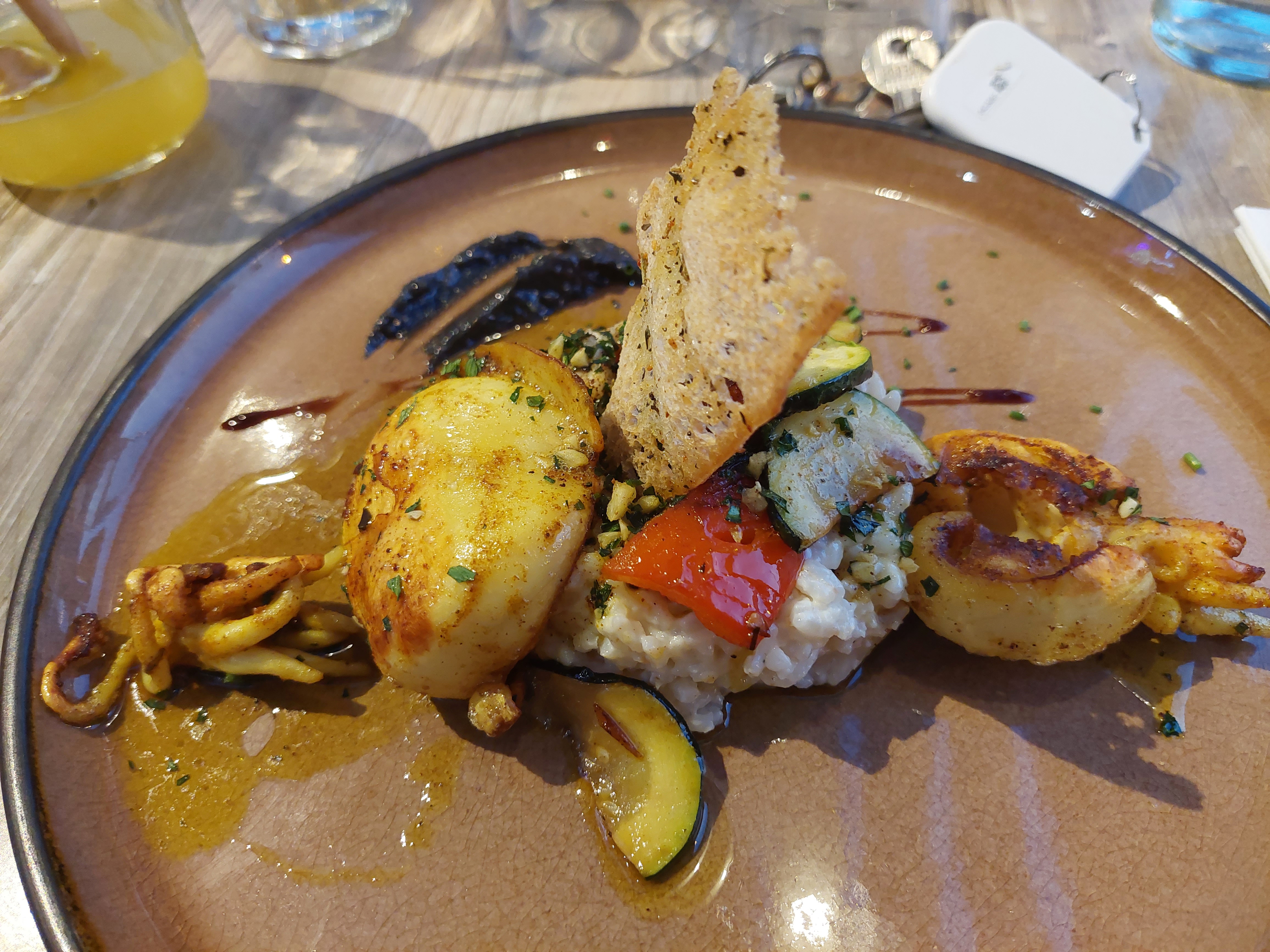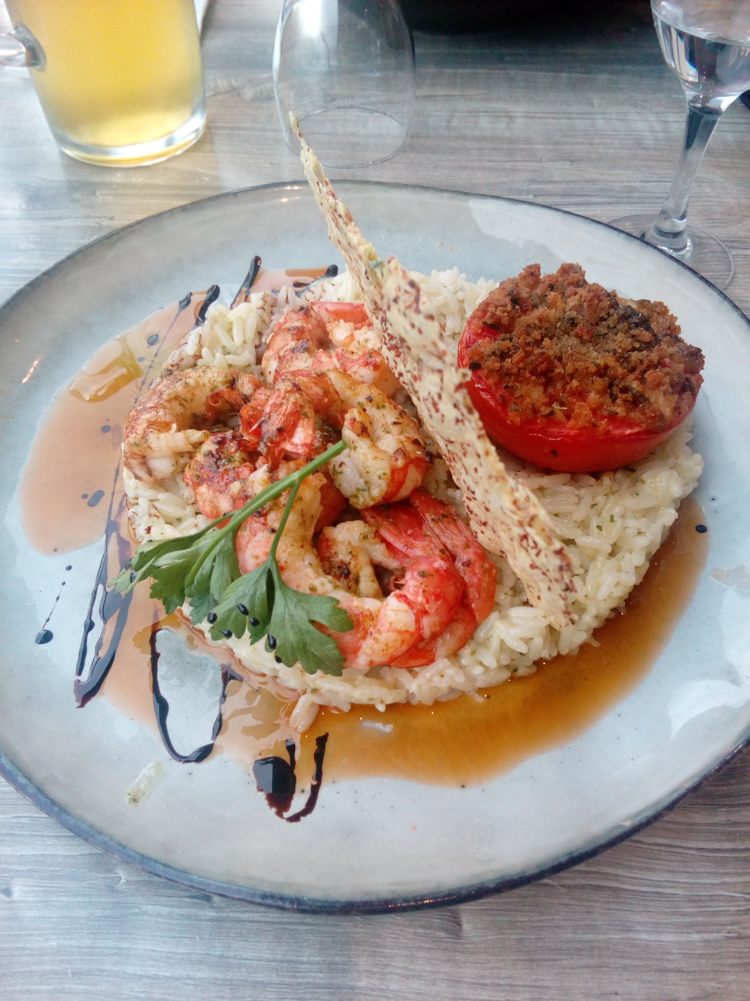 Pichet de vin blanc tiède...Il a fallu réclamer des glaçons et les mettre nous même dans le seau refroidisseur qui était vide et tiède lui aussi, il a fallu réclamer le pain (toujours pas apporté après l'entrée), les gambas étaient congelées, vu leur consistence, en partie crues, sans carapace et très mal assaisonnées....le dessert no comment...une panna cotta au carambar industrielle!!!! Bref...très cher et très mauvais...mauvaise expérience!!!