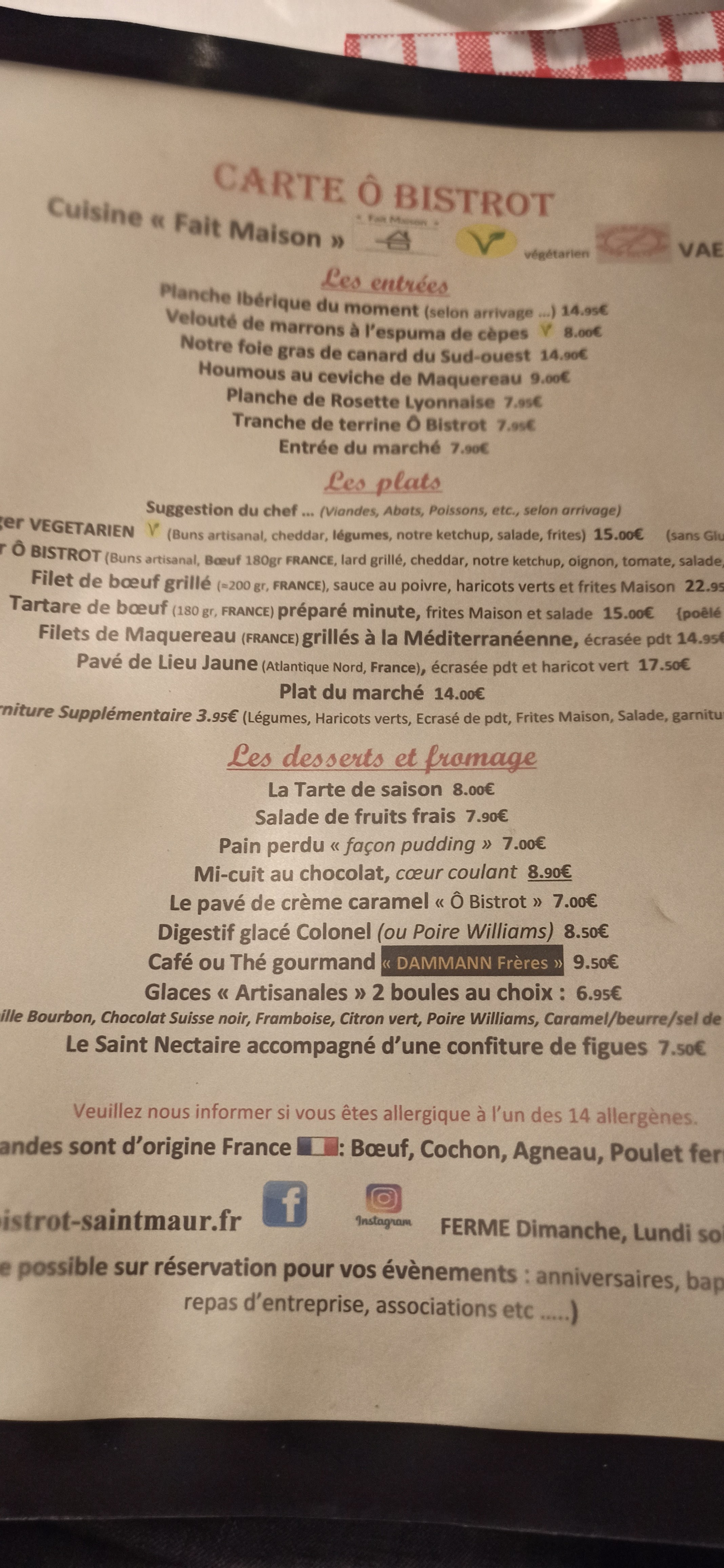 Très bon et copieux burger au steak ou végétarien au prix de 15.9€, et large et bonchoix de vin de toutes les régions de France (prix un peu élevé), seuls les prix des digestifs sont abusés. Patron sympathique, bonne adresse de St Maur.