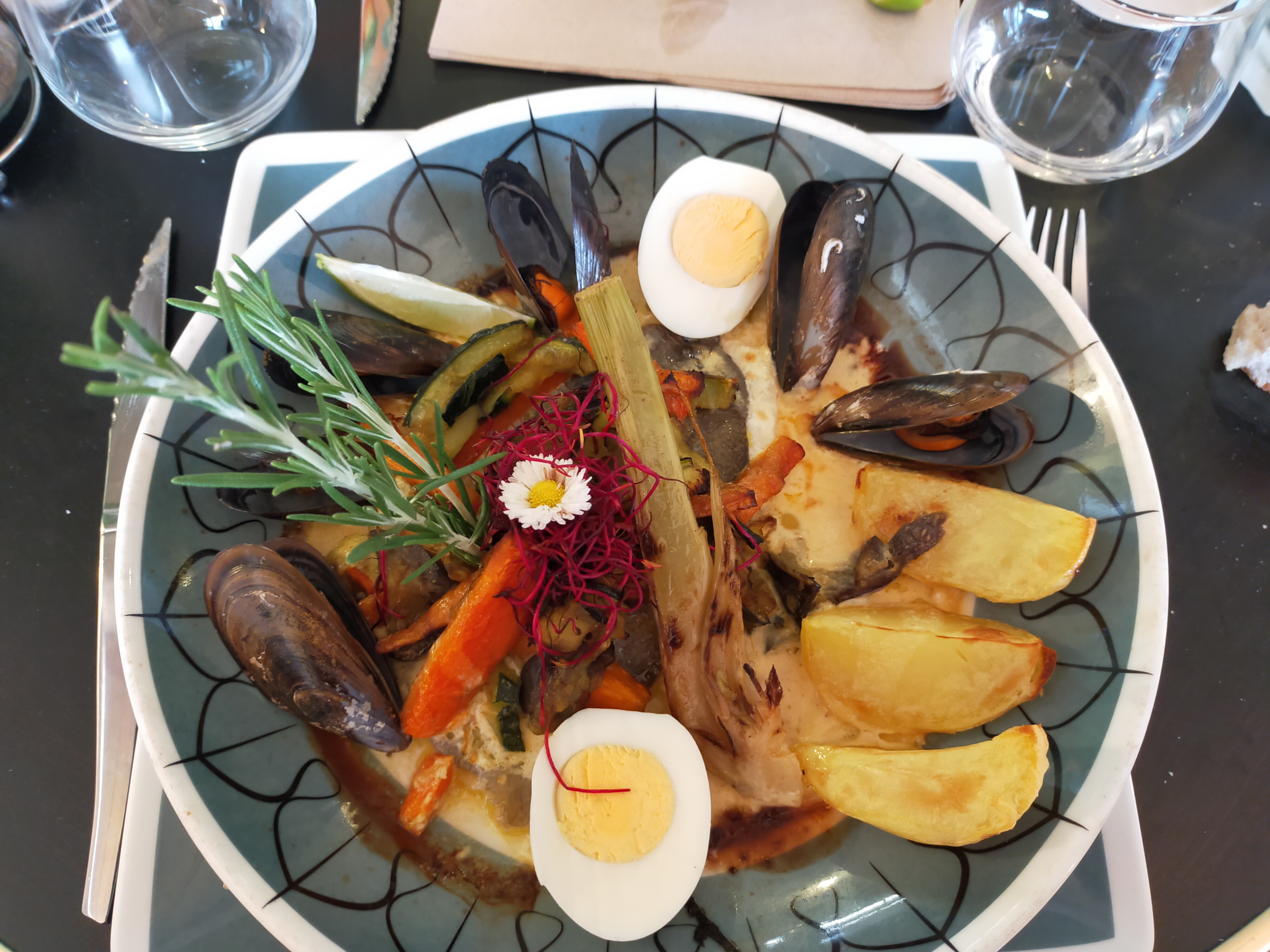 Cuisinier d'assemblage les mêmes moules cuites depuis la veille dans toutes les préparations idem pour des pommes de terres mal cuites . . . accueil chaleureux et des voisins charmants pour sauver notre soirée . . .