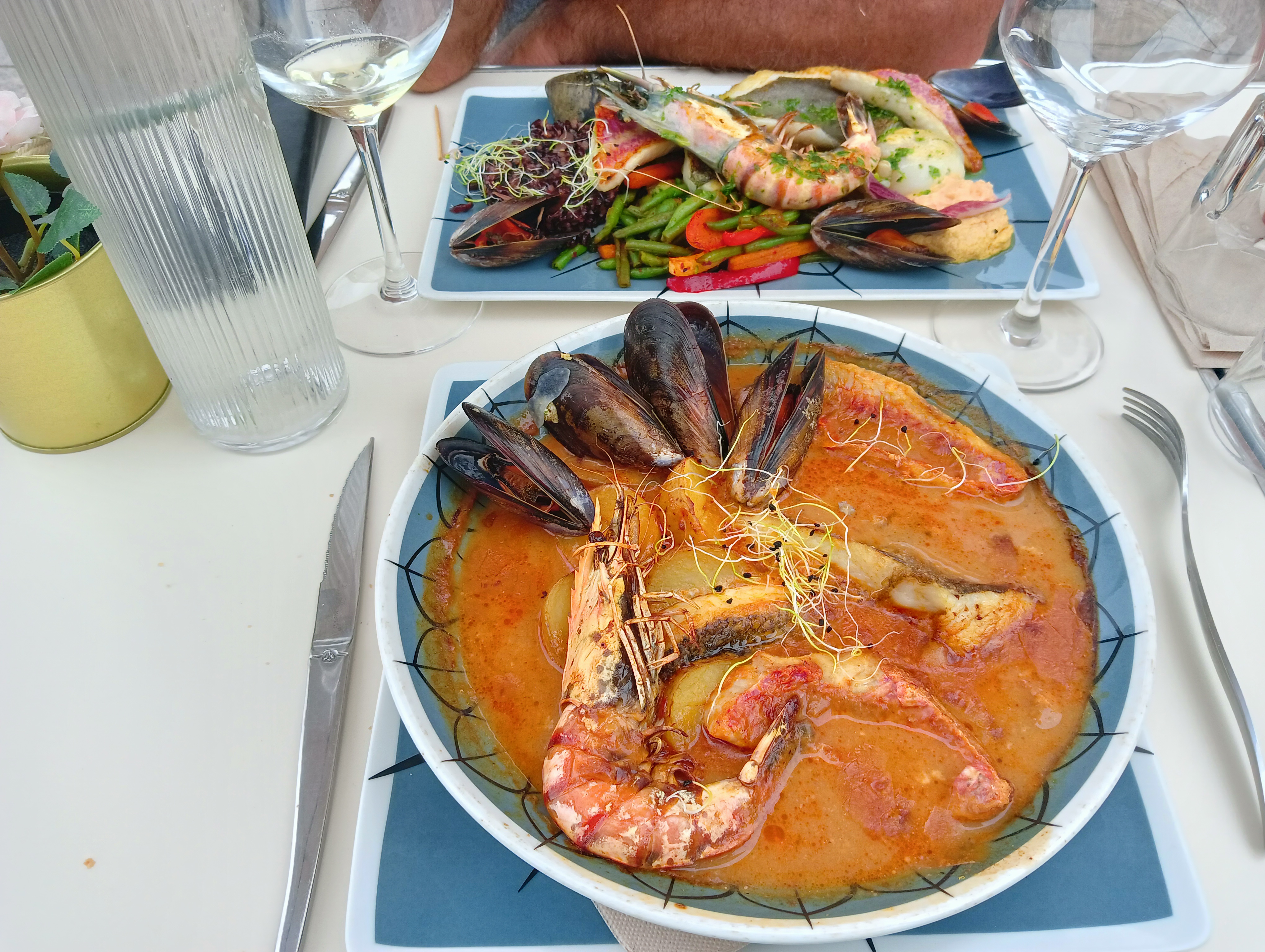 Bouillabaisse, Linguine de Gambas et poulpe grillé au top Produits frais et cuisinés maison Un super repas en terrasse Si les toilettes pouvaient être accessibles handicapées ce serait au top !