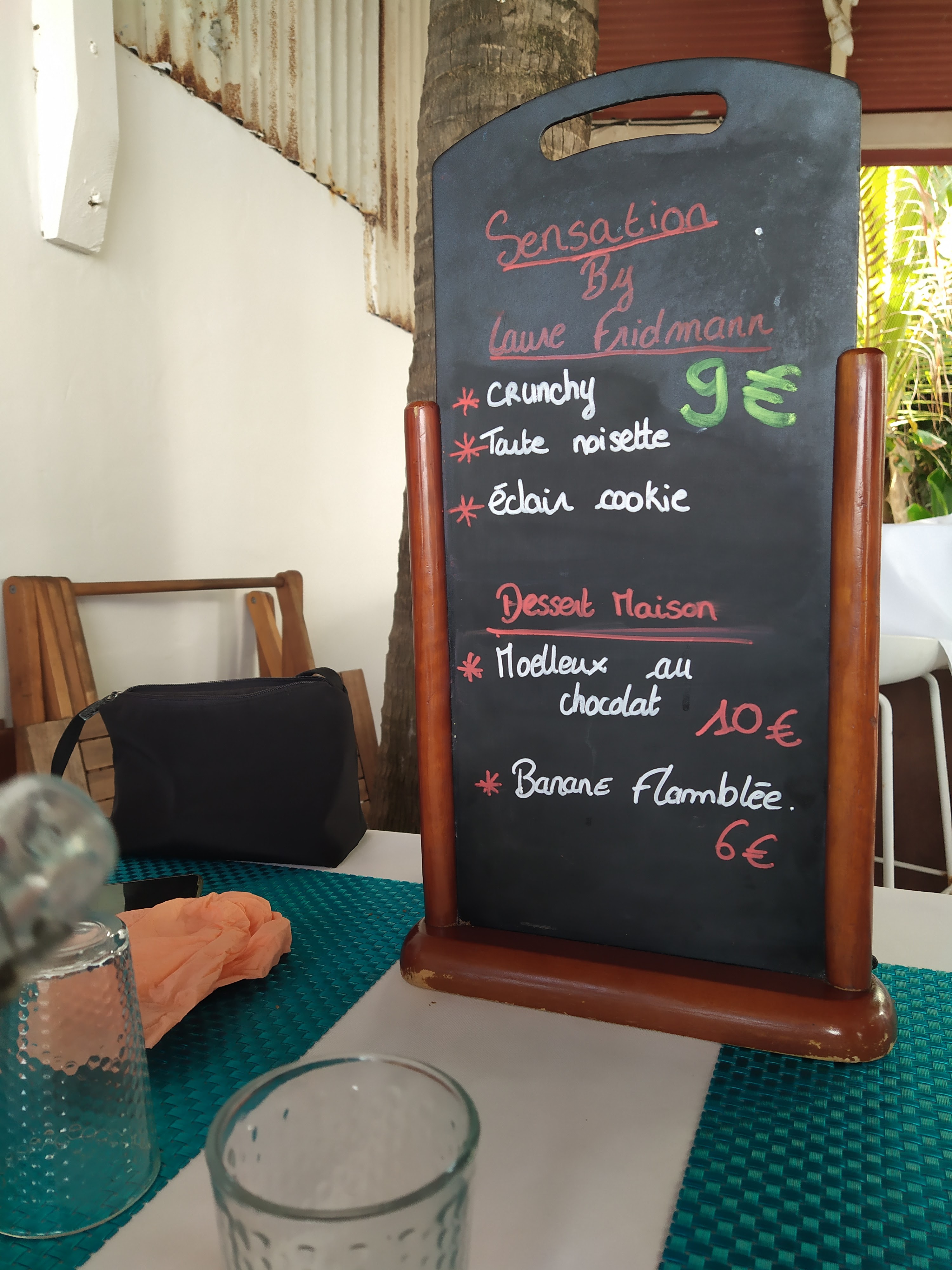 Cadre idyllique vue sur le lagon. Terrasse ombragée. Cuisine très variée traditionnelle ou inventive. Délicieux. Que du fait maison. Frites fraîches légumes frais. Les desserts viennent de la pâtisserie Sensations. Cocktails du jour. Citation du jour 😉