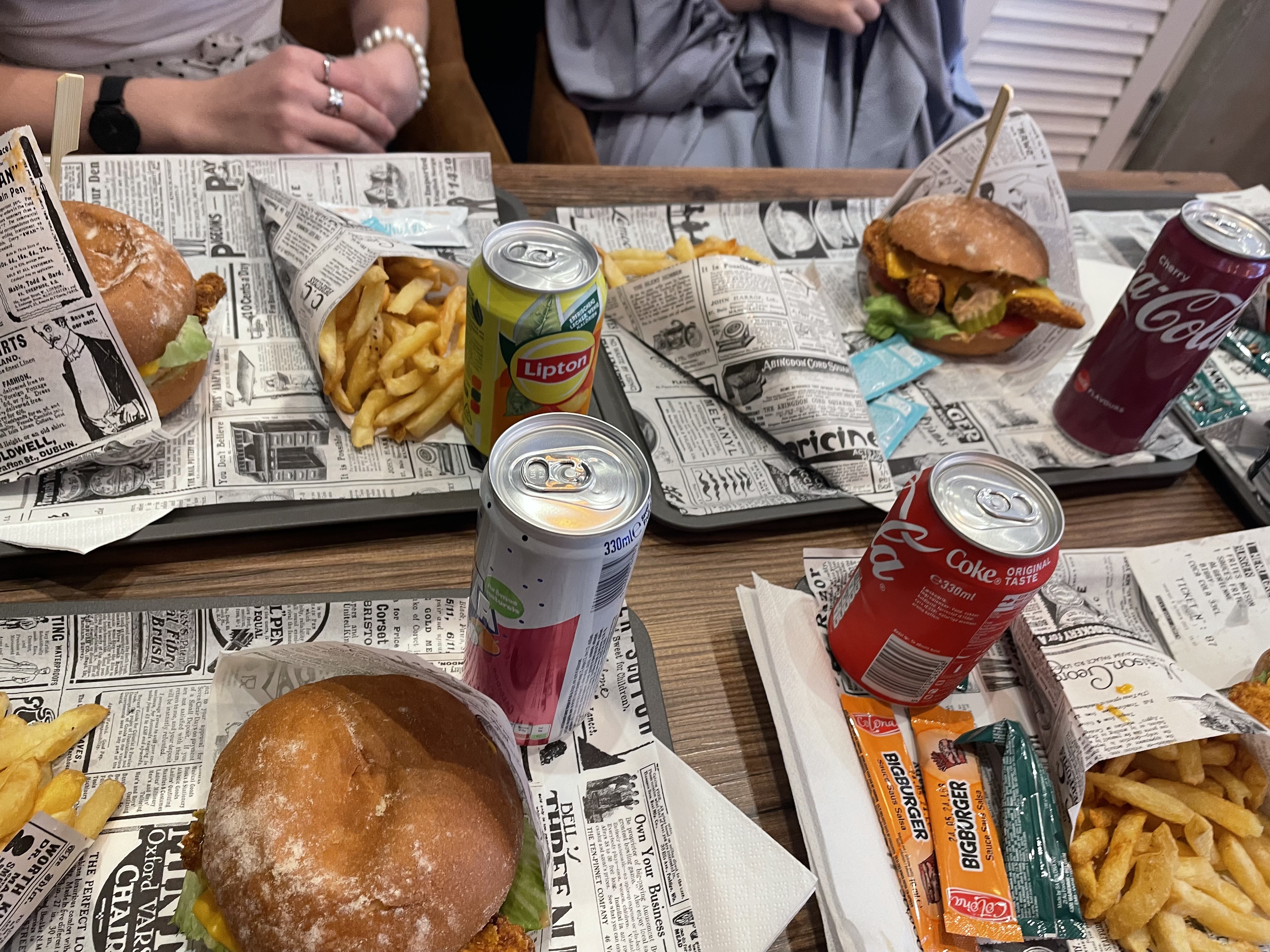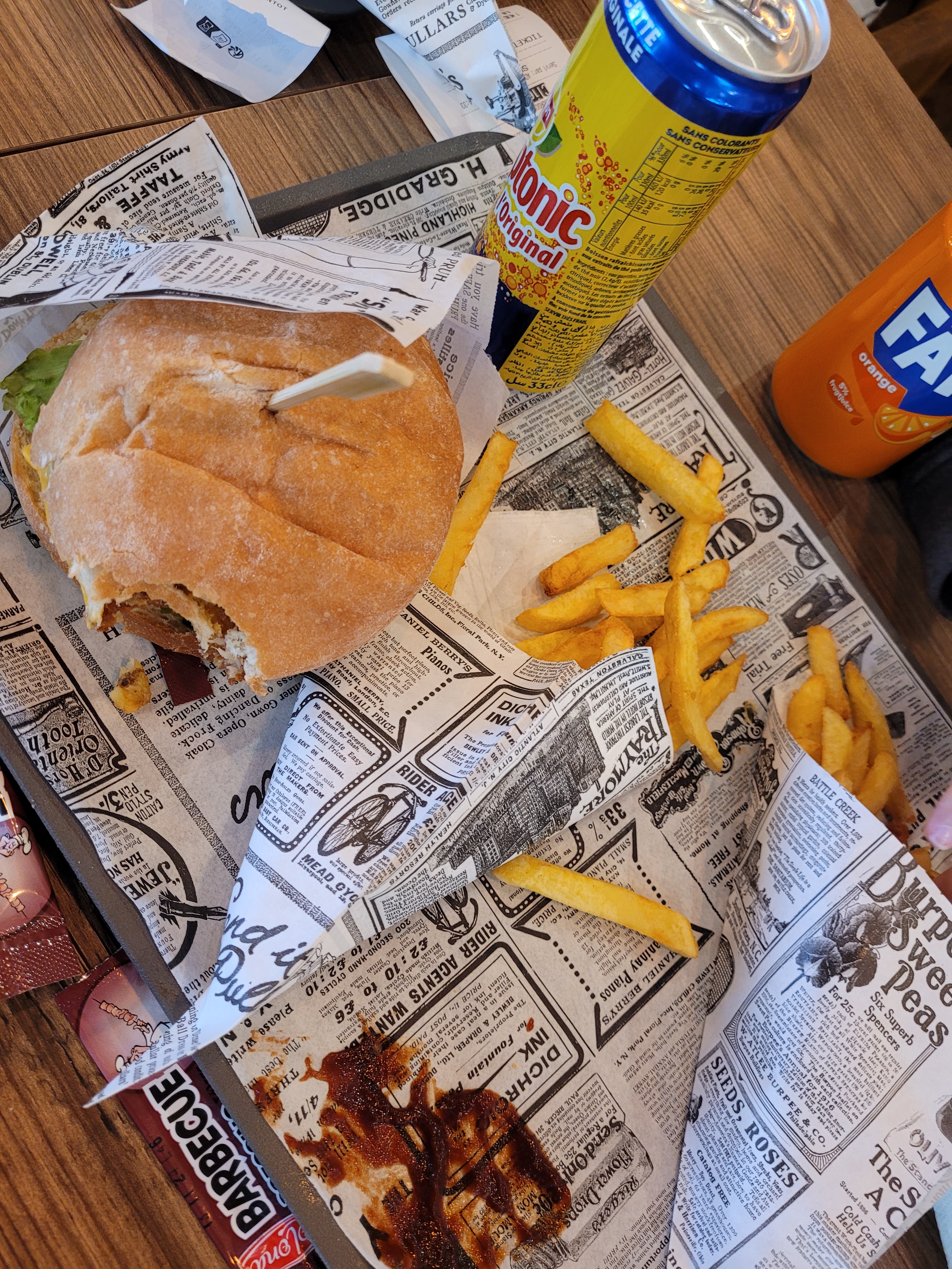 Points positifs: -comme mentionné dans plusieurs commentaires, les frites sont délicieuses. -la déco (à part les boîtes de dérivation au plafond, et la grande télé qui affiche de la pub netflix) -beaucoup d'espace -ouvert très tard par rapport à la concurrence (kfc, subway...) -Le personnel qui se démène mais qui est visiblement surchargé (cuisine+encaisse+nettoie les tables avec le même gant noir) -une grande serviette est fournie avec le plateau pour bien s'essuyer après avoir mangé. -l'emballage façon journal Points négatifs: -je commande un menu duo à la borne, que je paye. Et puis à table on me dit qu'il y en a plus faut choisir autre chose comme le menu B2 (tenders). Je le retrouve avec un peu de tout dont des nems?!?!?! Si je veux manger des nems je vais au chinois! -les quelques morceaux de tenders et de nuggets: sans saveur, industriel. Par contre pas gras. -il faut réclamer les sauces qu'on nous fait sélectionner sur les bornes (vu plusieurs fois dans les commentaires). Surtout que c'est important pour dîner du goût à ce qui n'en a pas. -table encore mouillé. Quand on a demandé de l'essuyer, on nous a dit oui mais rien. Elle était aussi collante. -les toilettes sans papier... Je ne donnerai pas plus de détails. Bref, très très déçu surtout vu la bonne note et le bouche à oreille.