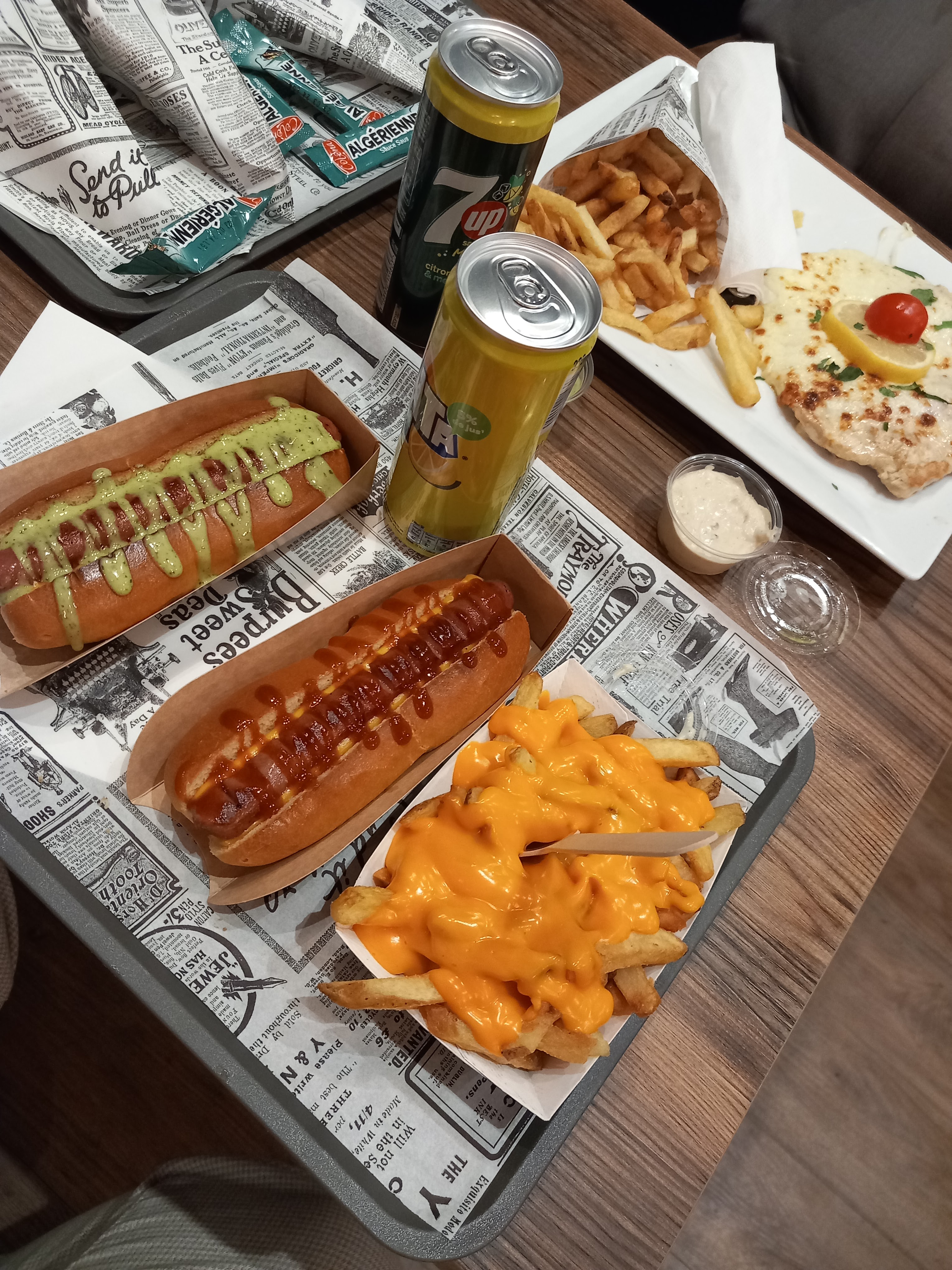 Les frites elles sont biens, le pain un peut caoutchoute, la sauce verte trop sucré, le poulet est bien, le service était rapide et je suis choquer qu'on peut prendre le reste de notre repas.