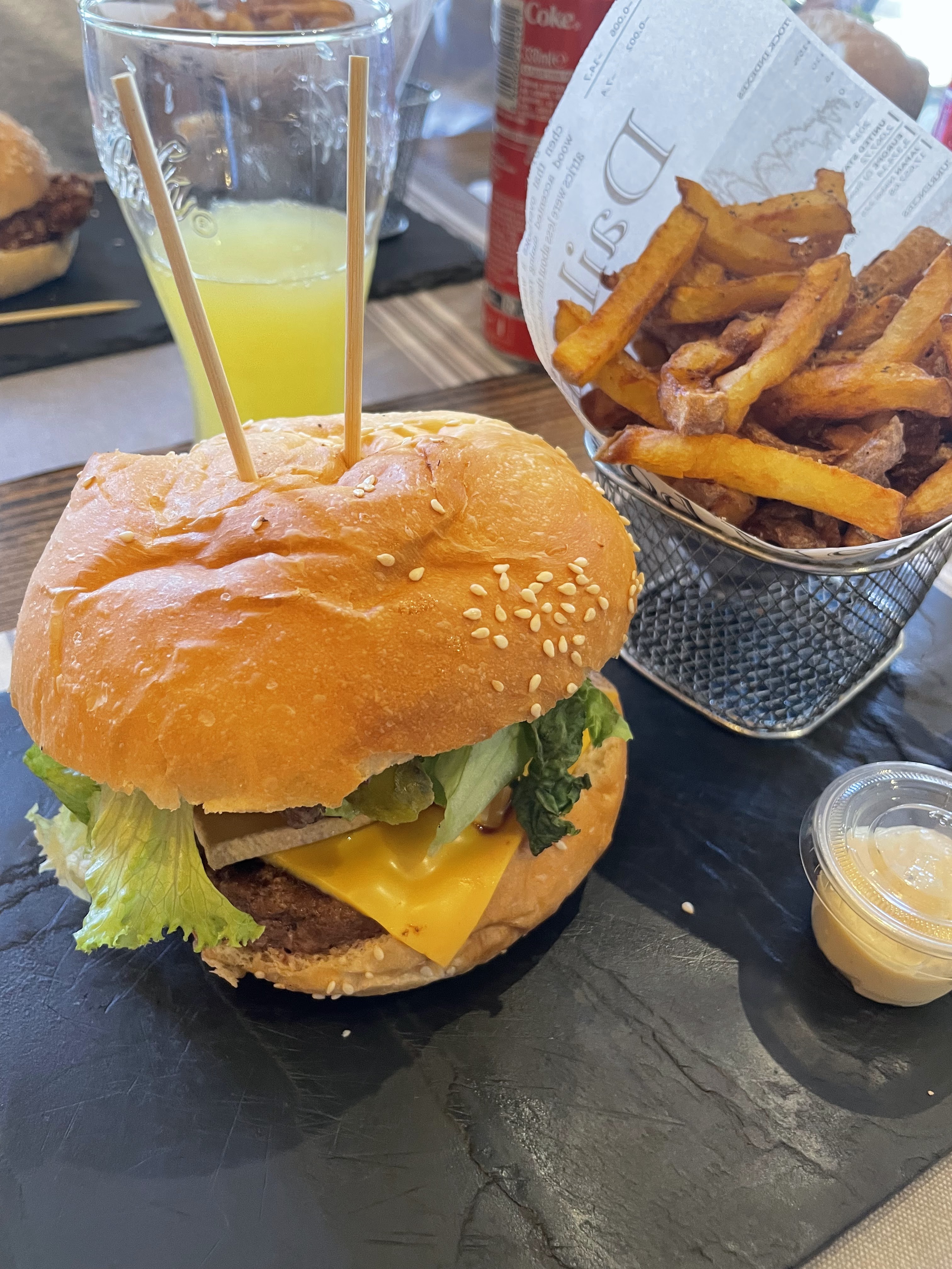 Simple , sans extra , bon burger, frittes maison certe mais brûlées franchement bof. Et la serveuse qui ne veut pas écouter une suggestion et qui insiste négativement... limite limite,faut savoir écouter même si on adhère pas, dans le commerce madame.