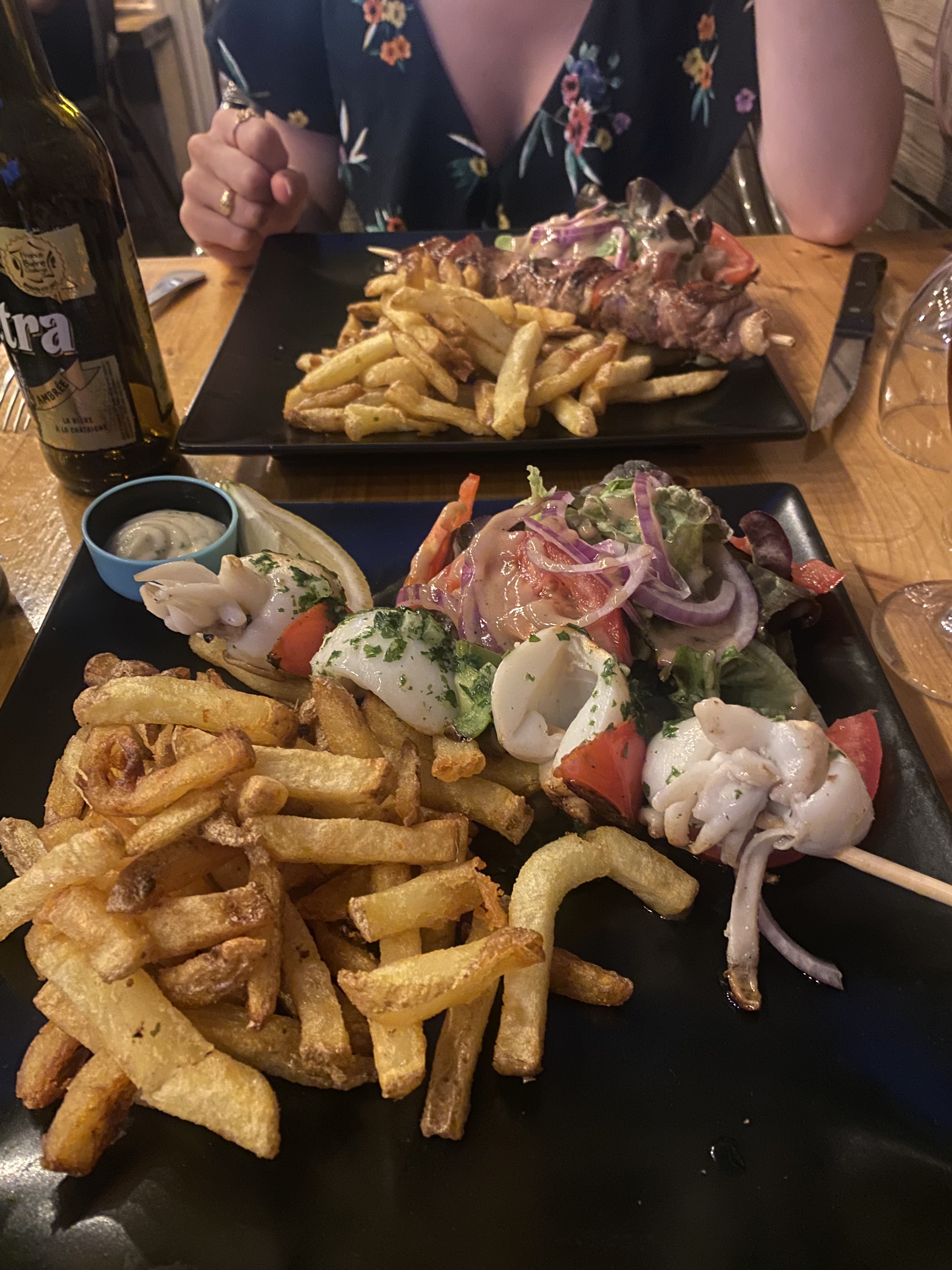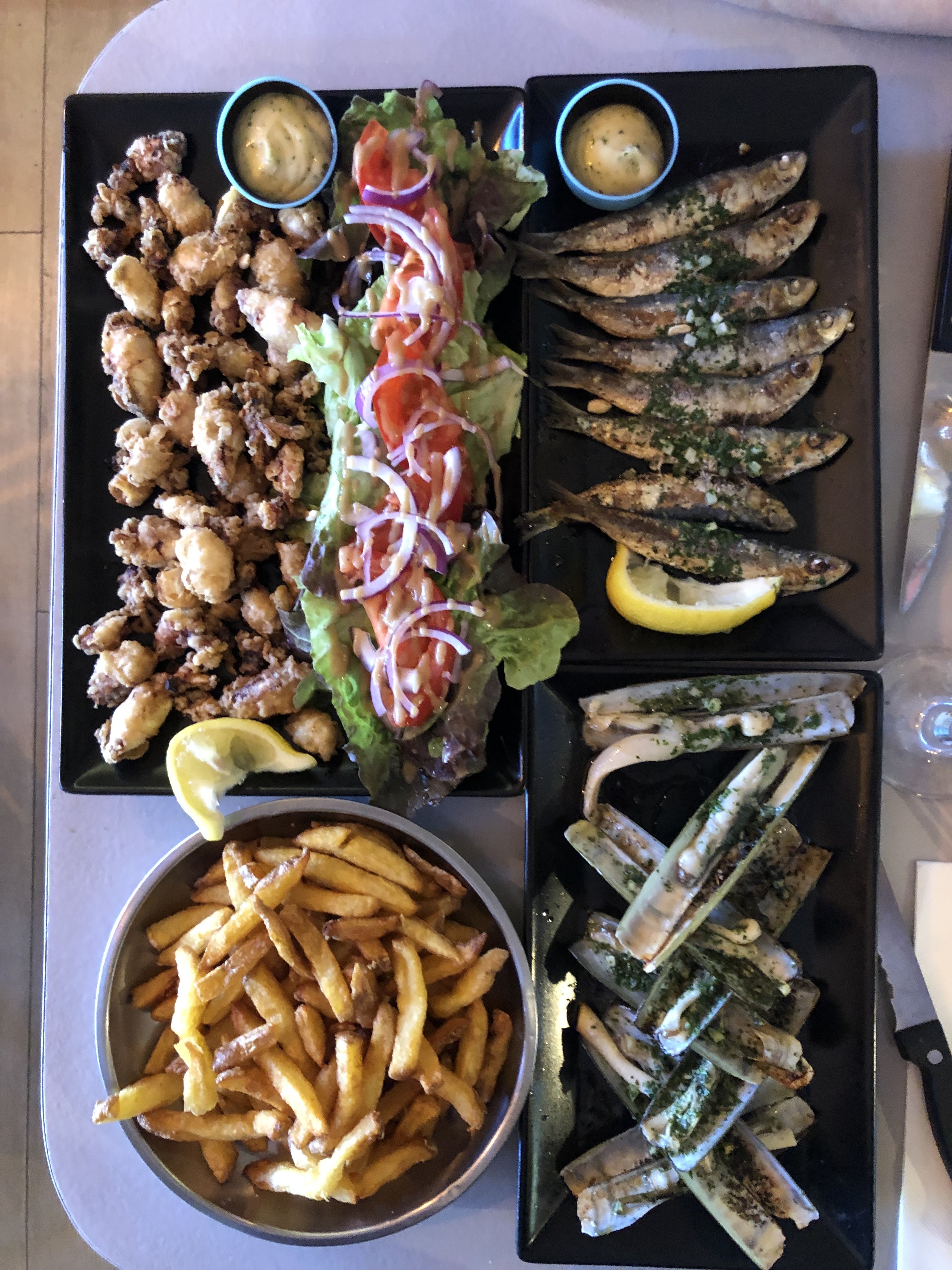 Un mot : Chaleur ! Chaleur de l'accueil ,chaleur du cadre, chaleur des plats !! Fritures de jols , sardines a la plancha couteaux persillades , on enchaîne avec les brochettes ... Quel joli moment ...
