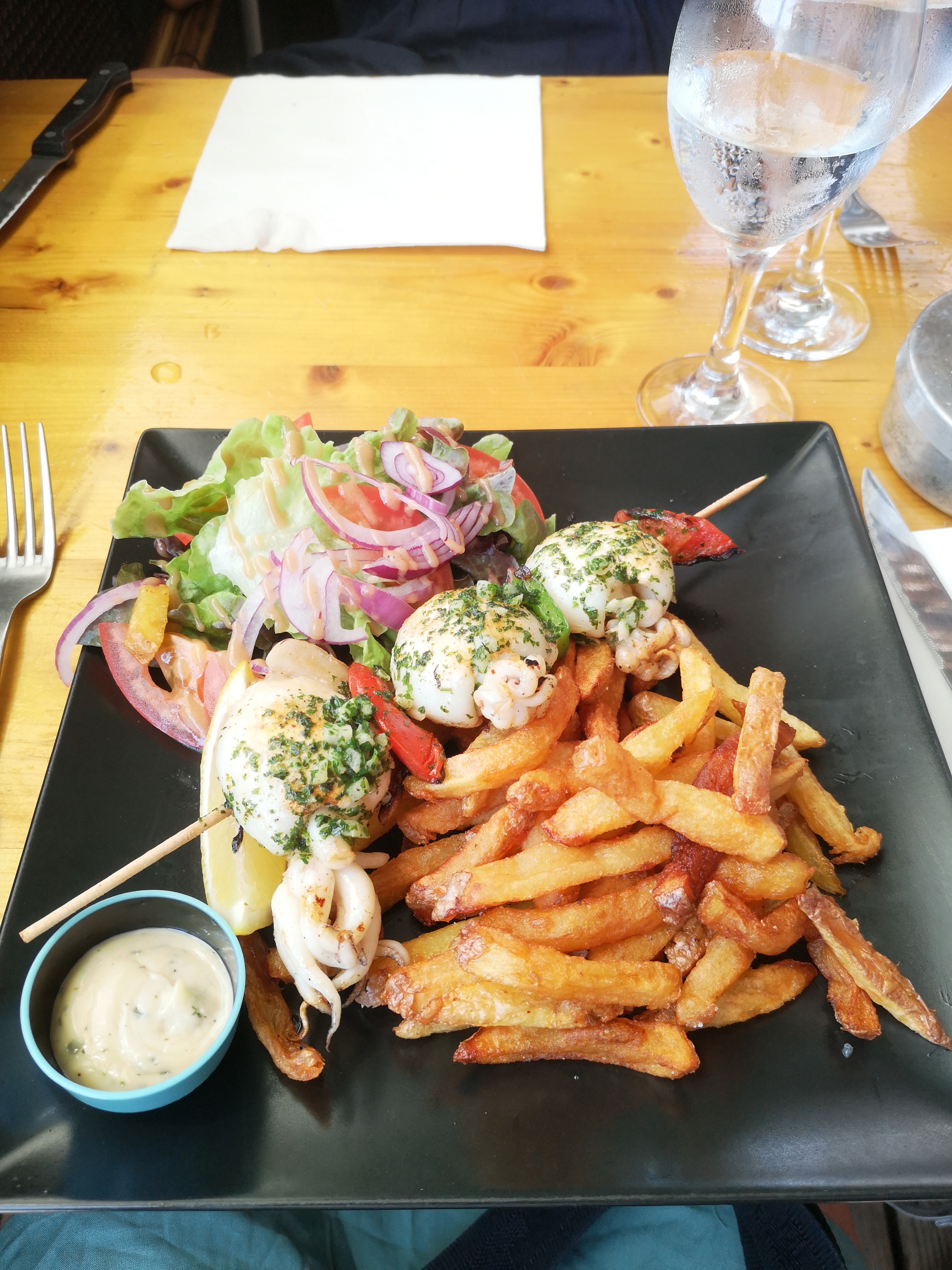 Cadre très jolie et très mignon qui donne envie de venir déjeuner dans le restaurant. Les plats sont bon et les prix abordables et accessibles pour tout le monde. La spécialité de ce restaurant est les brochettes (poulet, bœuf, canard, gambas etc). Le menu de brochette est à 12.50. Celle-ci est composée d'une brochette, de frites et d'une salade. Nous n'avons pas été déçu.