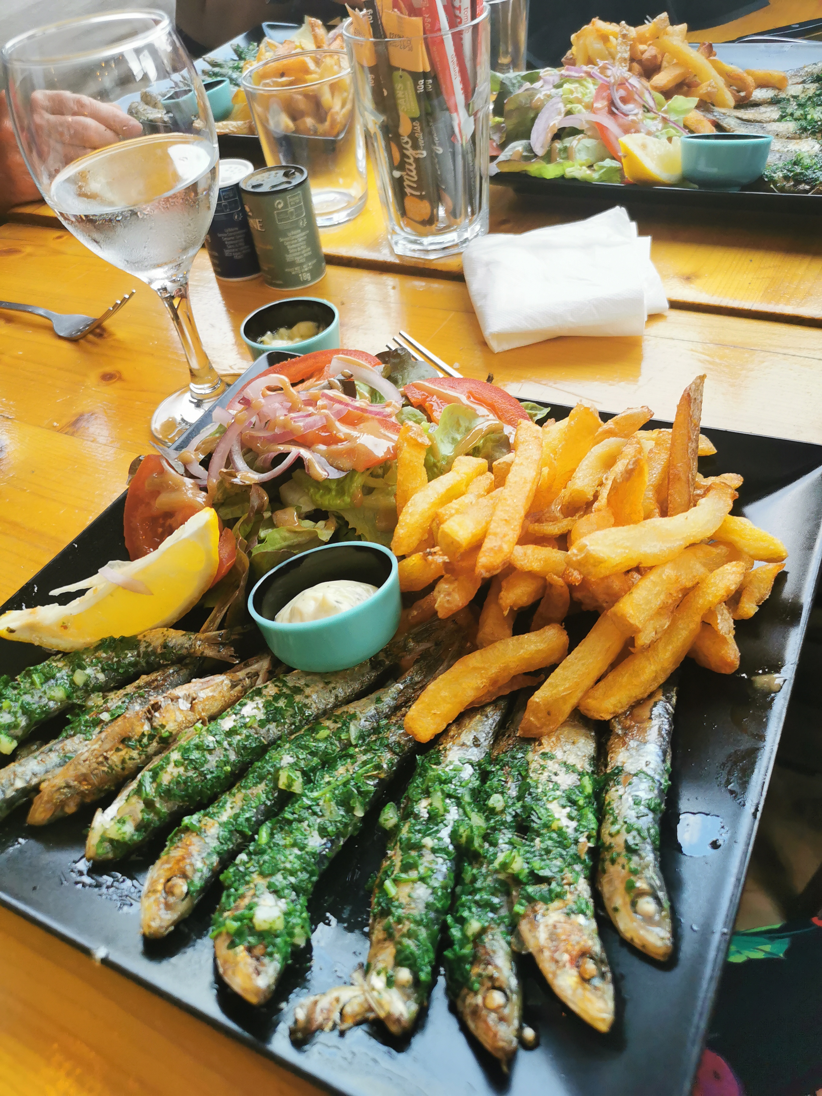 Sardines pêchées du matin et cuisinées juste comme il faut, avec frites maison et petite salade. On s'est régalés, loin de l'agitation du port, dans ce petit resto très sympa et surtout très bon ! De passage à Carnon, nous y reviendrons avec plaisir...