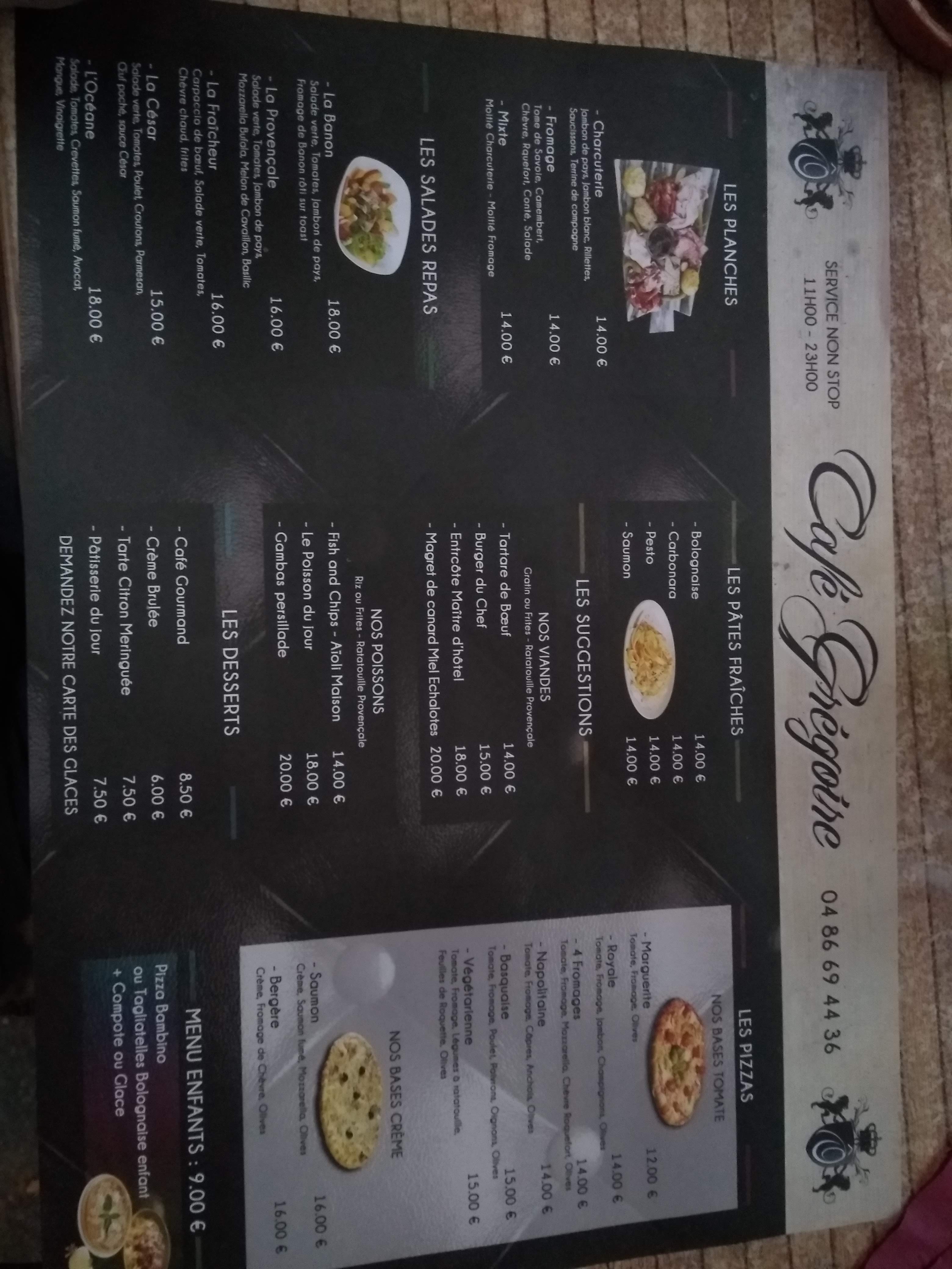 Malgré l'heure tardive, nous avons été très bien reçus chez Grégoire. Chacun peut y trouver son plaisir entre planches, pâtes, salades ou viandes. Les planches sont très copieuses et appétissantes tout comme les autres plats. Les serveurs sont très gentils. Une halte sur leur terrasse ombragée et agréable s'impose sur Apt.