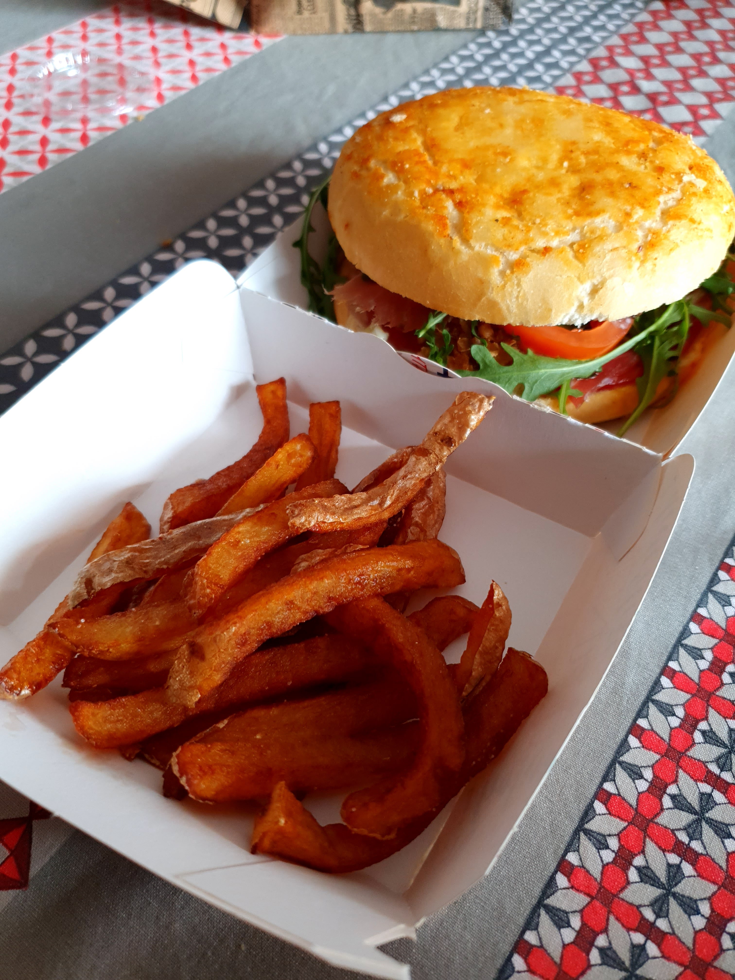 J'ai commandé à emporter deux burgers Copains/Copines. Un vrai régal !! Fromage et charcuterie local 😍 De délicieux pains et des frites maison, que demandez de plus.