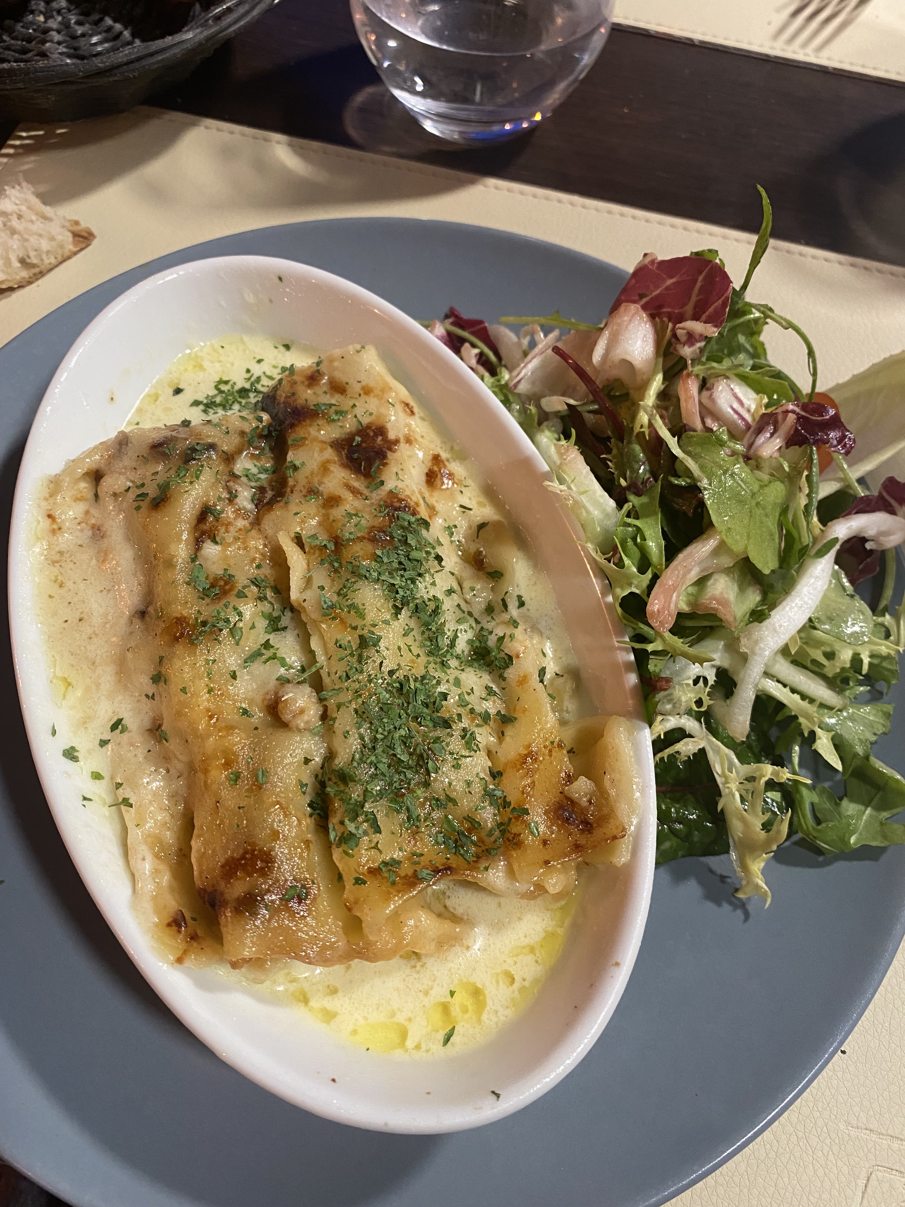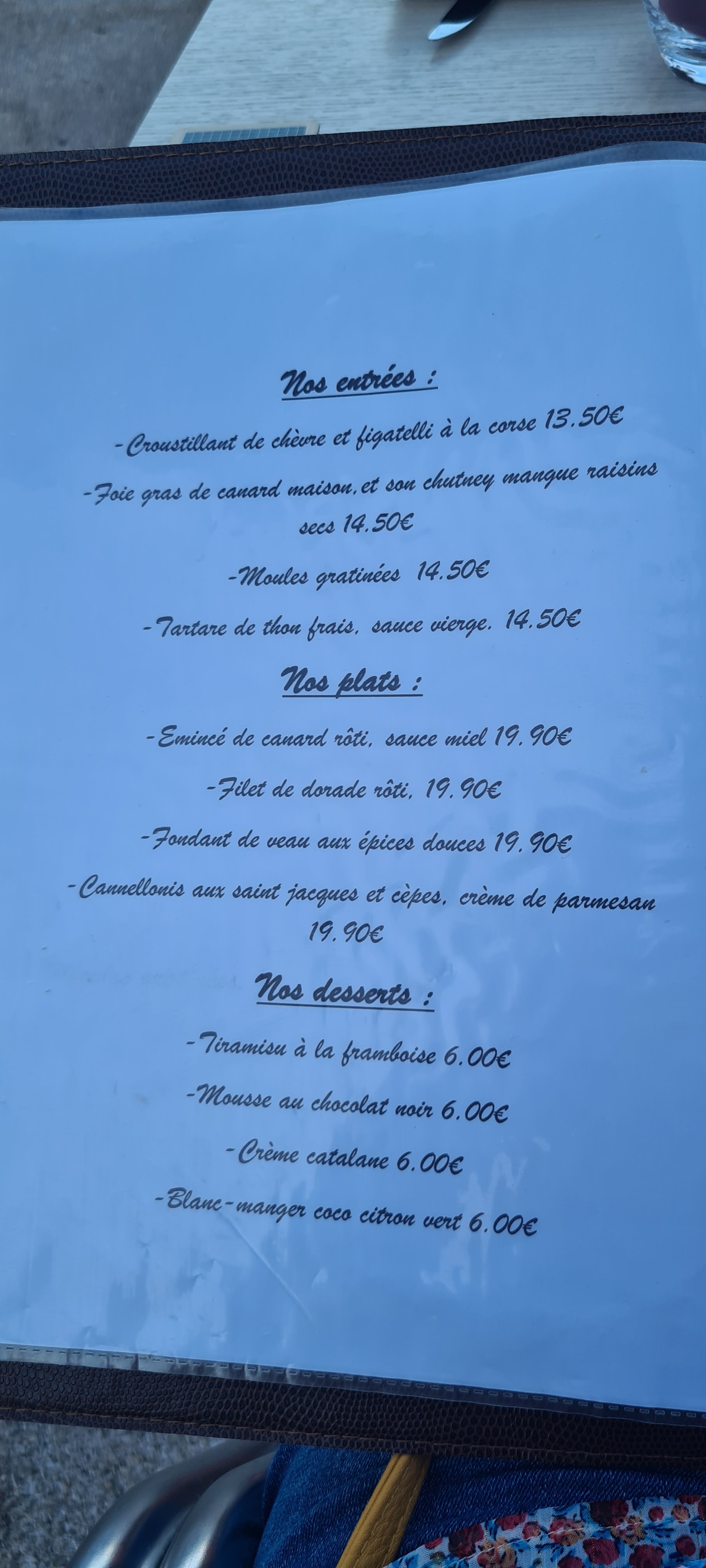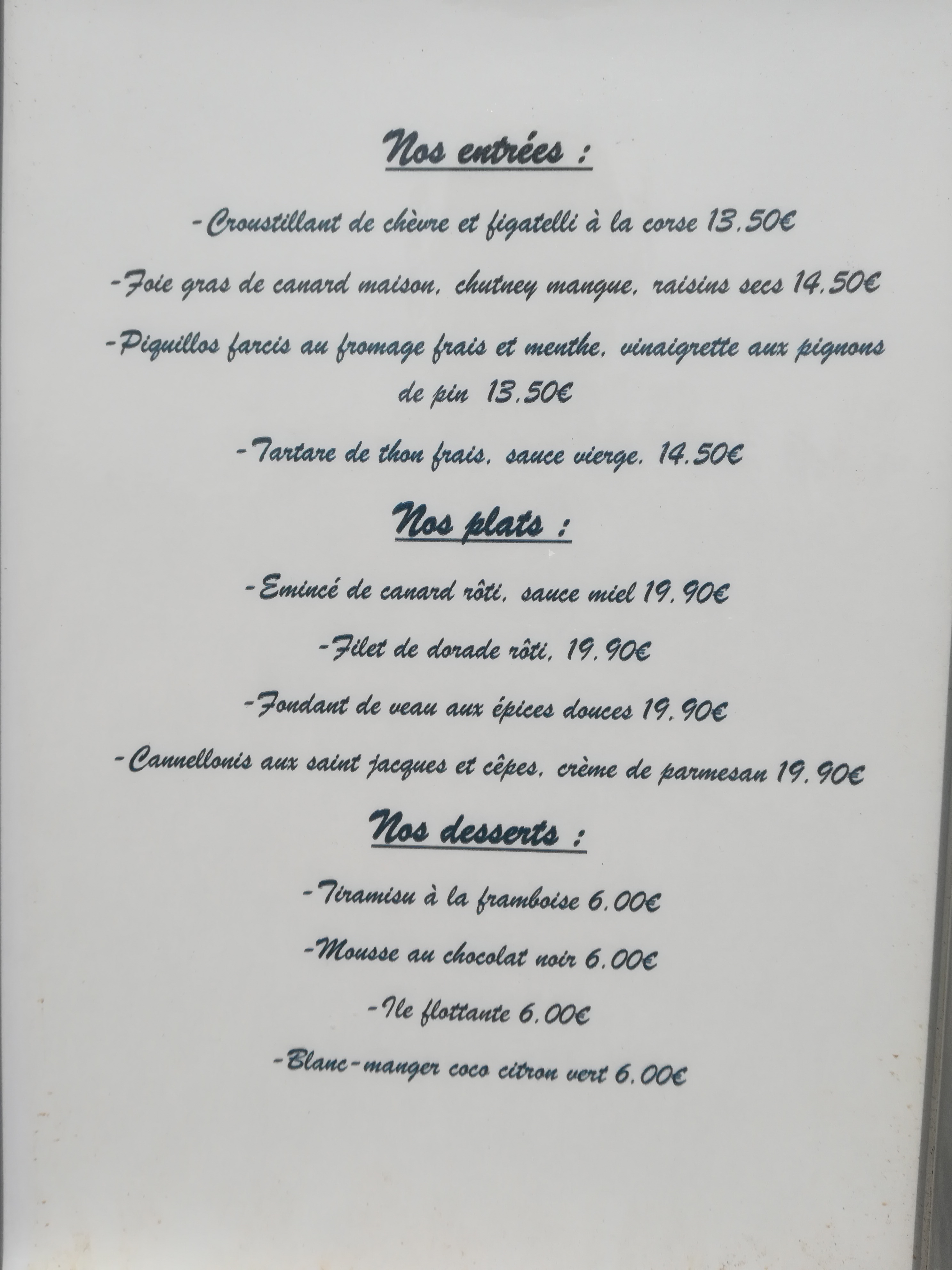 Au top Nous avons très bien manger !!! De l’entrée au dessert jusqu’au vin c’était une belle surprise . Copieux et de bonne qualité nous recommandons les yeux fermés . Patron très gentil et affiche des prix raisonnables contrairement à ses concurrents !! Ps : les cannellonis de saint Jacques sont excellentes !