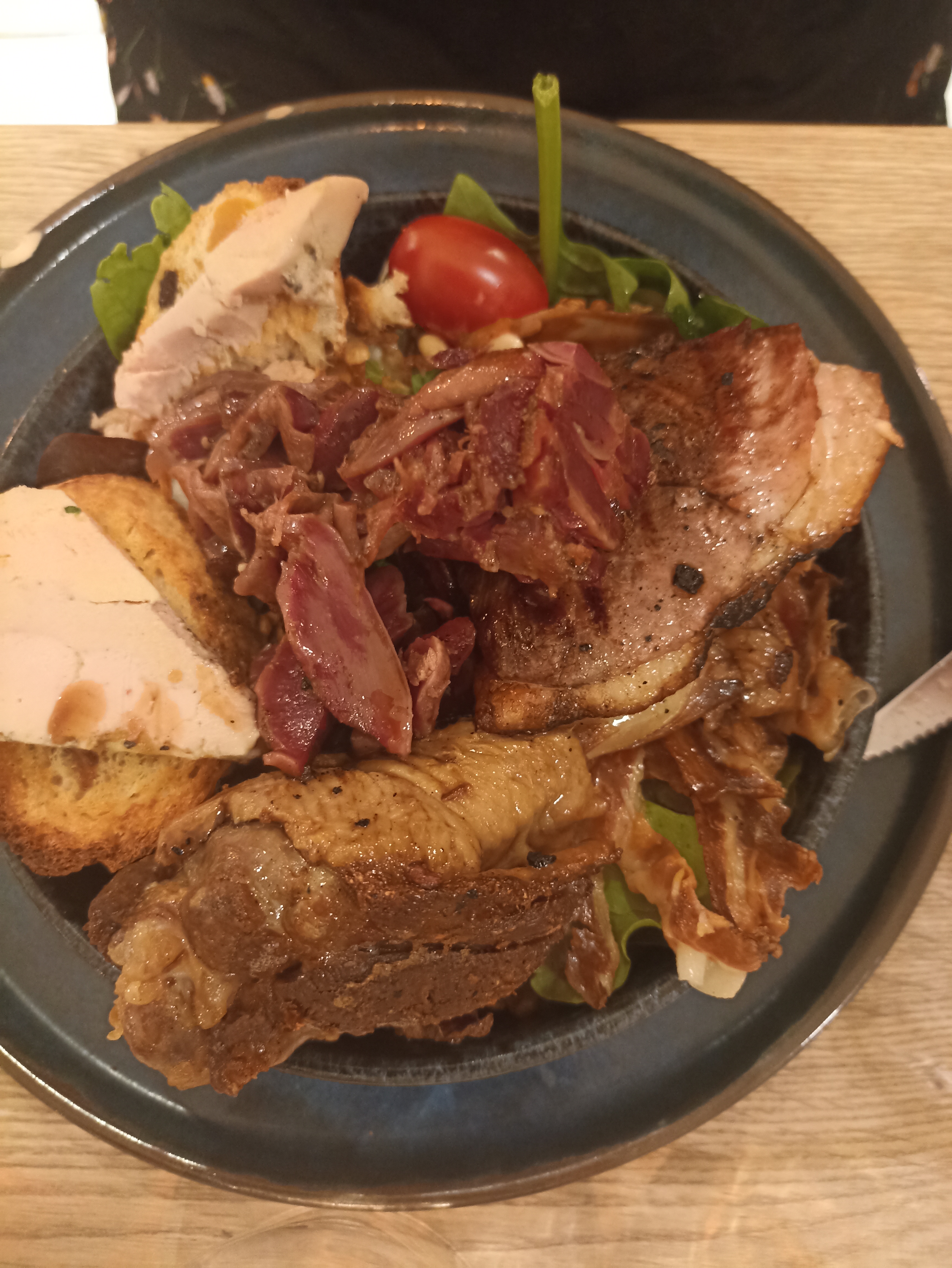 Cadre agréable, nous avons choisi une salade composée de qualité avec gésiers, 1 beau morceau de foie gras, magret + cuisse de canard... Plat unique, consistant et très bon...il manquait juste un peu plus de vinaigrette dans la salade mais à demander...