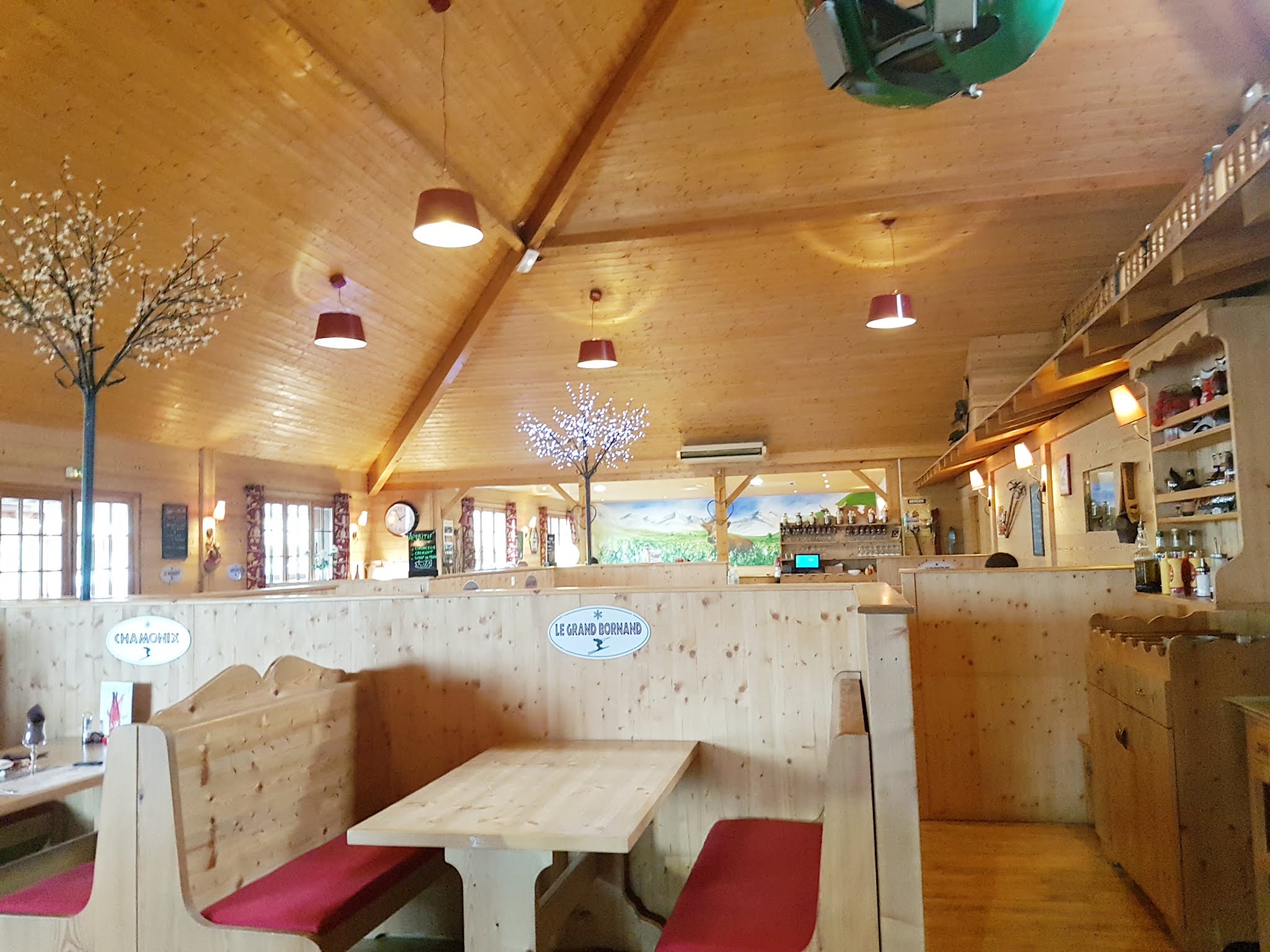 Restaurant sympa avec sa déco montagnarde, serveuses agréables, bons produits, à part le dessert (gâteau choco amande avec crème anglaise) très sec...