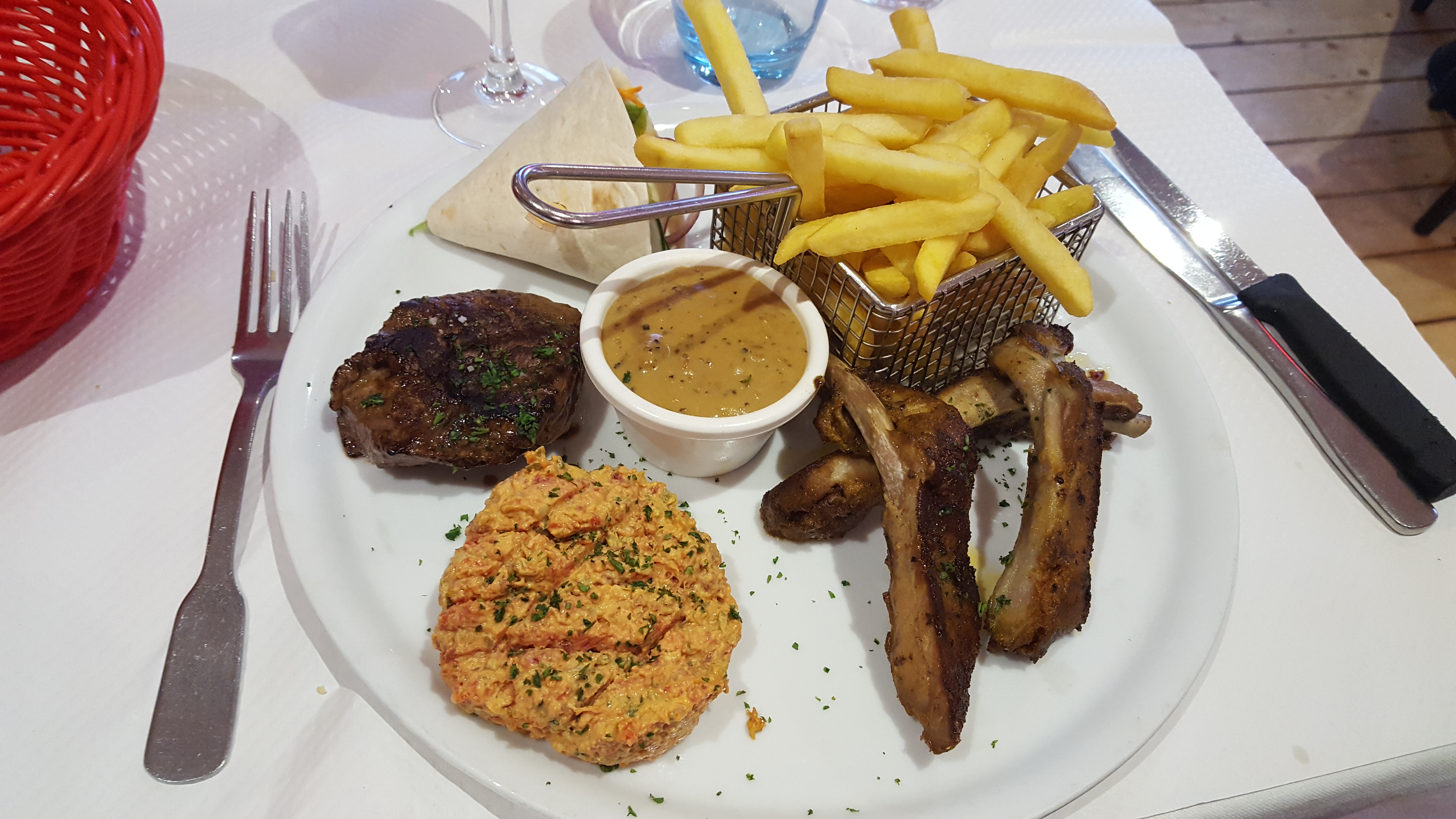Bonjour, j'ai eu l'occasion de découvrir ce restaurant par le biais d'Amis qui y viennent régulièrement. Ils m'en ont fait l'historique et pour avoir fréquenté le bistrot du croisé pendant plusieurs années, j'ai été agréablement surpris par la qualité des produits. Gourmand et gourmet, j'ai mis de côté mes mets habituels et j'ai décidé d'accorder à mes papilles, le plaisir de découvrir *L'Assiette Gourmande, que je vous recommandé vivement et qui est composée d'une sauce Poivre, de frites et salade, un morceau de pavé de rumsteck, travers de Porc mariné, filet américain. Il est demandé un supplément de 4€ si vous ne prenez pas de menu., Suivit d'une assiette de fromages qui n'a pas sa place en dessert, ni en entrée, tellement j'ai cru à une Plaisanterie de très mauvais goût. Je pense qu'un coup de vent aurait suffit à ce que cet effeuillé de 2 fromages, à 6,50e, s'envole! Je n'ai pas eu l'occasion de goûter leur os à moelle, Sans doute lors de notre prochaine venue , l'accueil et le service sont irréprochables. Les serveurs sont aux petits soins, tout en sachant être discret. Vous avez la possibilité de prendre place en terrasse. Cependant, n'oubliez pas que le soleil tourne. Pensez à réserver. Cdt