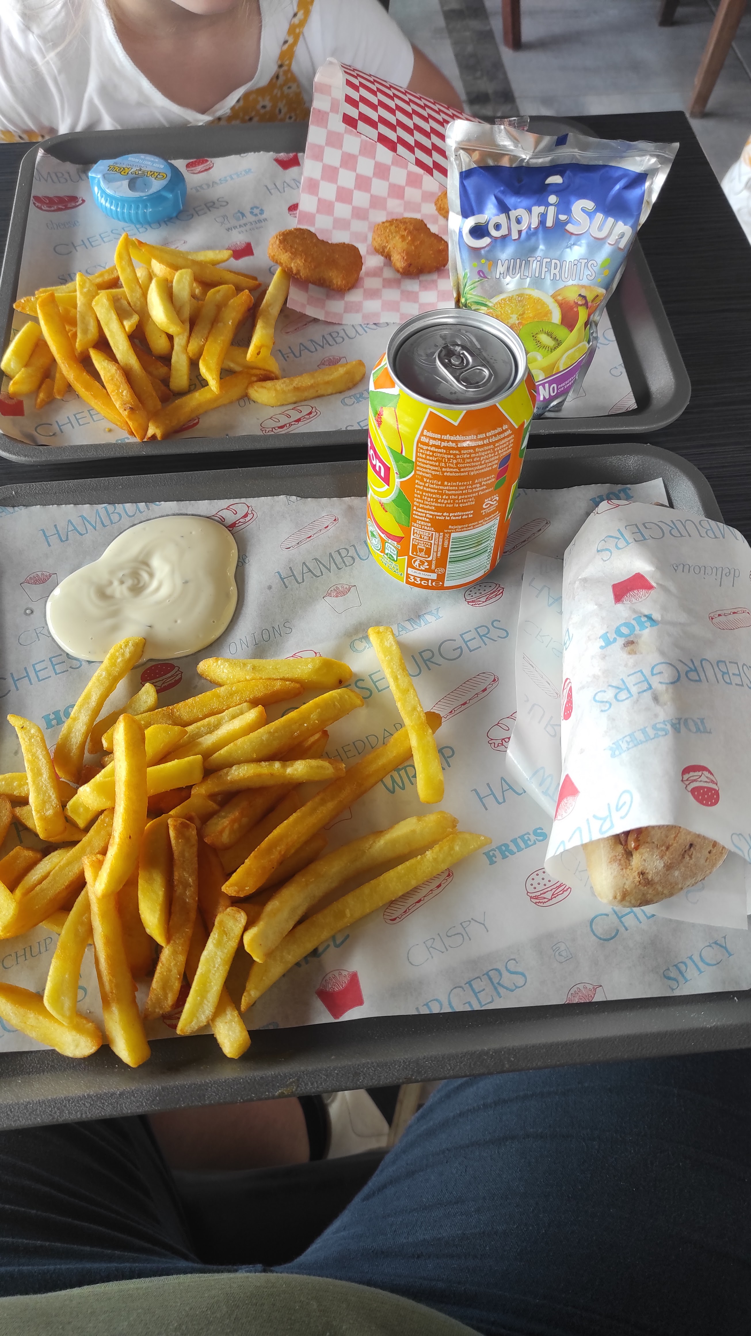 Une équipe très agréable, bonne cuisine et très bon prix 3 burgers, 1 kebab, le tout avec des frites et 3 boissons, 32€