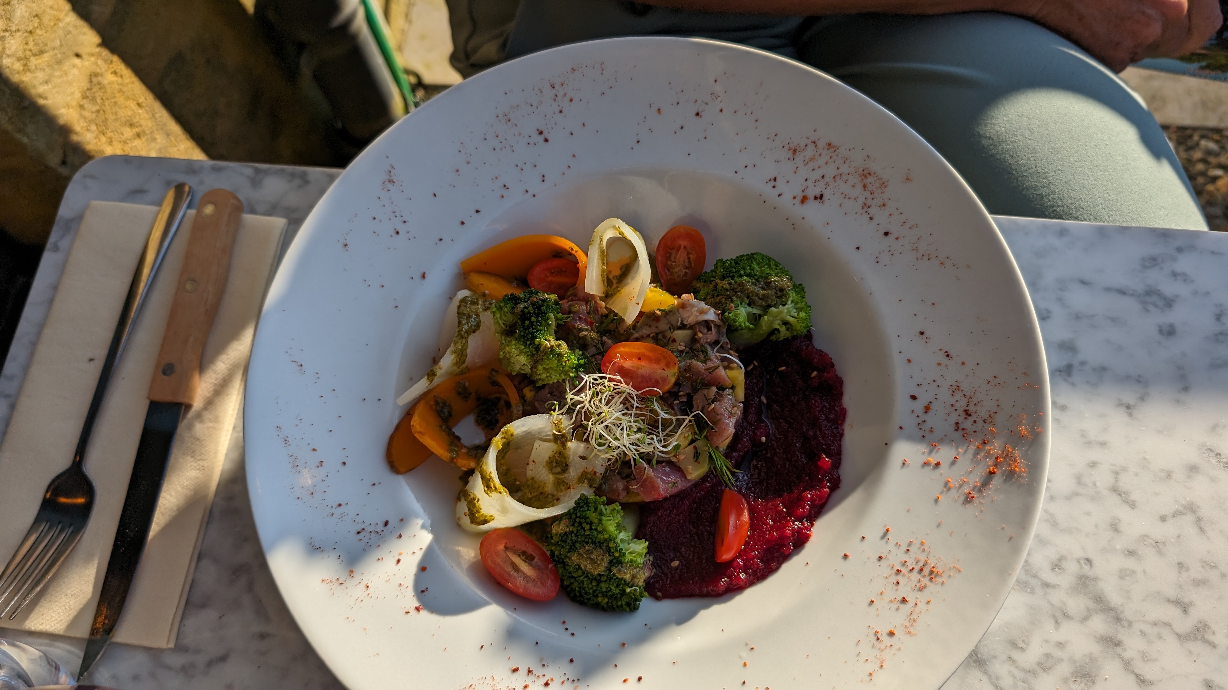 Nous nous sommes fait chouchouter sur la petite terrasse sous le chaud soleil. Le service était très sympathique et attentionné. Les plats joliment présentés ont été servis rapidement et étaient délicieux. C'est bien que l'eau fraîche et fraîche ait été ajoutée sans qu'on le demande.