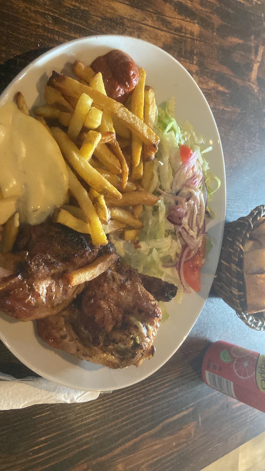 Rien à dire, les plats c'est très bon, j'ai pris 1/2 poulet, mon mari un escalope, c'était une tuerie, les sauces c'est fait maison, qualité prix parfaite. Je recommande à 100%