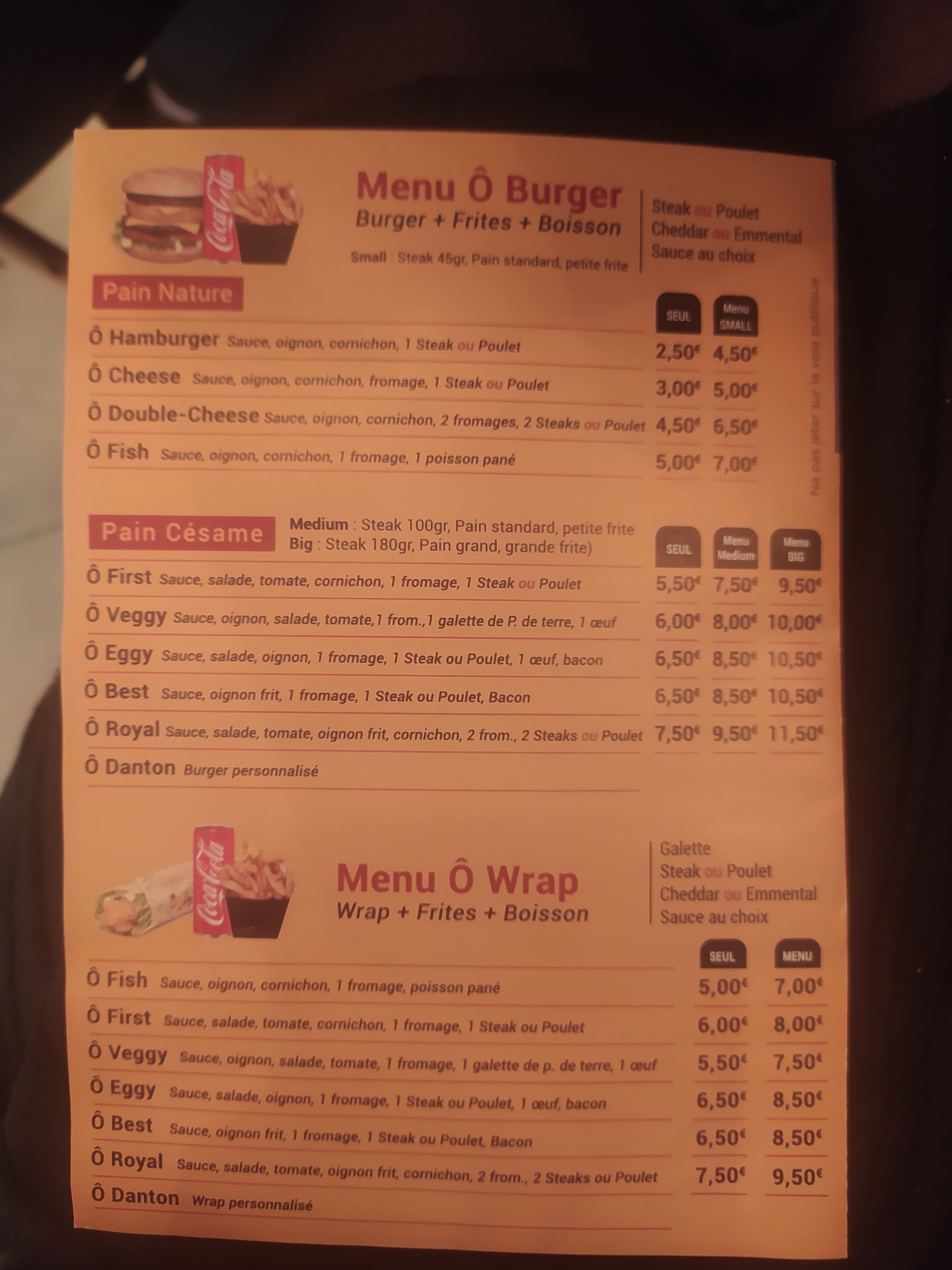 Je suis allé Ô-DAnton pour la 1ère fois il y a qques jours ! Et j'ai pris une commande à emporter (en solo ! ). Ils font les meilleures frites que j'ai eu l'occasion de goûter ! Et il n'ont pas que des frites de 15cm fondantes/cuites comme il se doivent ! SI VOUS PASSEZ DANS LE SECTEUR, VOUS Y TROUVEREZ DES MENUS DONT VOUS VOUS SOUVIENDREZ ! En tout cas, j'y retourne tout de suite pour la Seconde Fois ! Fermeture : 23:30