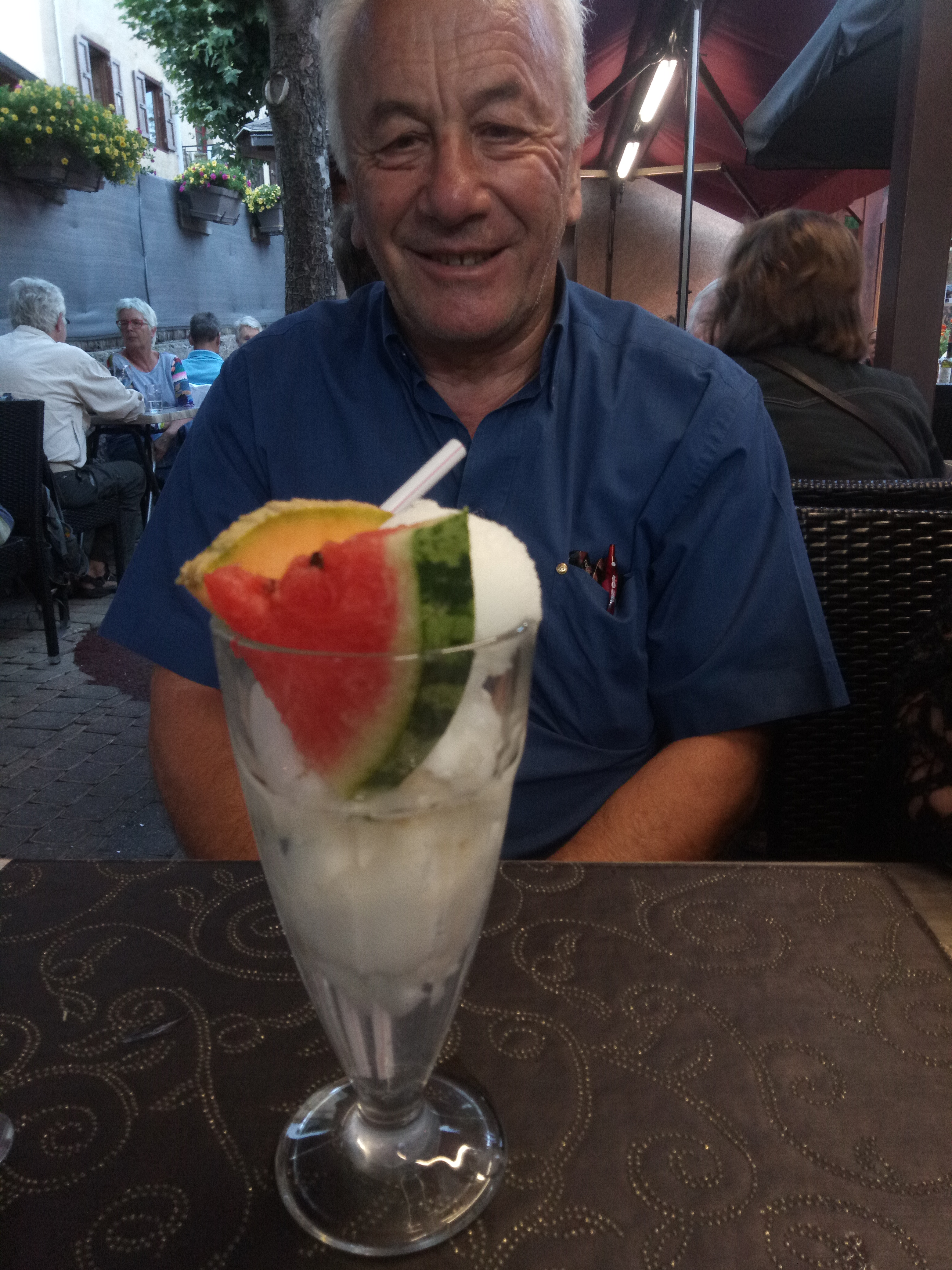 Nous avons commande des assiettes du terroir.bien accueilli,a l'ombre,servi rapidement. Les glaces ont la crème chantilly,trop légère, qui avait fondu par la chaleur. Axe d'amélioration:l'eau gazeuse,qu'ils font eux même,est chère.5.5€ la bouteille,pour un peu de gaz. Je recommande 😉