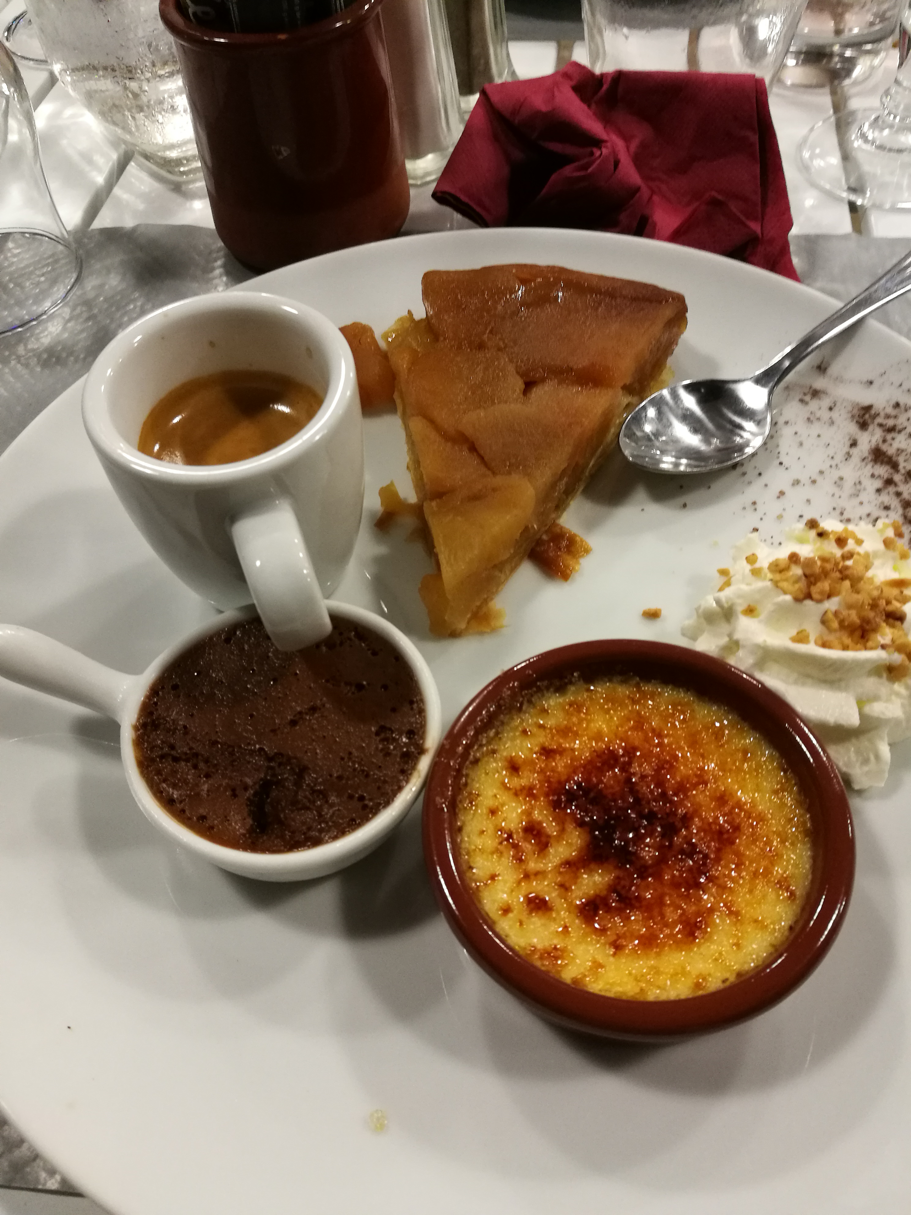 Accueil moyenne, nous avons cherché un serveur pendant 5 minutes car on ne comprenait pas si le local était privatisé (enterrement de vie de jeune fille en cours). La truite était bonne et le burger aussi. Par contre le lieu en rénovation était un peu délabré. Bruyant dans l'ensemble. Café gourmand pas mauvais, la mousse au chocolat et la crème brûle étaient excellents. Café Kimbo.