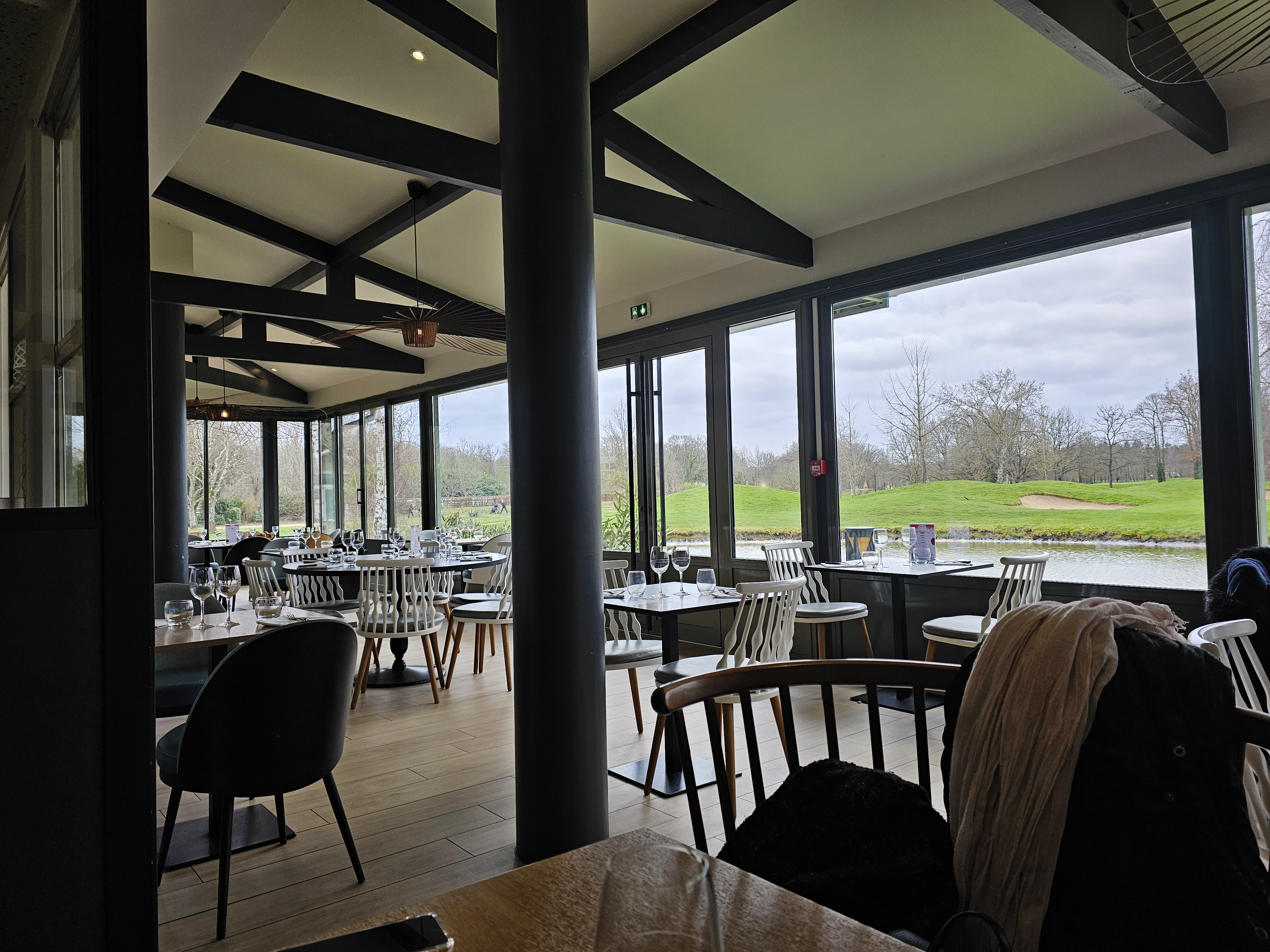 Très belle vue sur le golf.belle décoration moderne intérieure. Attente longue du plat du jour (+30min) ms salle remplie!beau geste commercial et attentionné :on nous propose un verre de vin pr s'excuser de l'attente puis au paiement un café suppl proposé !sinon plat du jour très bon joliment servi et café gourmand à un prix raisonnable. Je reviendrai sans hésiter