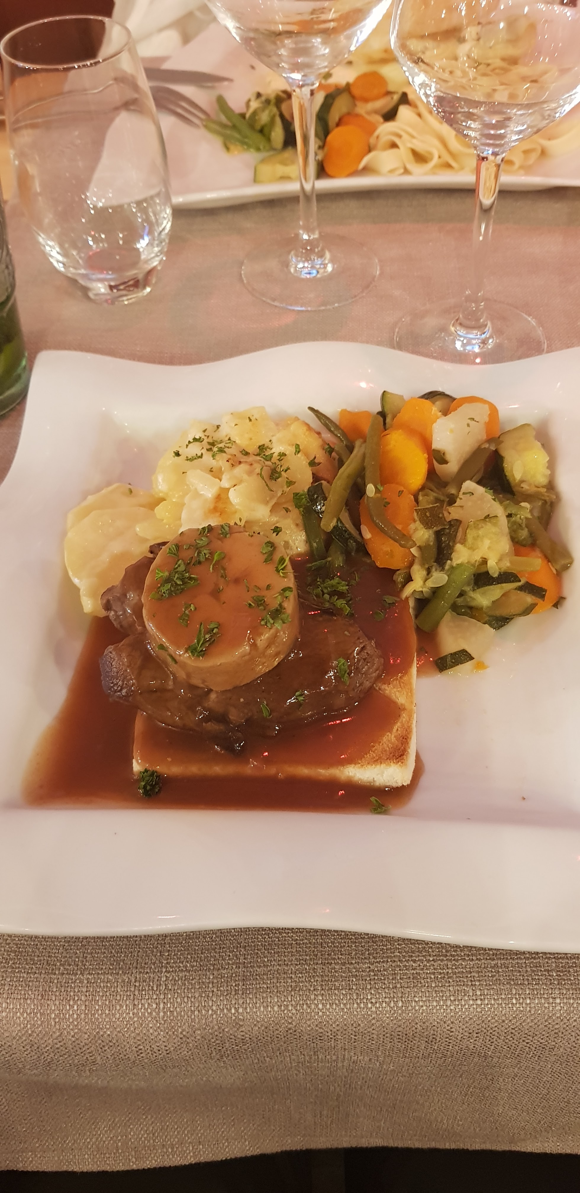 Musique moins forte serai mieux, le repas moyen, moyen. Si on prends la carte, ça va mais le menu, c'est moins bien, bien sûr c'est moins chère. J'avais du gratin dauphinois, une micro part qui était sec, pratiquement pas de crème. Le dessert de ma femme pareil, une cuillère à soupe de crème avec le dessert au chocolat, c'est léger.