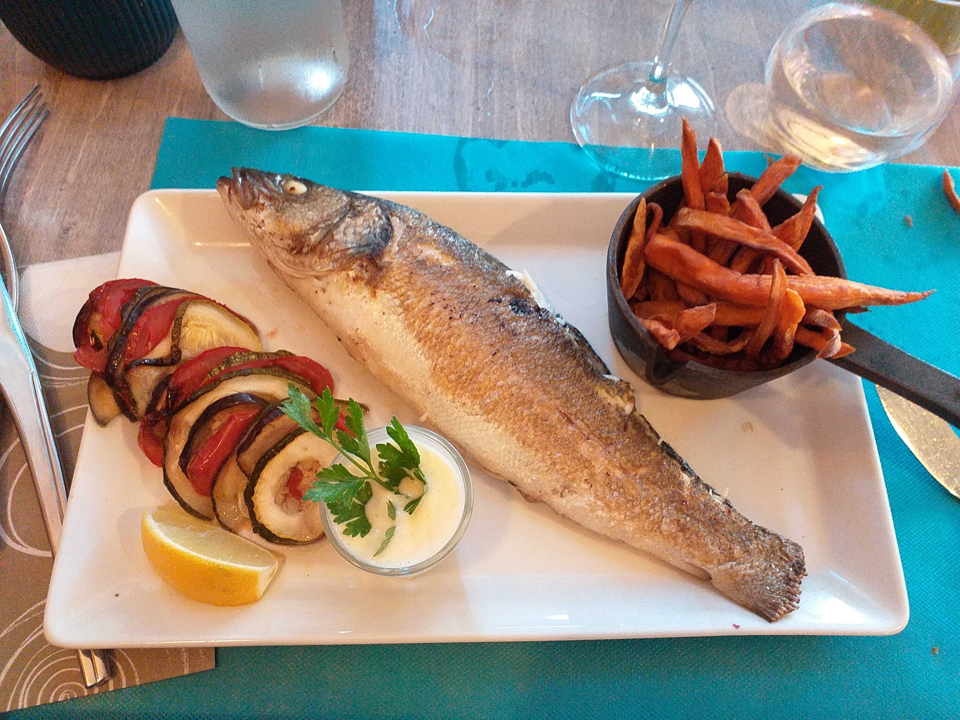 2 déjeuners à la carte Service impeccable et attentif (assez long cependant, arrivées à 13h15, fin du repas 15h) salle et terrasse complètes. Huîtres délicieuses , verre de Bordeaux blanc très bon. Bar entier pour chacune, fade voire sans goût ( nous venions chez vous justement pour le poissons et fruits de mer , étant en bord de mer) accompagnement inadapté frites de patate douce ( des goûts qui ne s'allient pas du tout à notre goût avec le bar), par contre rondelles d'aubergine intercalées avec tomate tout à fait délicieux. Dessert : baba au cognac avec et sans chantilly selon le goût de chacune. Le baba en lui - même rien d'exceptionnel, chantilly trop copieuse, par contre quelle bonne idée d'ajouter au milieu de fines tranches de pomme et d'ananas. Assez déçues par la cuisine du Maitre Restaurateur