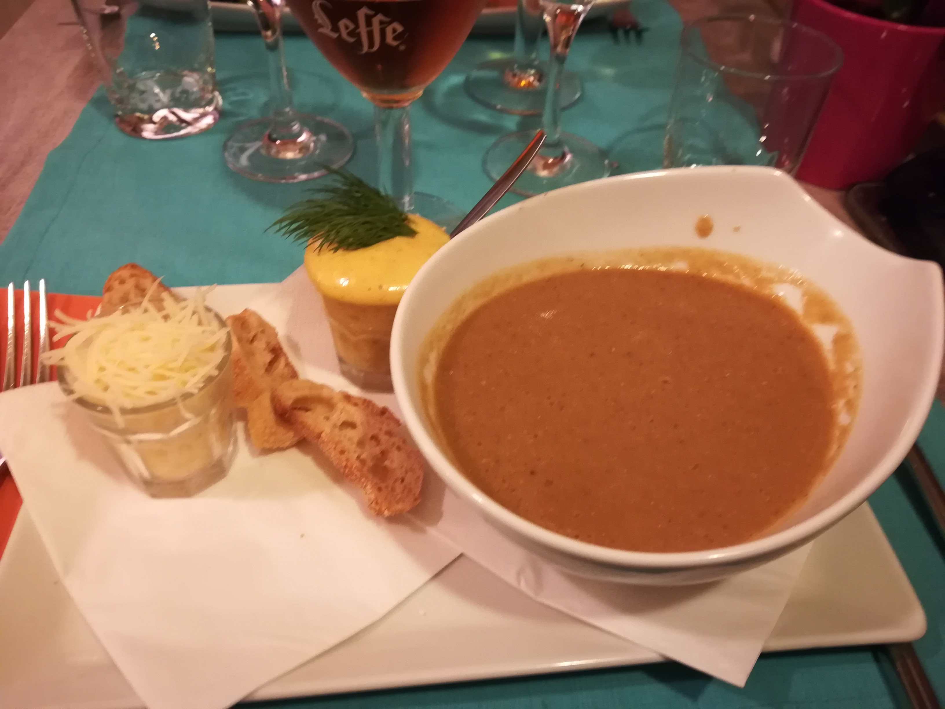 Nous avons emporté. La serveuse avait parfaitement emballé et étiquette. C était très bon. Manquait de vinaigrette. Les cromesquis avec la menthe n était pas à mon goût. Le clafoutis à la nectarine un délice. La soupe de poisson était succulente mais la poelee du pêcheur ensuite était fade.