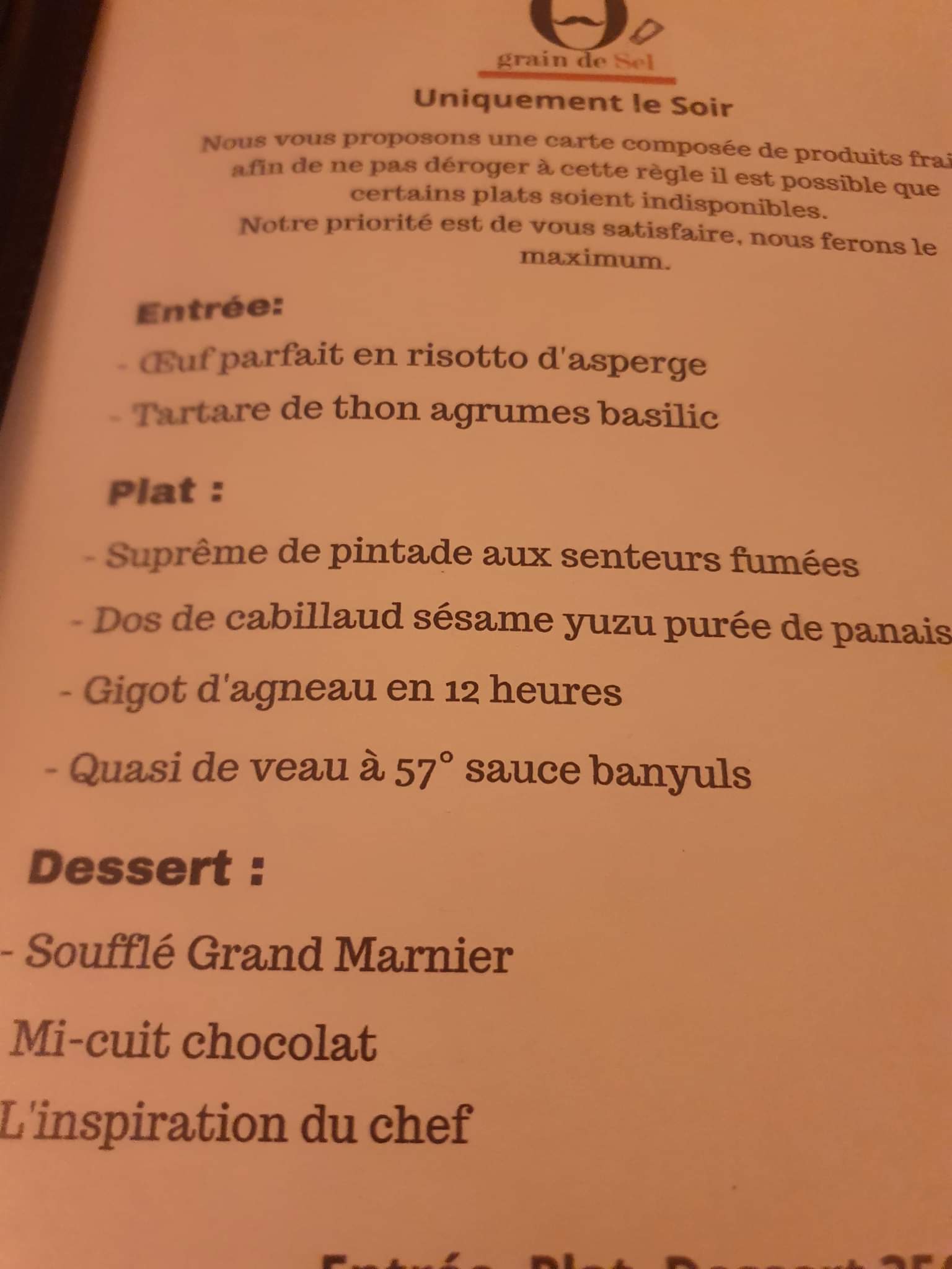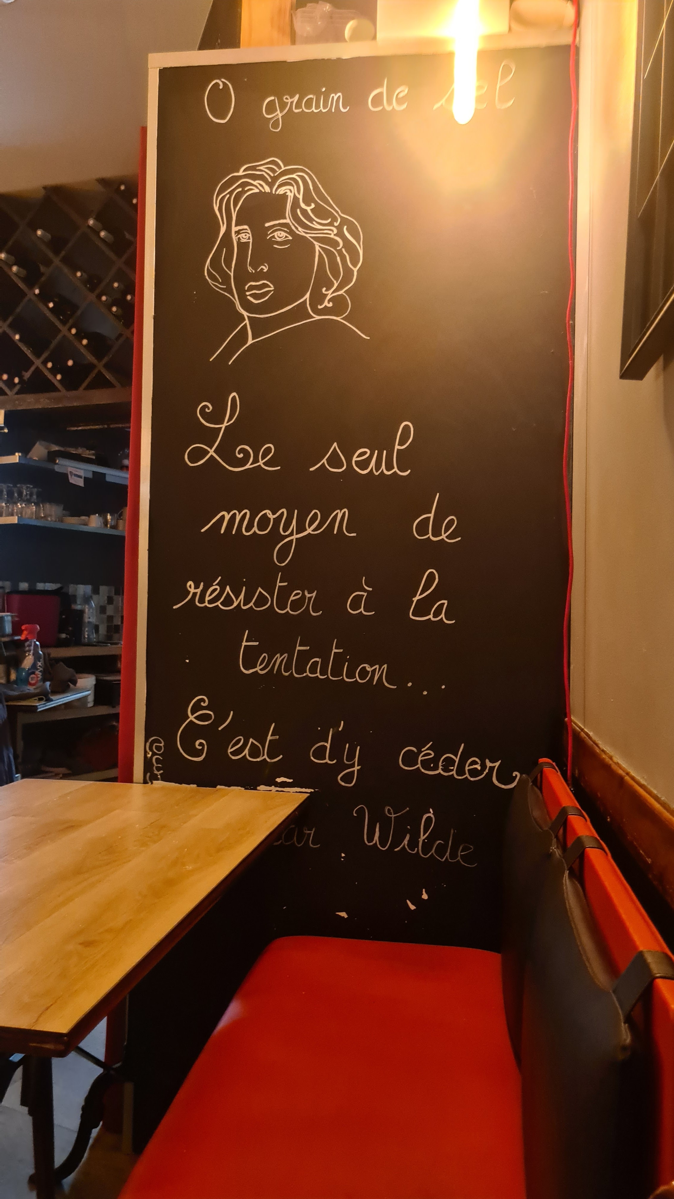 Un accueil très sympathique et des conseils éclairés pr le choix du vin, une carte avec ce qu'il faut de choix pour espérer des produits frais et de qualité, les plats etaient beaux et excellents. J'avais choisi au menu 23€ une entrée avec des crevettes et une mousse de harengs au goût très fin, de la morue avec des petits pois et carottes cuits impeccablement pr exprimer leur saveur et une purée patate douce très bonne, le dessert un mi-cuit léger et succulent. Le service était parfait, attentif et sympathique. Nous reviendrons et cette fois ci directement, sans passer par un autre restau du coin en terrasse ,où ns avons attendu en vain de dressage de la table 20 min avant de partir sans même que le serveur s'en aperçoive... O grain de sel nous a largement consolés.