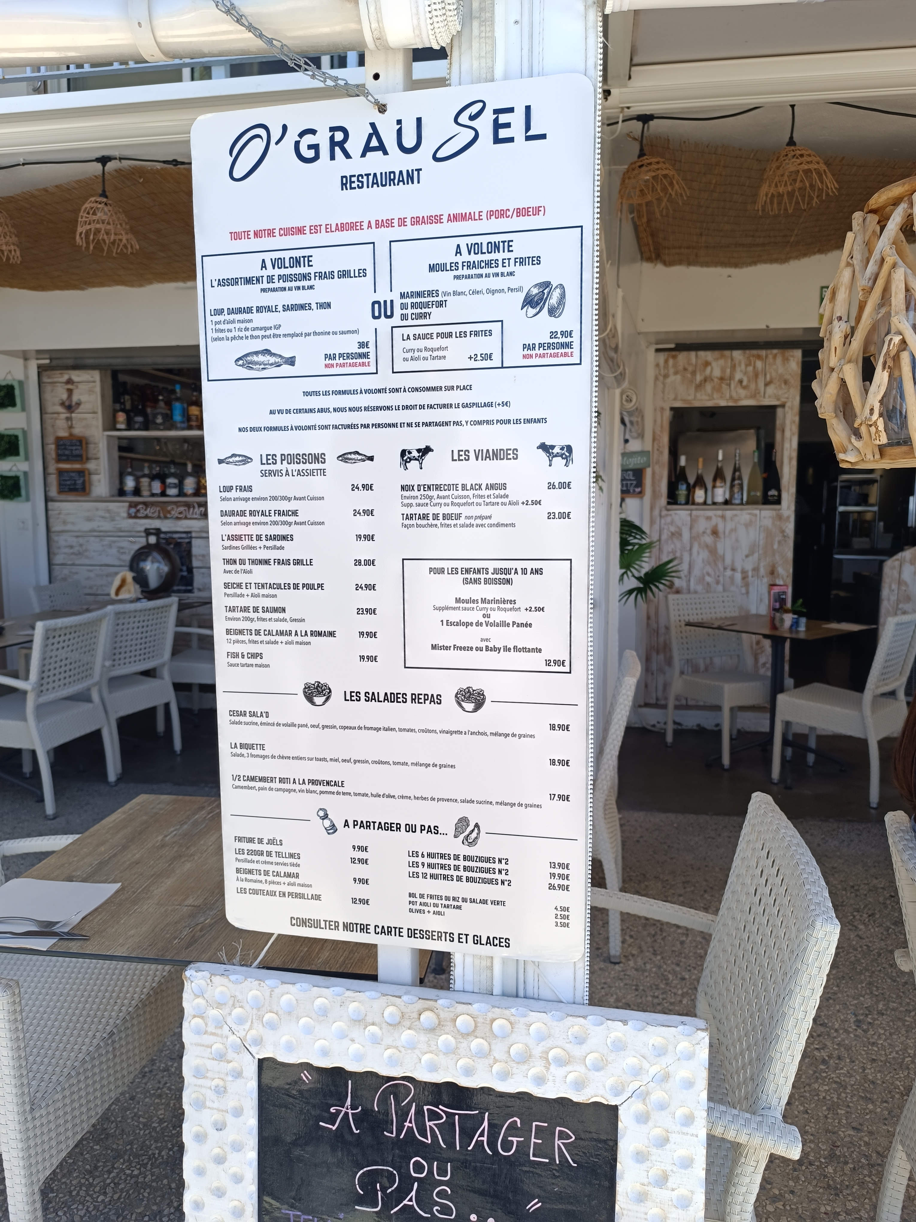 J'ai pris l'habitude de venir O' Grau Sel quand je viens dans ce secteur car la vue est très belle et surtout le poisson est très bon. Je prend toujours la formule à volonté et je ne suis jamais dessus, le poisson est cuit sur grill et les serveurs n'hésitent pas à venir nous voir pour nous demander si on veut en reprendre. La petite sauce aïoli maison est très bonne. O' Top je recommande. Julien