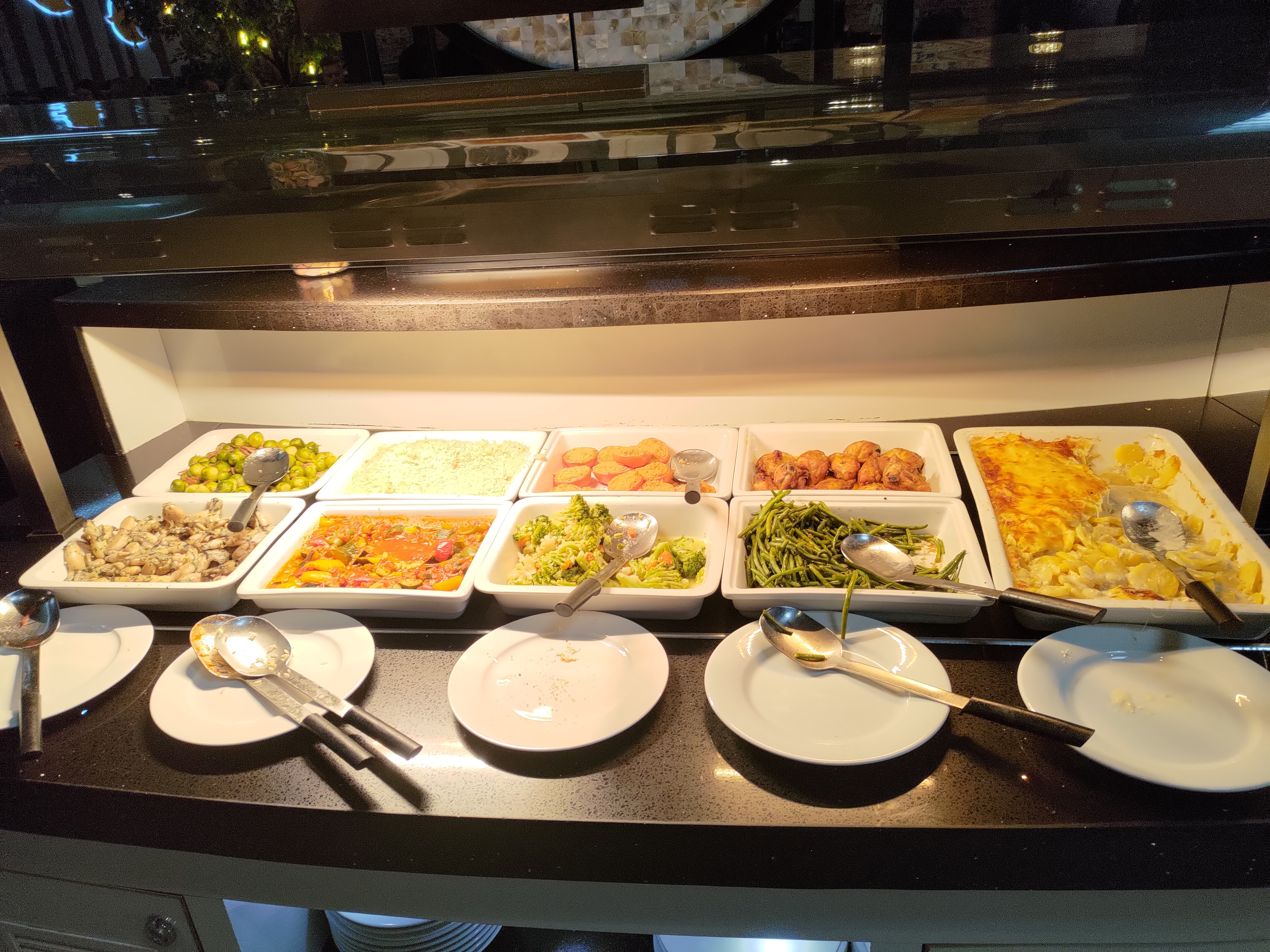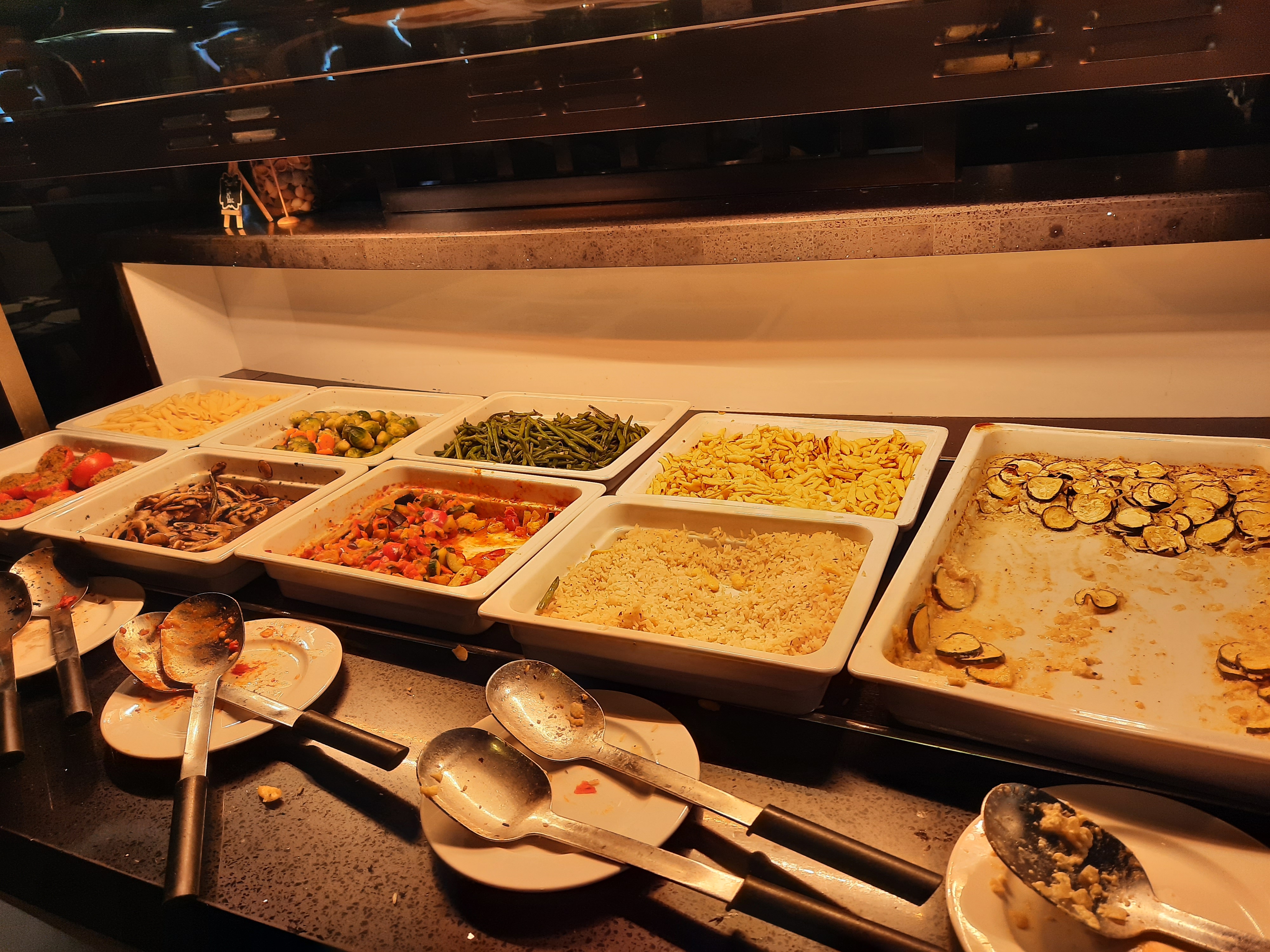 Je suis arrivé à midi exactement quand le restaurant a ouvert. Je me suis servi au buffet, le répas était tiède. Quand j'ai demandé un micro-ondes, ils m'ont dit qu'ils n'en avaient pas. Les serveurs couraient constamment partout et essayaient de prendre les assiettes. de retour, même s'ils n'étaient pas encore terminés, je ne peux pas du tout recommander le restaurant !