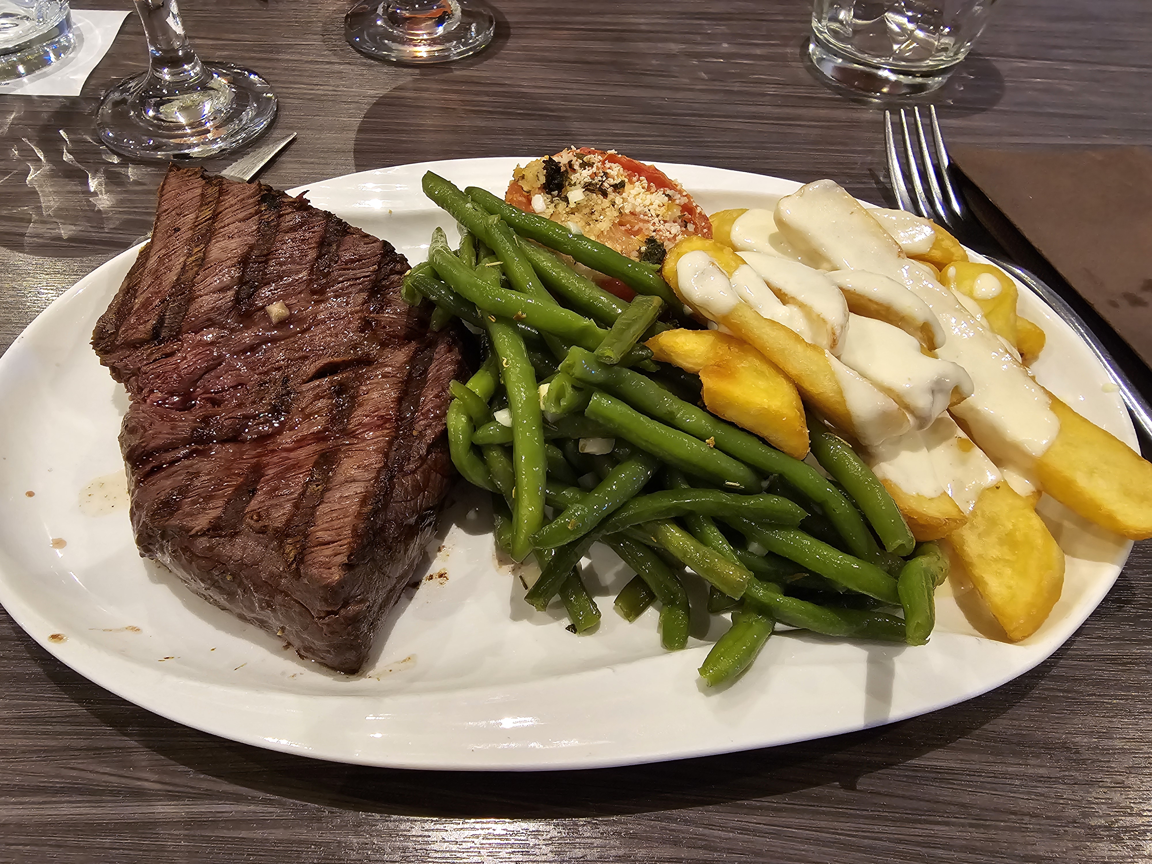 Très bien mangé en déjeuner j'ai pris 2 viandes très bonne et bien cuite, les frites sont très bien aussi. Les entrées sont variées et bonnes par contre les desserts hormis les fromages ou la mousse au chocolat sont pas terribles. Bref un expérience que je renouvellerai et je recommande à midi entre collègues.