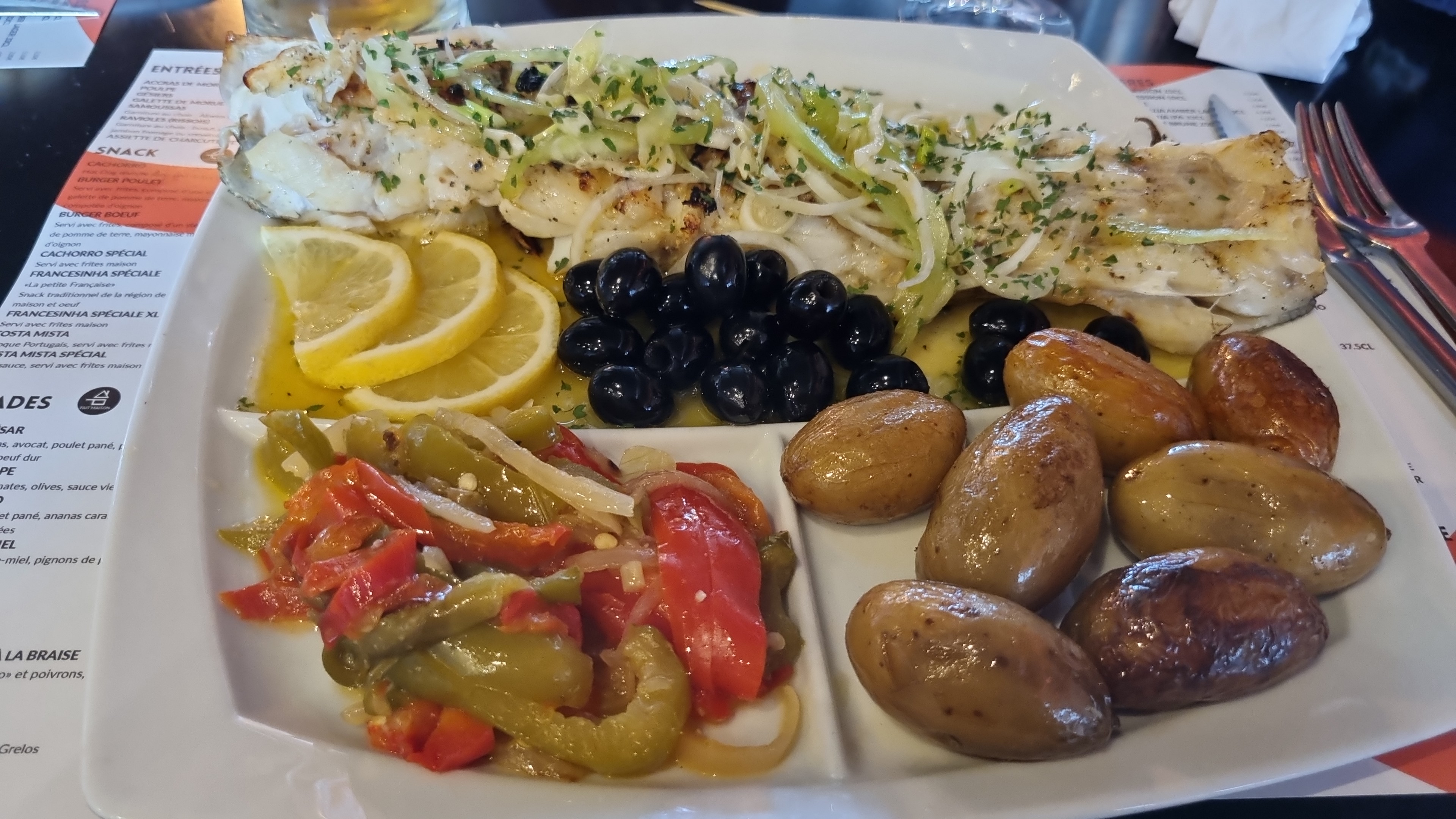 Assiette de Morue grillée délicieuse, dommage d'être un peu gênée par la musique (trop forte)....