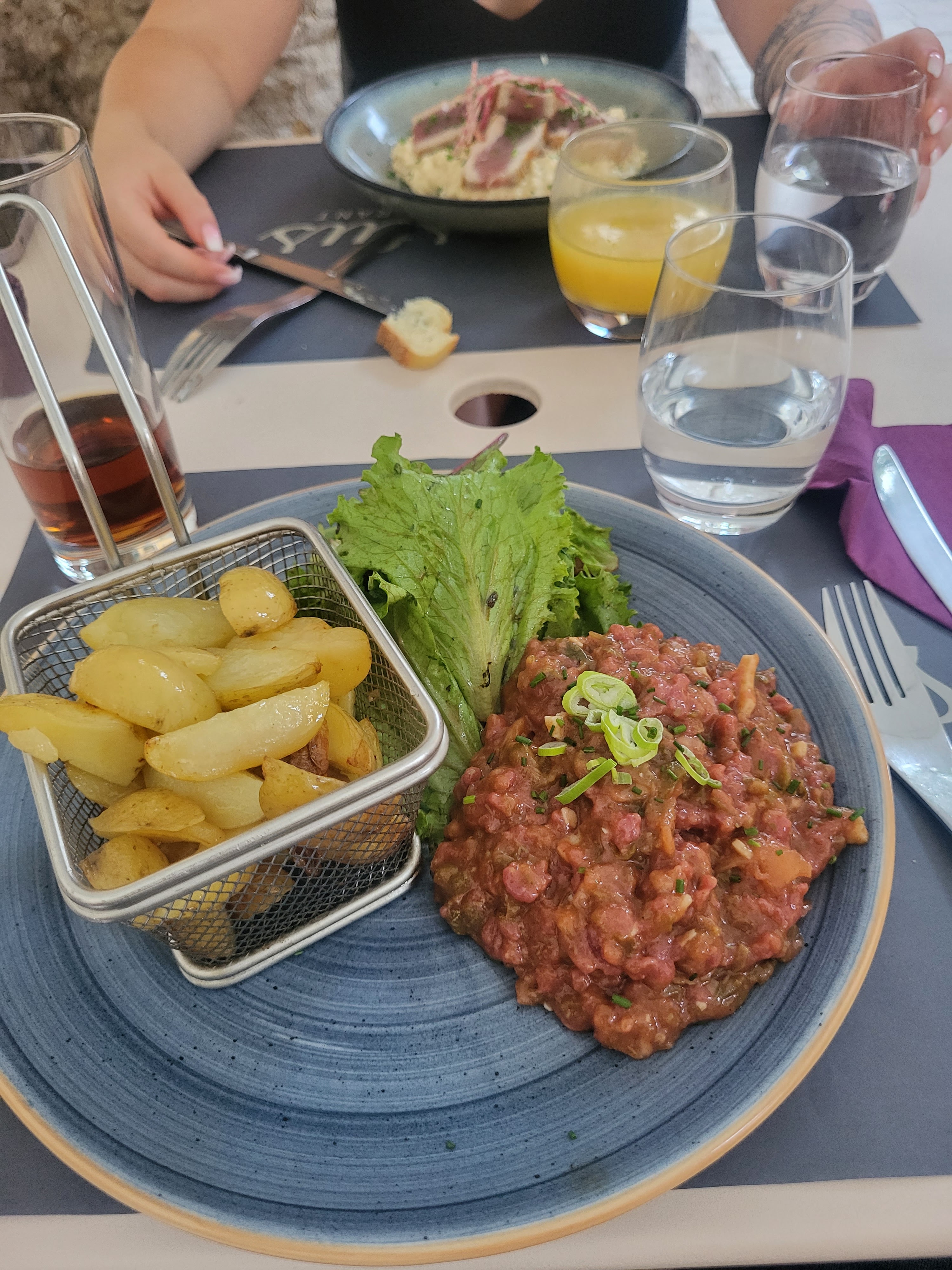 Quel petit bijou de restaurant ! Nous étions assis sans réservation, le service était le plus sympathique qui soit. Je recommande vivement le tartare de bœuf accompagné d'un délicieux verre de vin rosé local, suivi du café gourmand. Les prix sont même bas par rapport à la haute qualité de la nourriture !