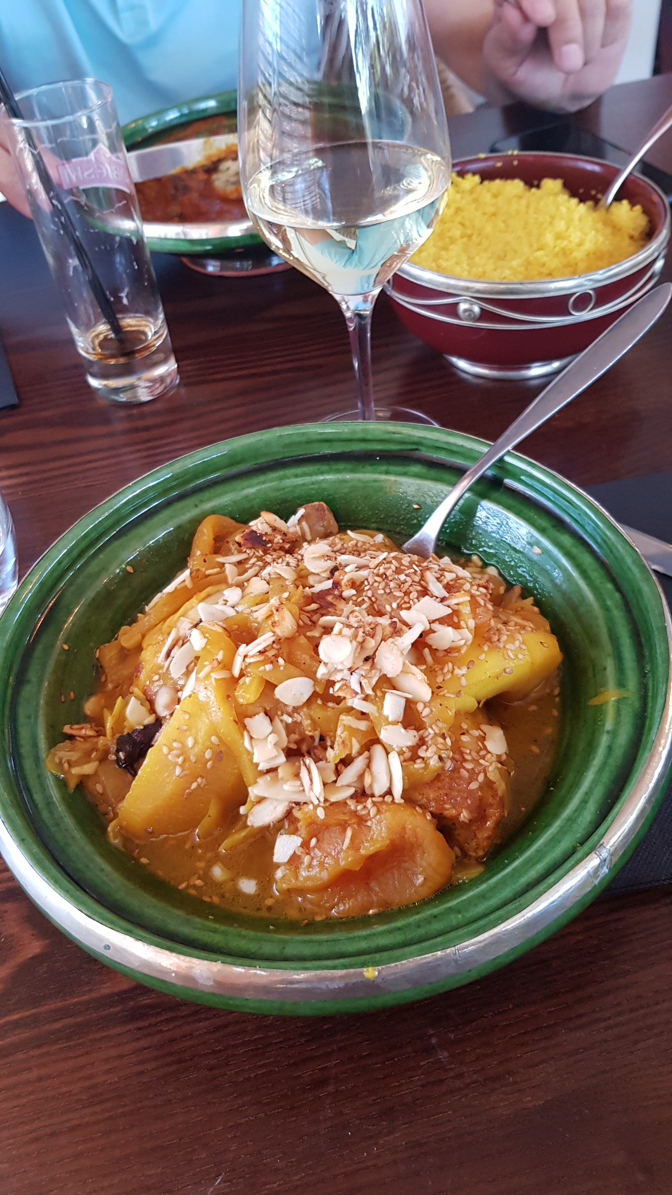 Accueil chaleureux. Nous avions réservé pour 4 adultes et 1 enfant qui a eu son assiette servie pendant que nous prenions l'apéritif ; attention très appréciable. Très bons plats que se soit tajine ou couscous avec une addition normale de 160 euros pour 5 : apero, plat, vin, thé, menu enfant.