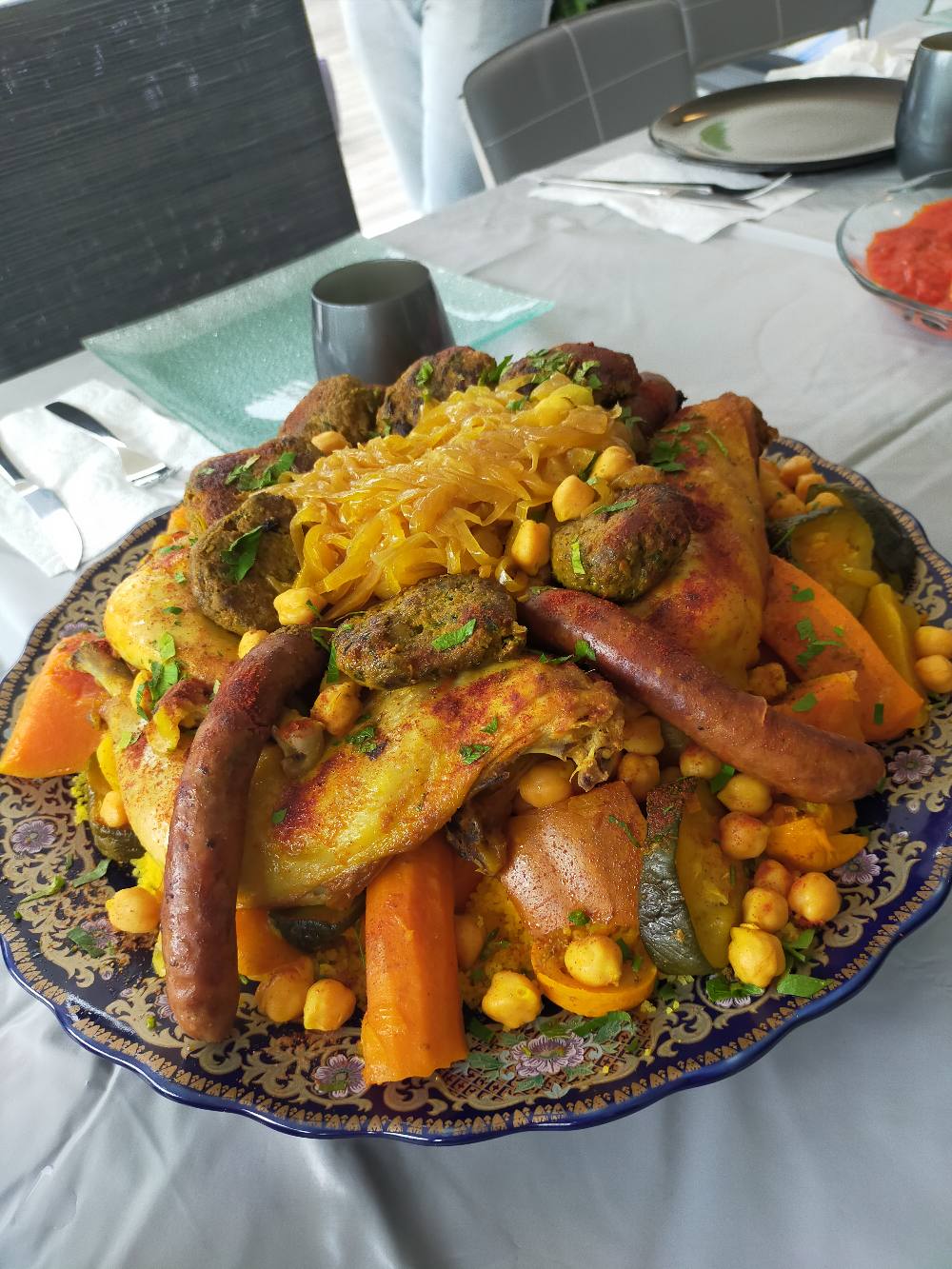 Accueil chaleux et qualité de service vraiment irréprochable, (Nous allons régulièrement au restaurant et je trouve ça de plus en plus rare). Repas TRÉS copieux et vraiment très bon. Les légumes de mon couscous été vraiment excellent. Je salut le fais de proposer des doggy bag ce qui évite le gaspillage inutile et cela fais moins mal au cœur lorsqu'on paye l'addition 😅. De plus le lieux est chaleureux et joliment décorer. Aller petit détail degatif, c'est dommage de faire payer en supplément le confit d'oignon alors que c'est la base avec un couscous et que le prix de celui ci le justifirais amplement