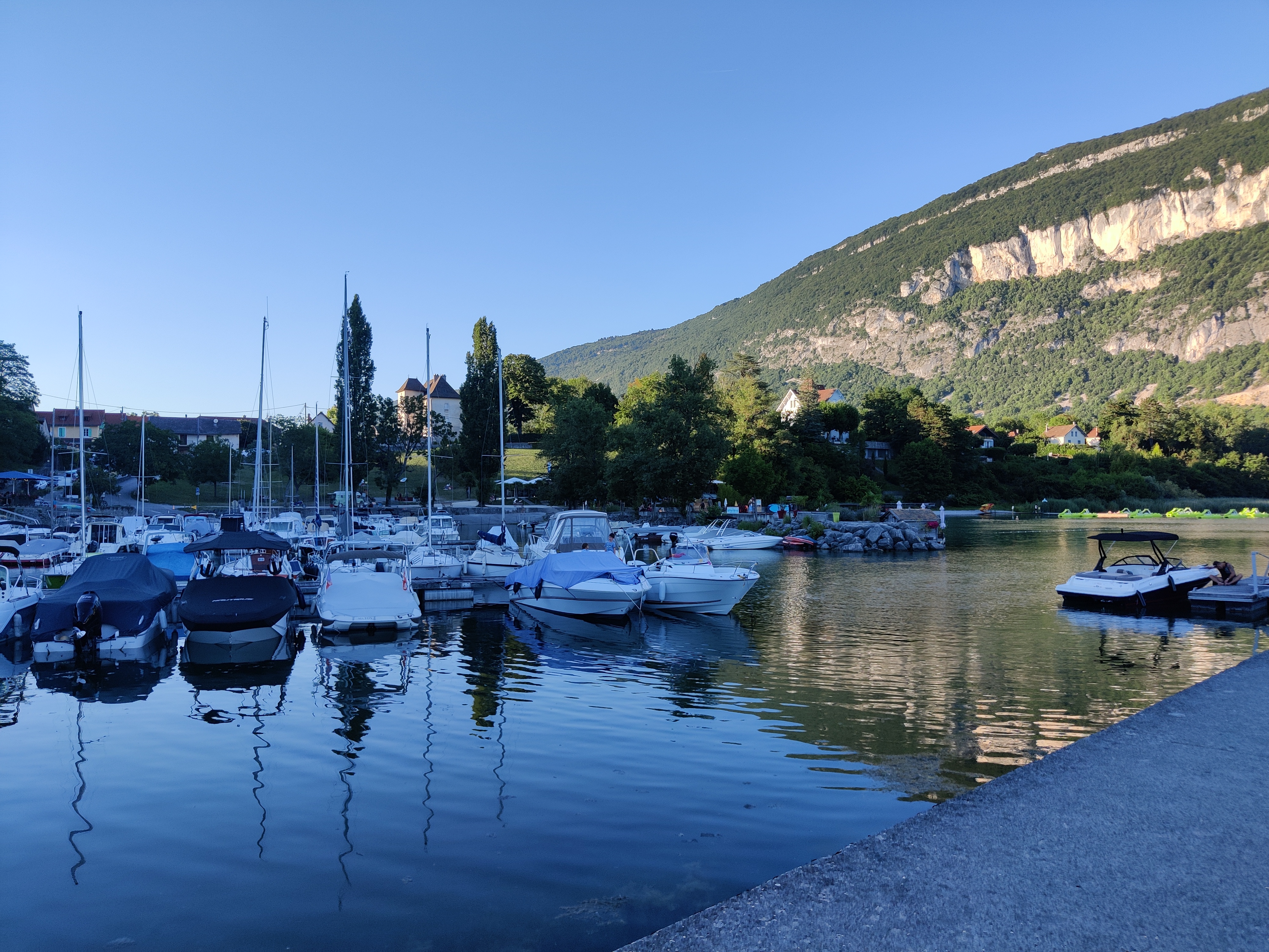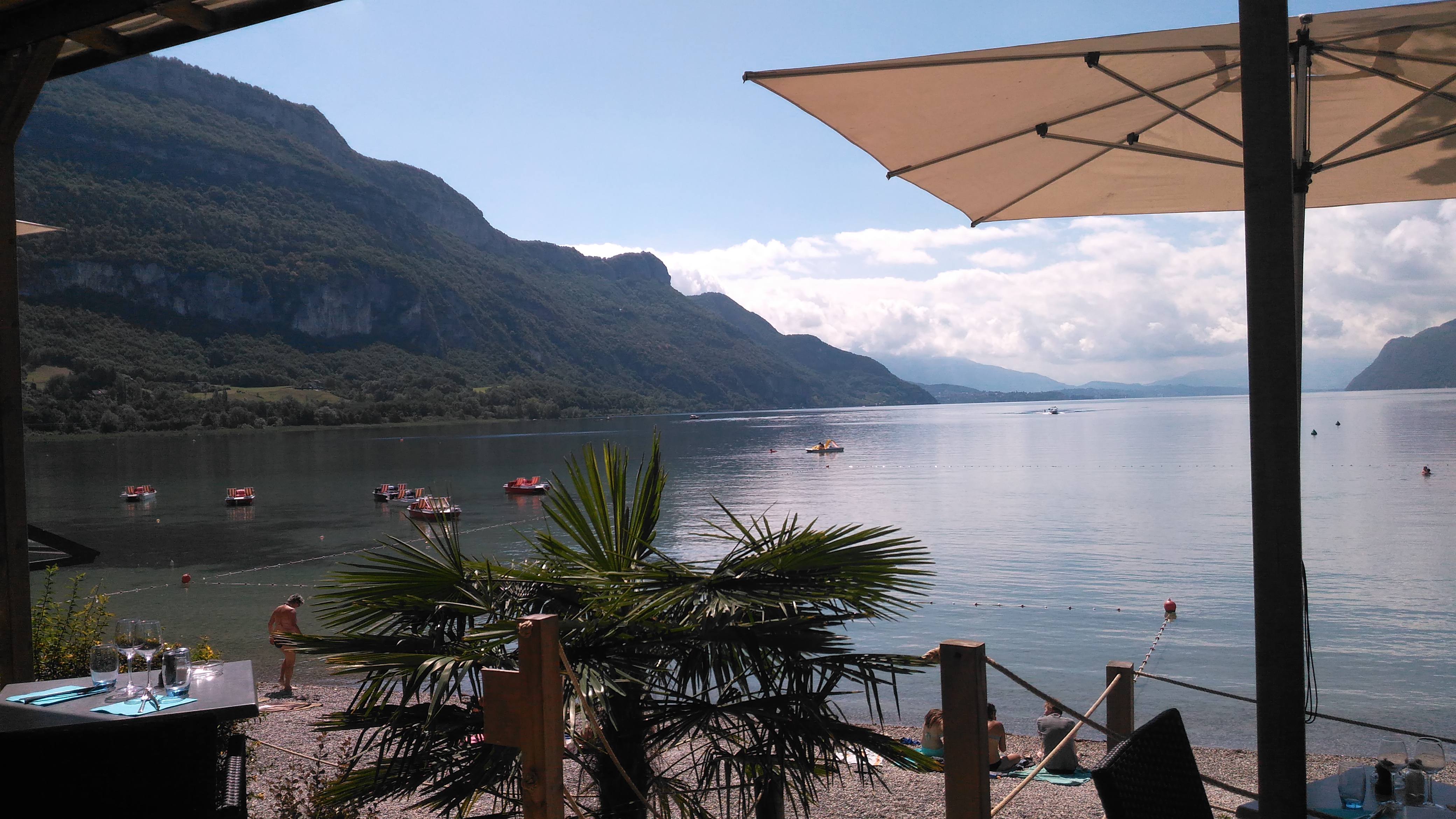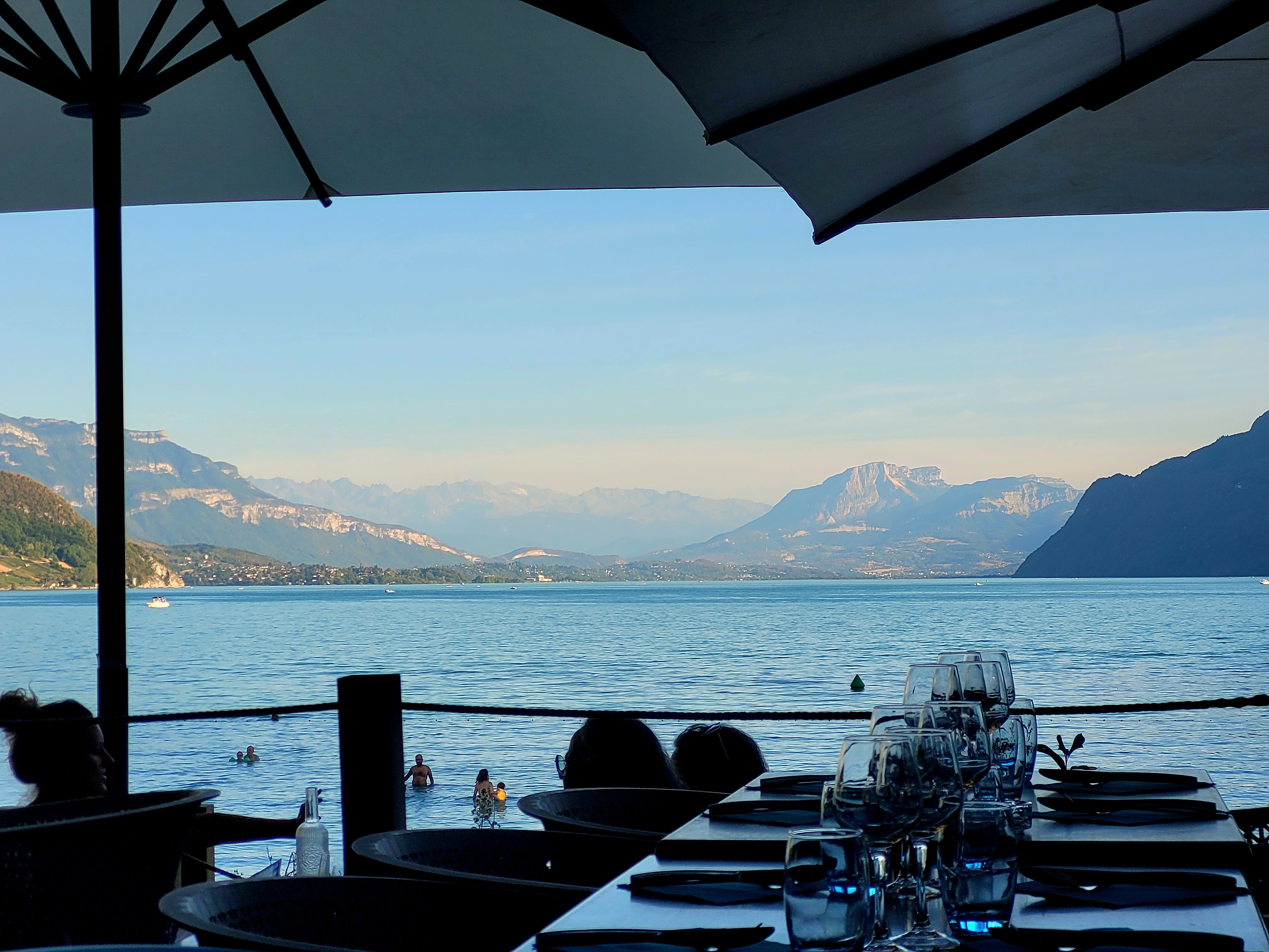Une impression de vacances à la mer. Situé au bout du lac, terrasse en gradin, vue sur lac, ombragée avec brumisateur. Plats de bon niveau et carte des vins de prix raisonnable, beaucoup de vin de chautagne ou de jongieux. Incontournable. Prudent de réserver.