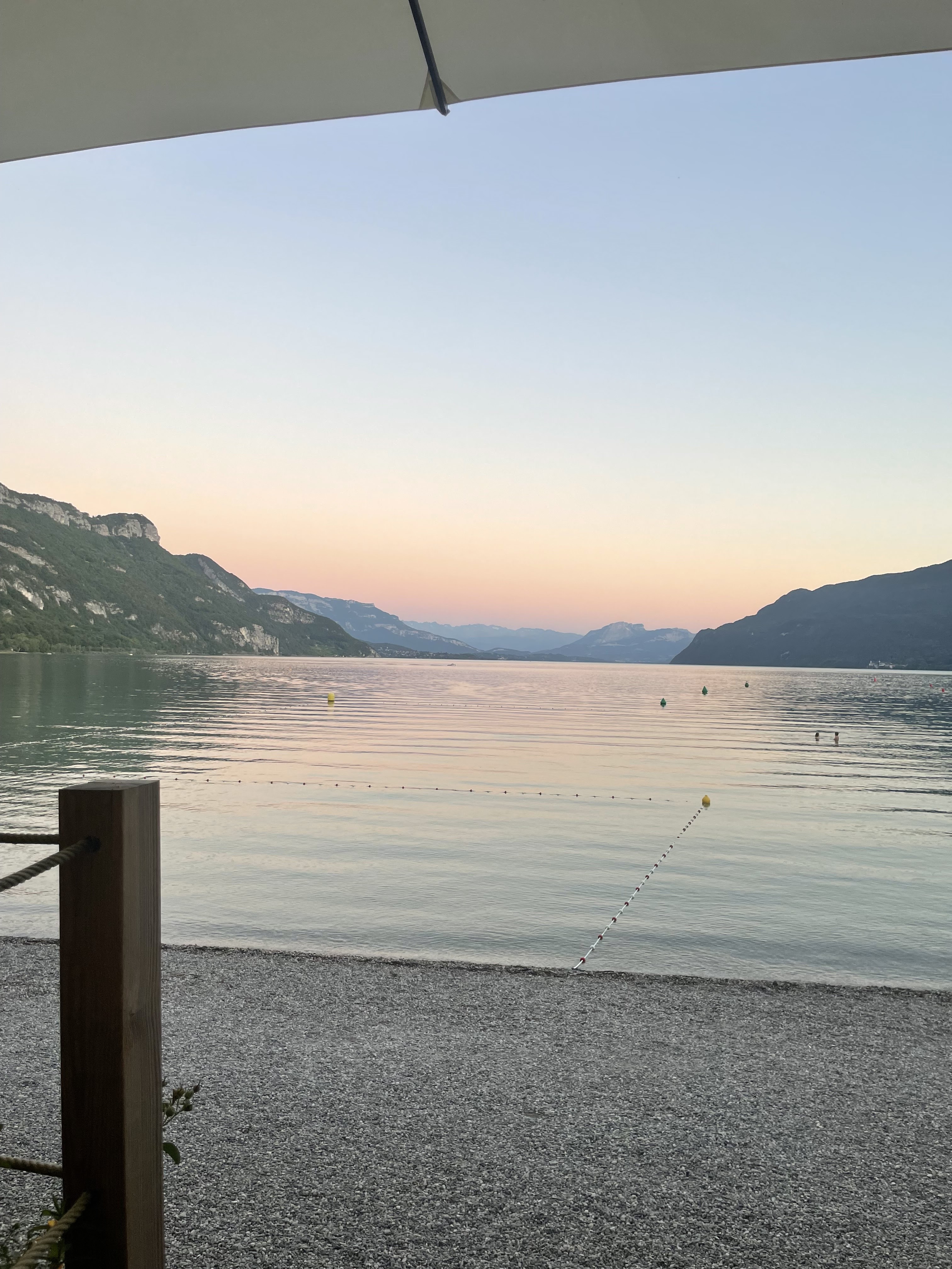 Accueil : Chaleureux mais pas très aimable : nous sommes arrivés vers 19h30 sans réservation et souhaitions boire un verre. Cadre : Belle vue plein sud sur le lac mais terrasse bruyante (et pire si du monde sur la plage en contrebas). La présence de brumisateurs d'eau (certes, agréable) est questionnable rapport à la crise environnementale dans laquelle nous nous trouvons. Service : Serveuse agréable et connaissant bien la carte donc de bon conseil. En revanche, le patron avait un comportement aigri/peu aimable, et montrait clairement son désarroi quand nous avons ensuite demandé si nous pouvions prendre des planches à partager (le genre de mec qui vous tend la carte sans même vous regarder). Cuisine 2022 : Bonne. Les ris de veau étaient bien cuits et le burger bon. Le tartare de betteraves n'était cependant pas exceptionnel. Cuisine 2023 : La soupe froide n'était pas très bonne mais les légumes rôtis, ben que simples, étaient corrects.